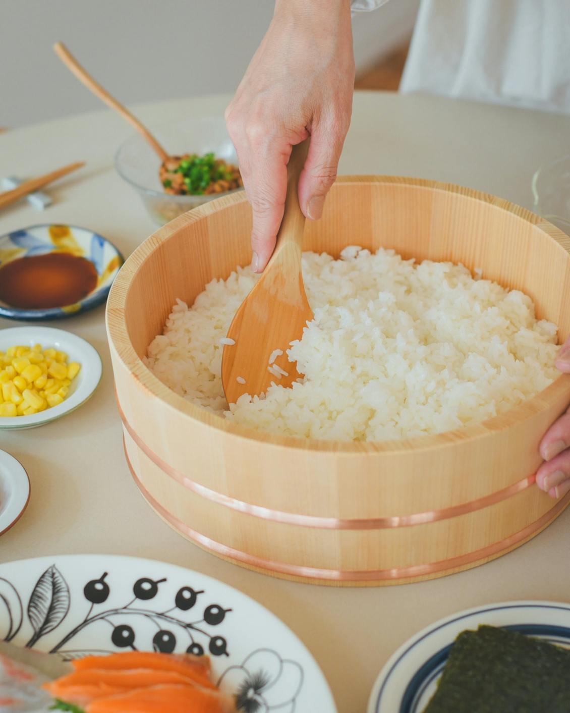 飯台の木曽椹は、お米に含まれる水分を適度に吸収・放湿してくれるので、お酢を混ぜても水分過多にならず、もっちりとした仕上がりに。