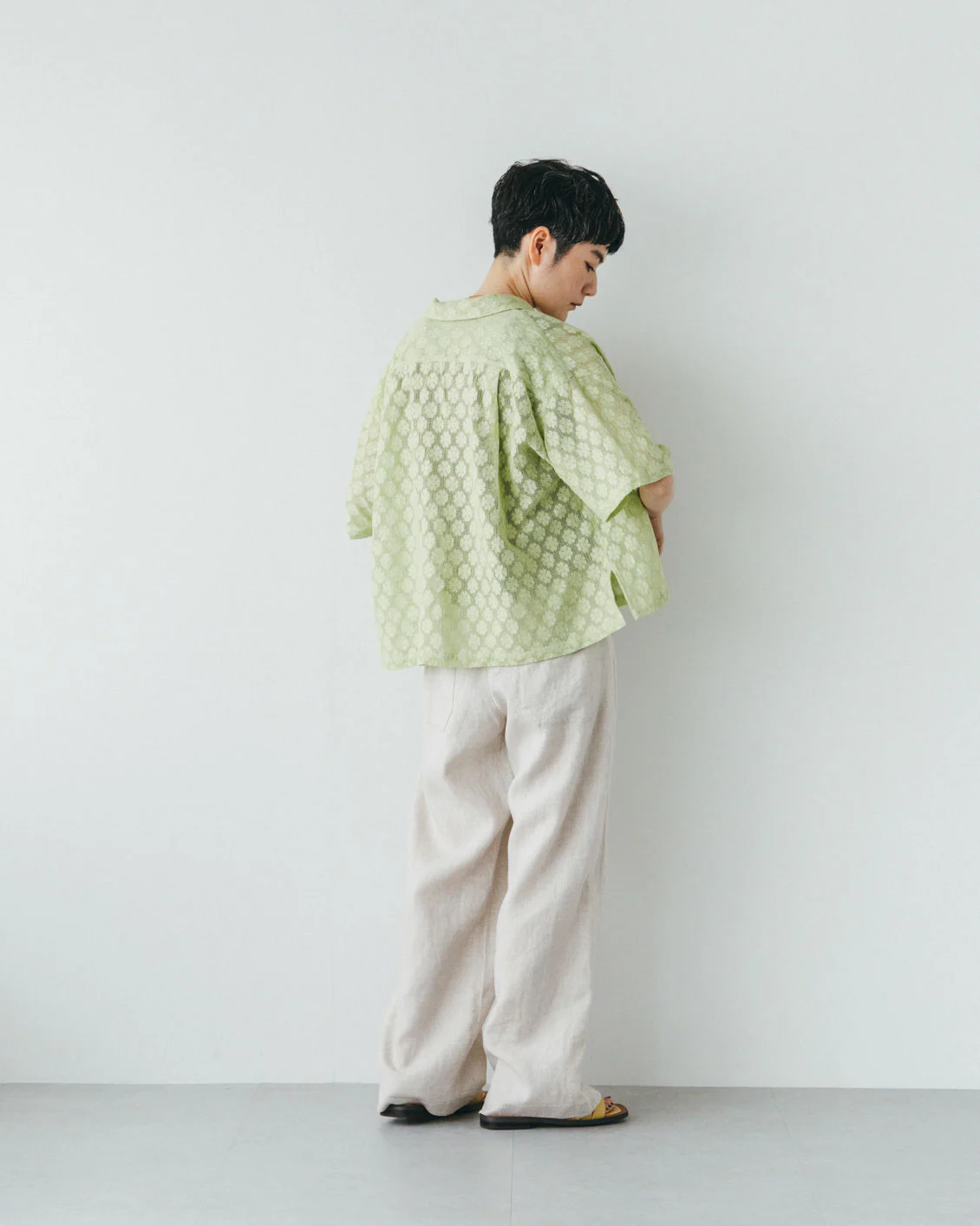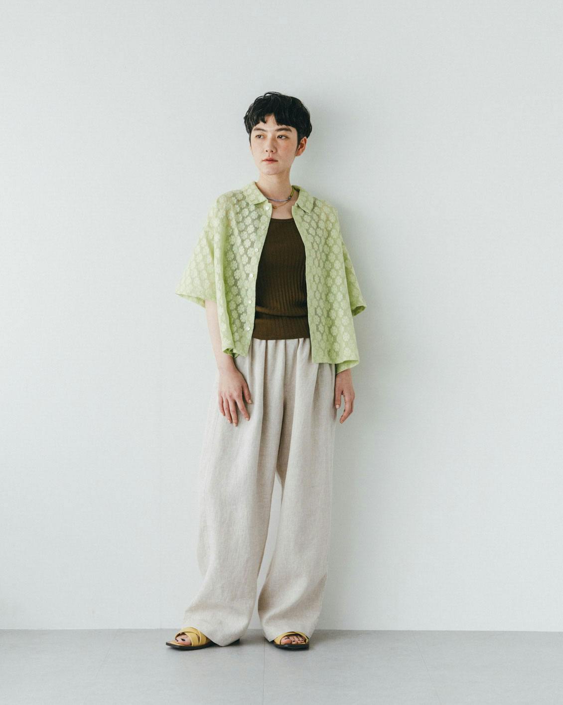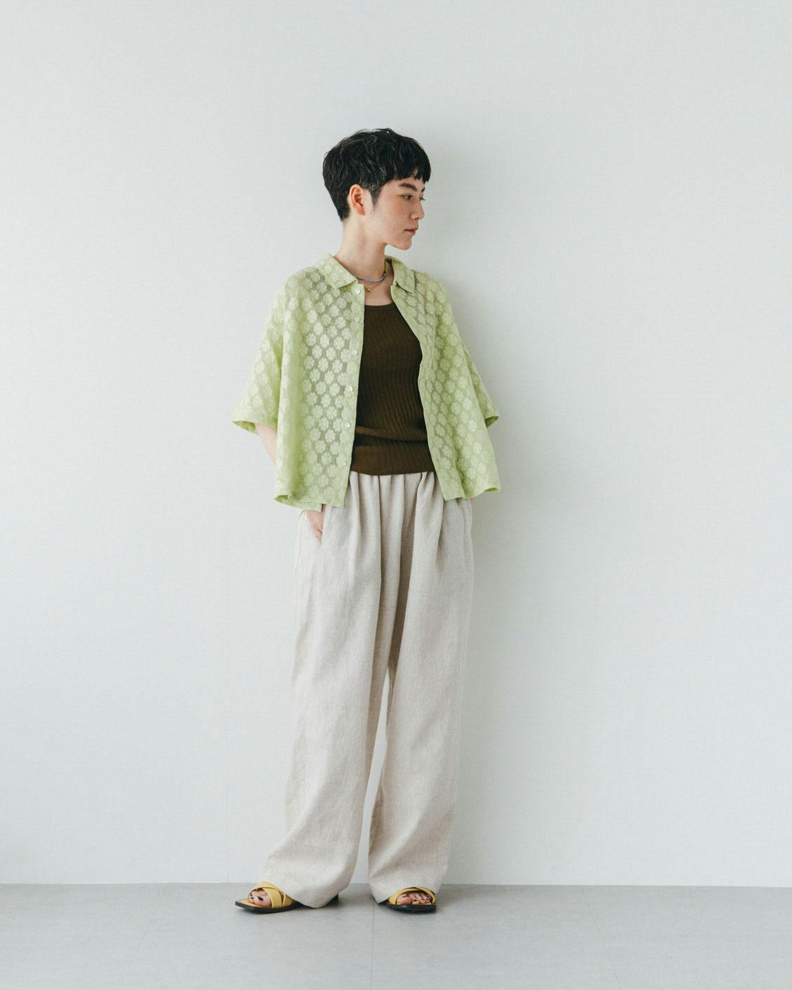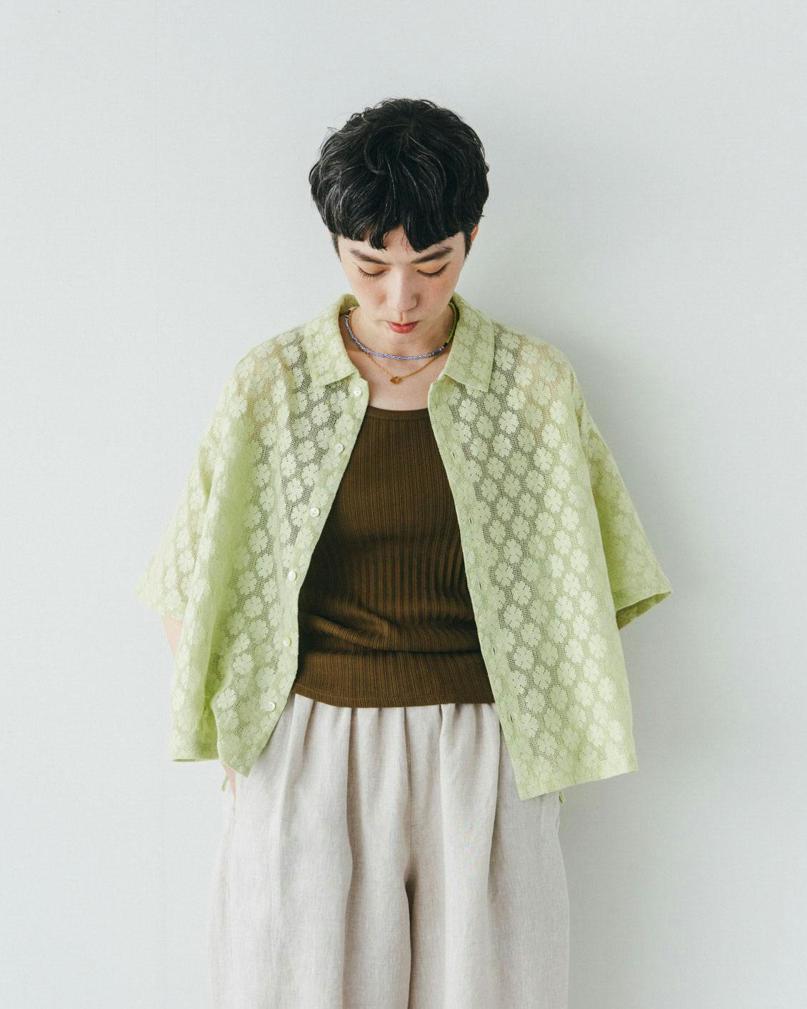 リラックス感のあるゆったりさですが、なんだか上品。華やかな総レースに、クリーンな衿つきシャツという絶妙バランス。