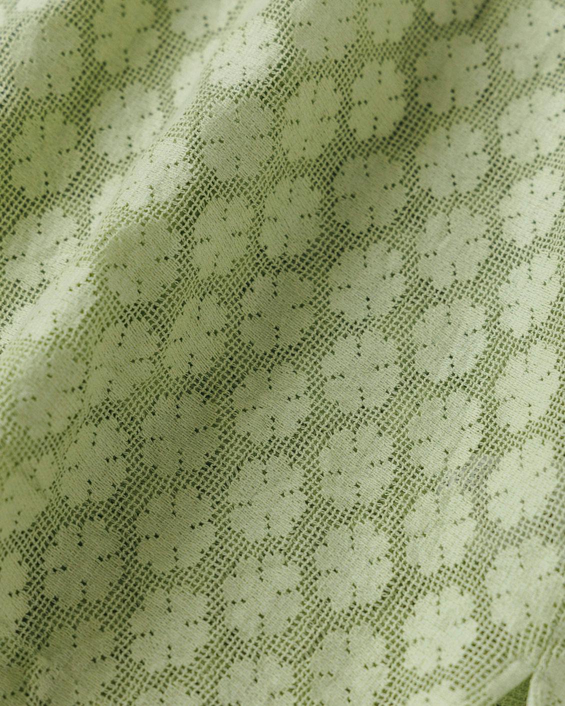 よく眺めると、クローバーのような柄が散りばめられたレースは、抜け感があり、甘すぎないカジュアルな雰囲気。規則的な配置からか、幾何学模様のようなデザイン性が感じられ、着るだけで一気にこなれた印象を醸します。