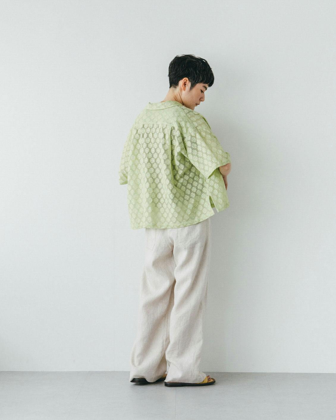 インドの伝統技法ならではの、くったりと柔らかな風合い。これが素肌に心地よく、Tシャツのような気楽さで、レースのシャツだということをつい忘れてしまう。身体に纏わり付かず、風が抜ける涼やかさは、蒸し暑い日にもぴったり。