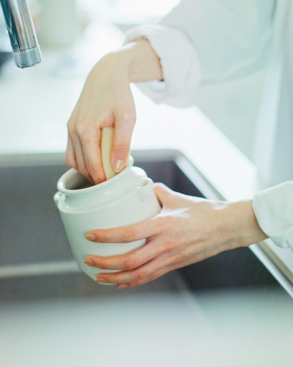 口径は、中に手を入れて洗うことができる大きさ。つるんとした質感なので油汚れも落としやすく、お手入れが楽にできます。