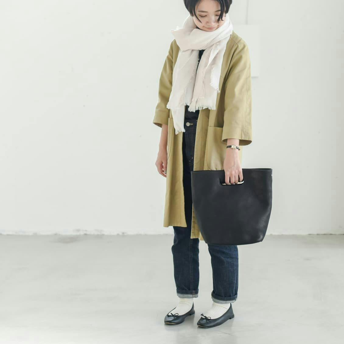 余計な装飾のないバケツ型のフォルムのバッグ。シンプルな佇まいながら、ころんとした丸みもあり、ほどよく女性らしい雰囲気が漂うのも素敵なポイントです。