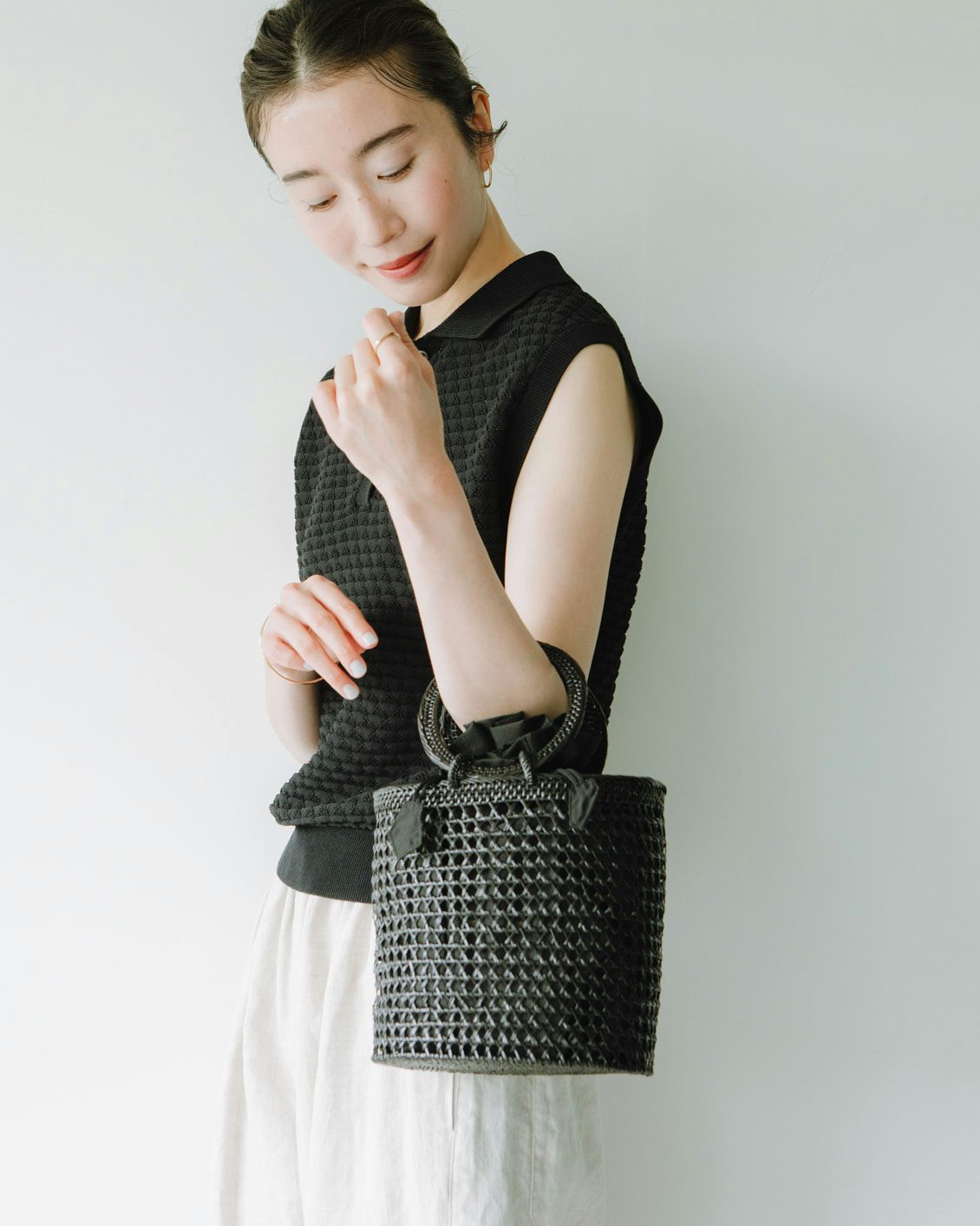 カゴバッグを一つ、コーディネートに加えるだけで、シンプルな装いも品よくまとまります。