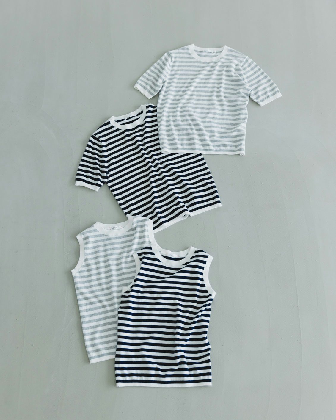 上質な定番服を作り続けるブランドならではのアドバイスのもと、ボーダーピッチからこだわり、上質なサマーニット素材を採用。