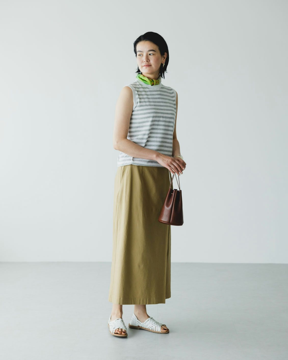 腕が出る分、首元はほどよく詰めて肌の見え具合にメリハリをつけました。