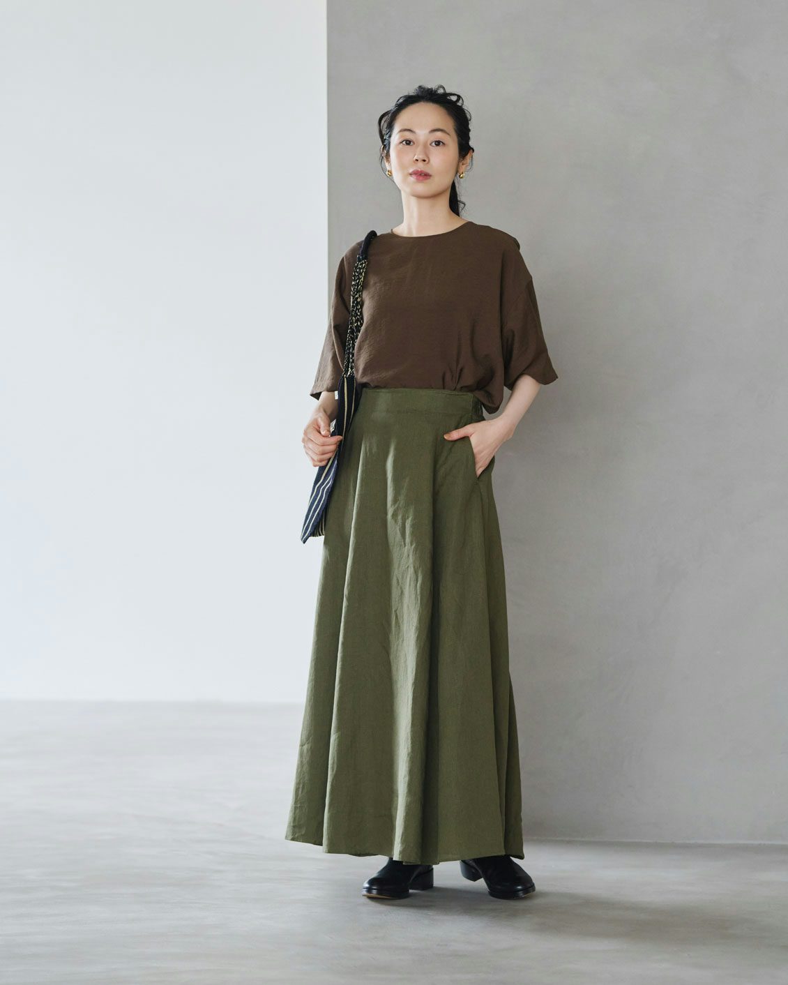 程よいツヤ感やとろっとした落ち感は、レーヨンナイロンならでは。そこにリネンが加わることで、カジュアルすぎない、大人なニュアンスをプラス。