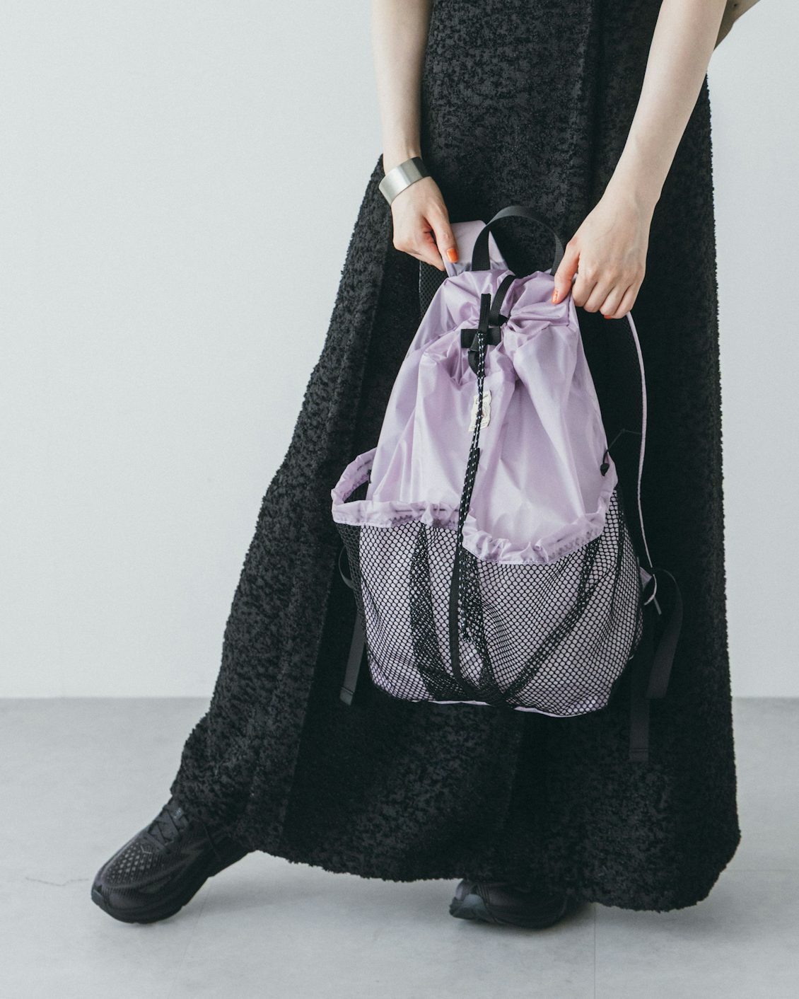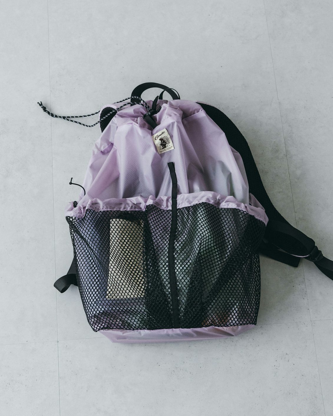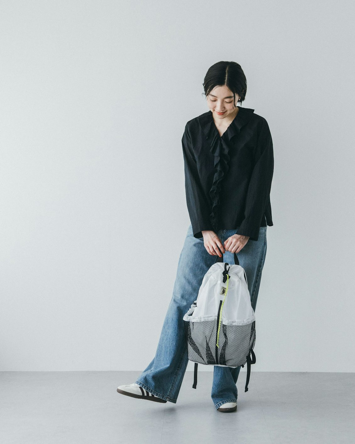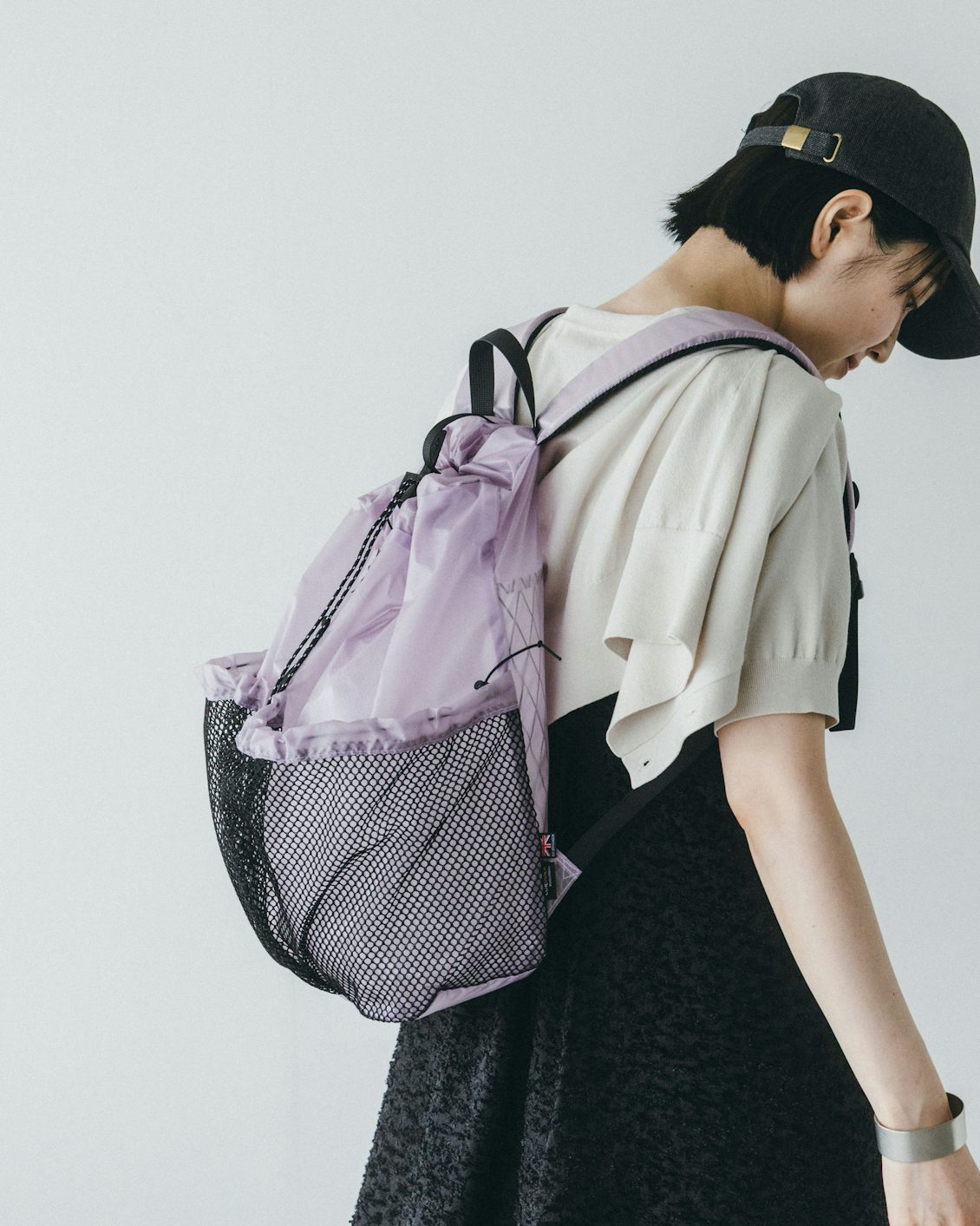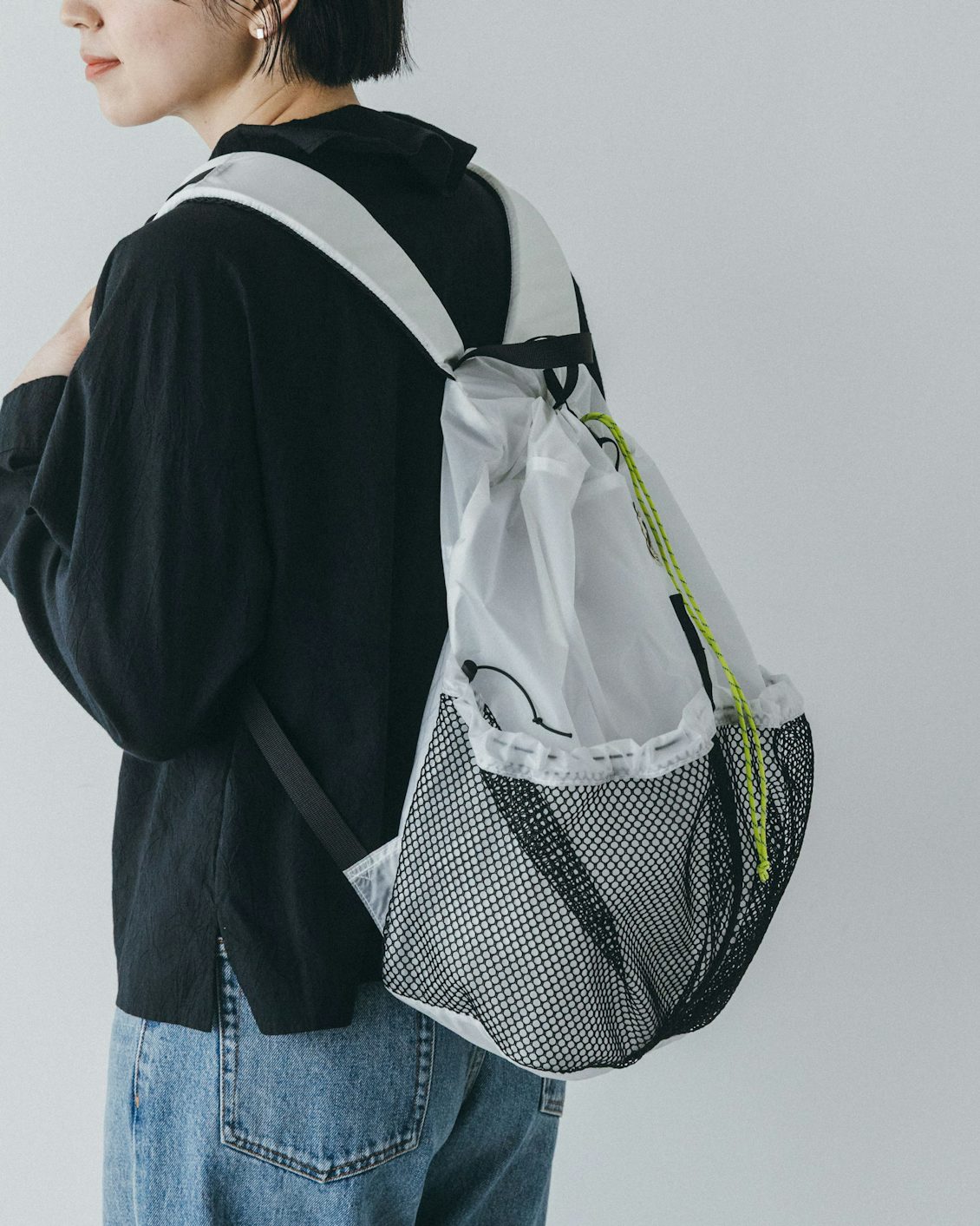 ブルーの紐や、ナイロン・メッシュの素材感が相まって、重たい印象にならず、軽やかに背負えます。