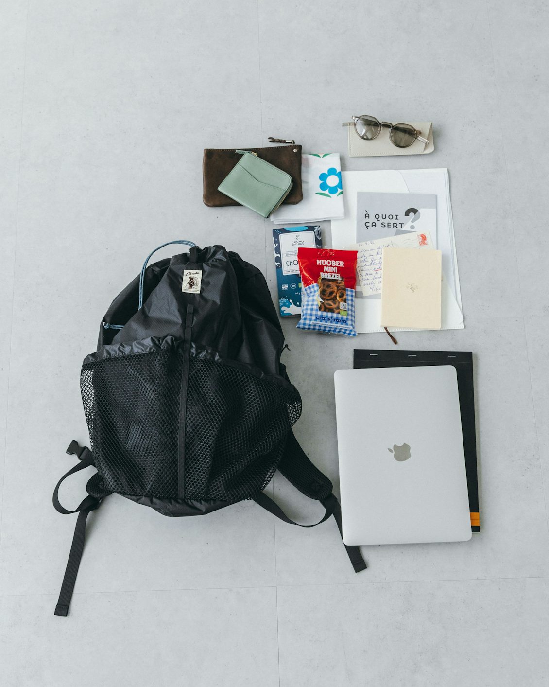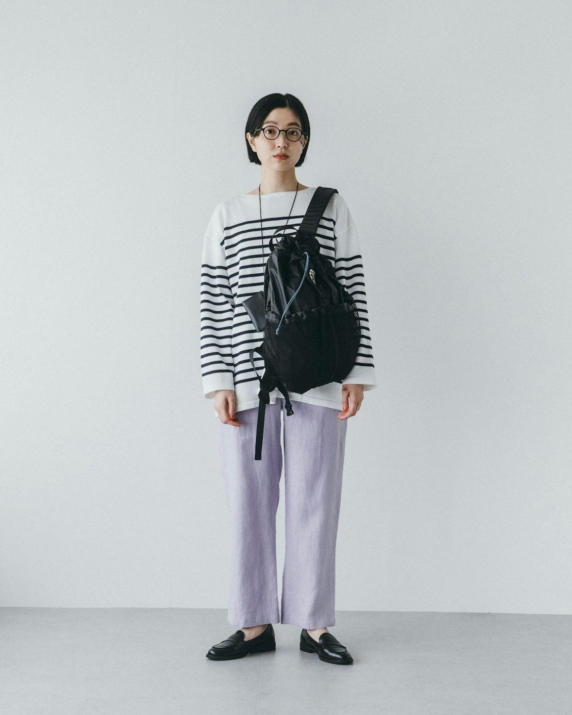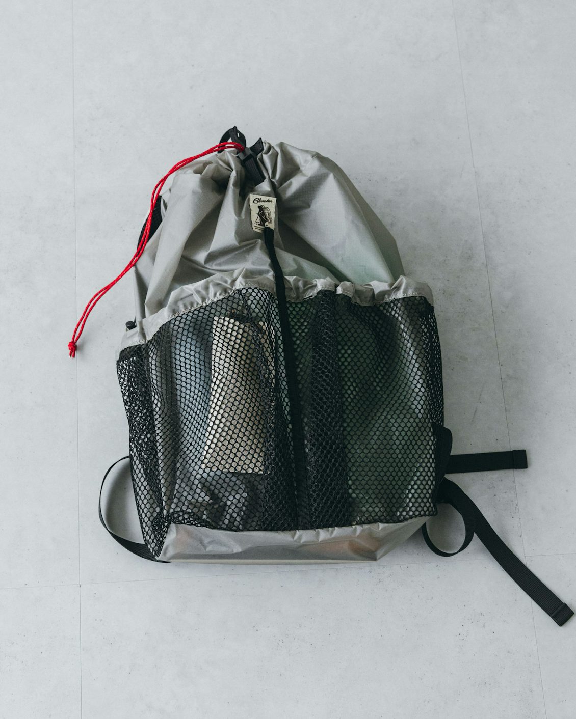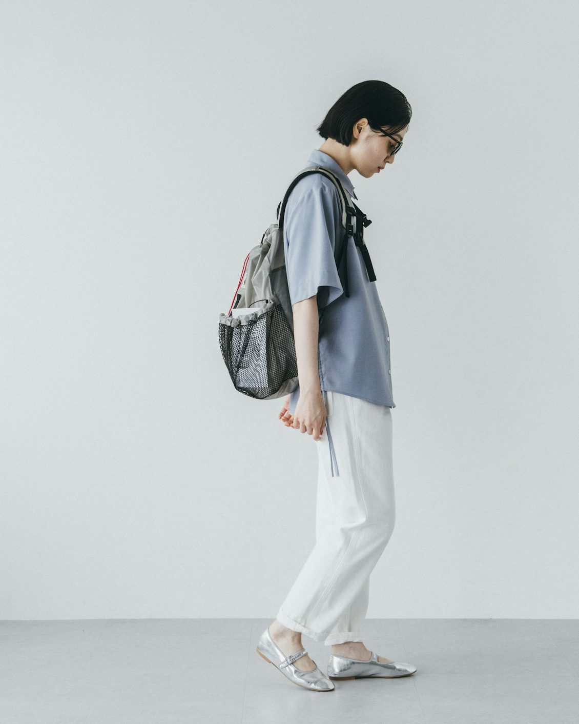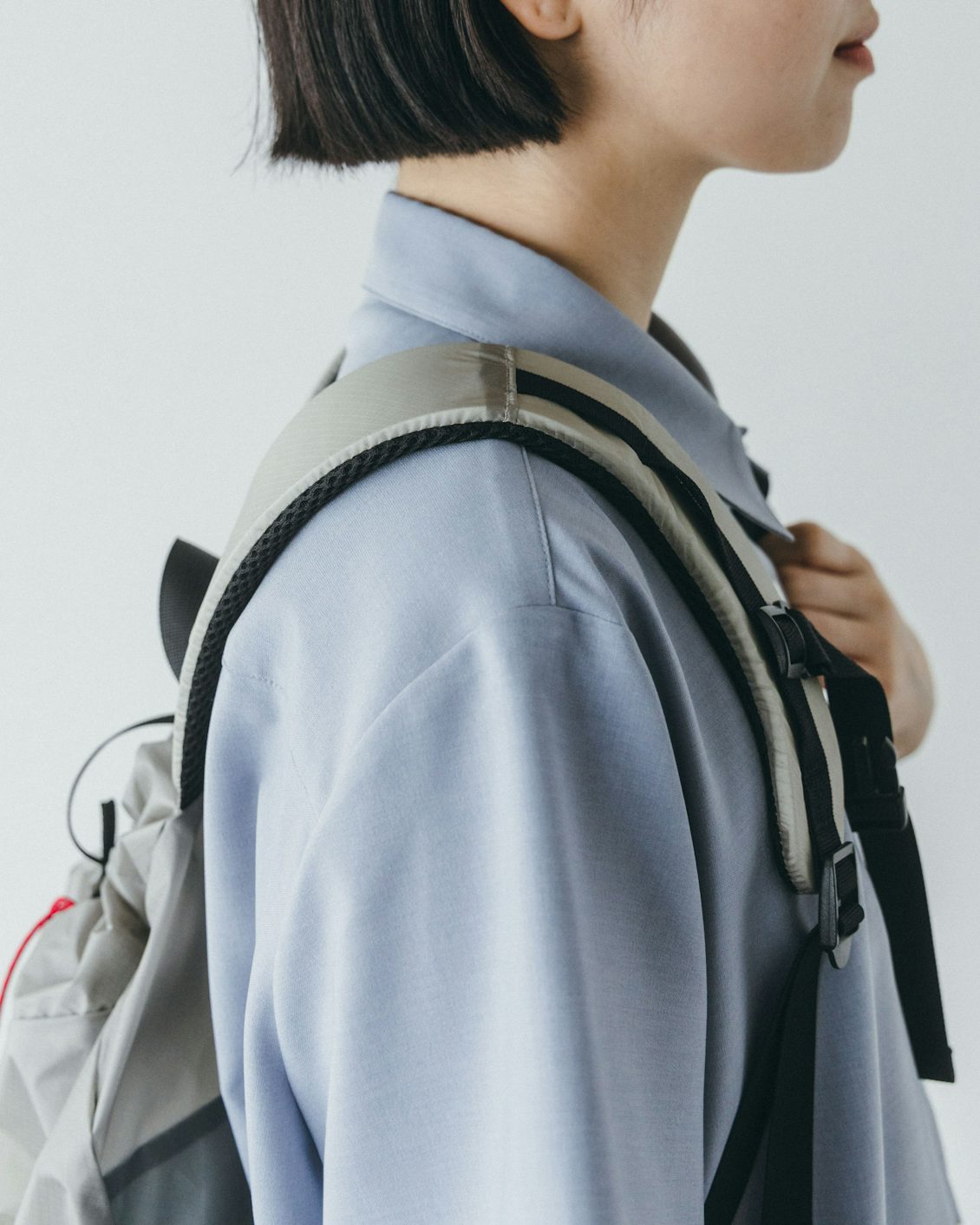 ブルーの紐や、ナイロン・メッシュの素材感が相まって、重たい印象にならず、軽やかに背負えます。