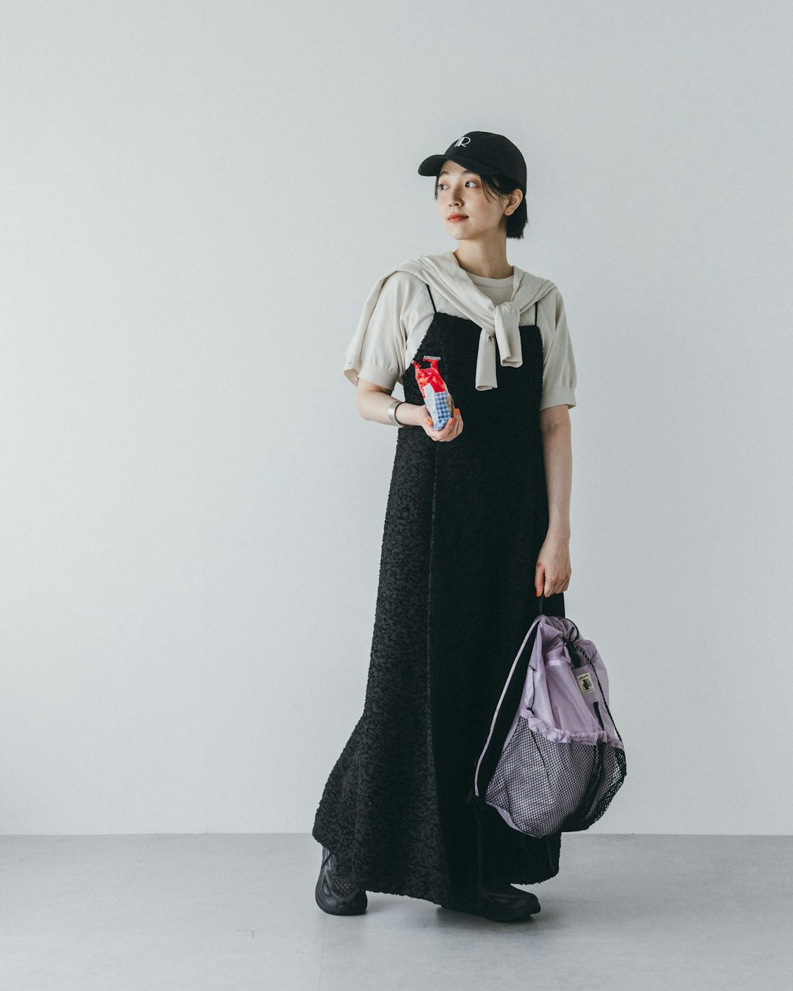 バッグ自体が華やかな色味である分、紐はベーシックなブラックに。