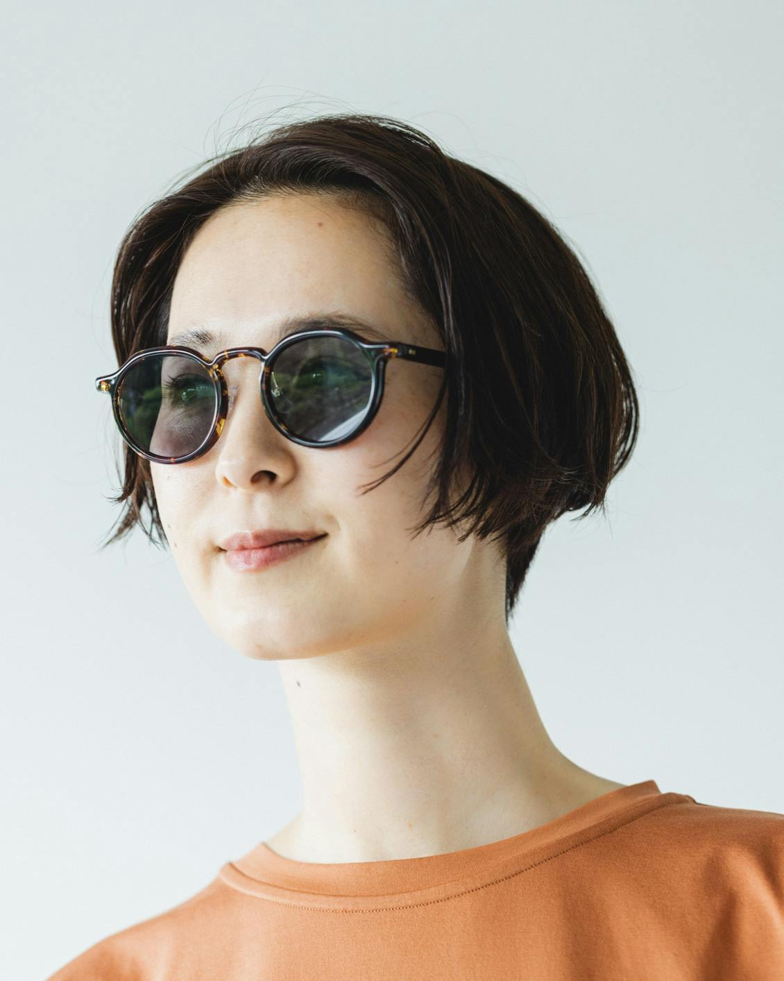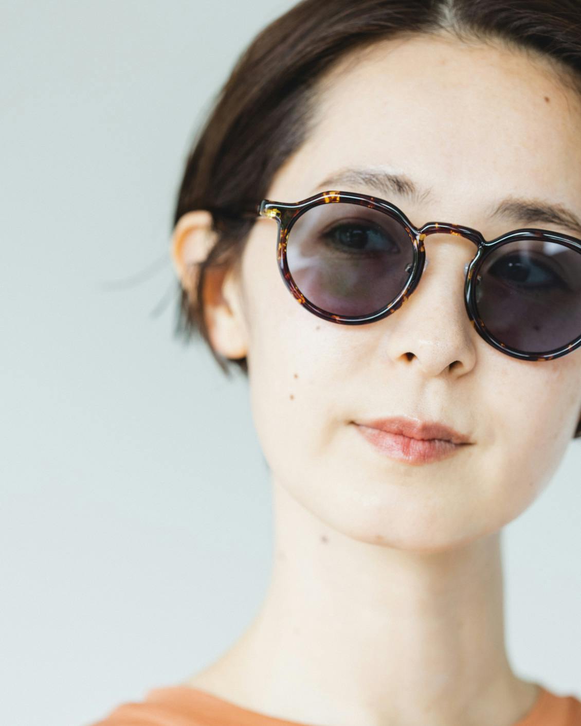 べっ甲柄フレームの「デミ」。やや青みのあるグレーレンズとの組み合わせです。