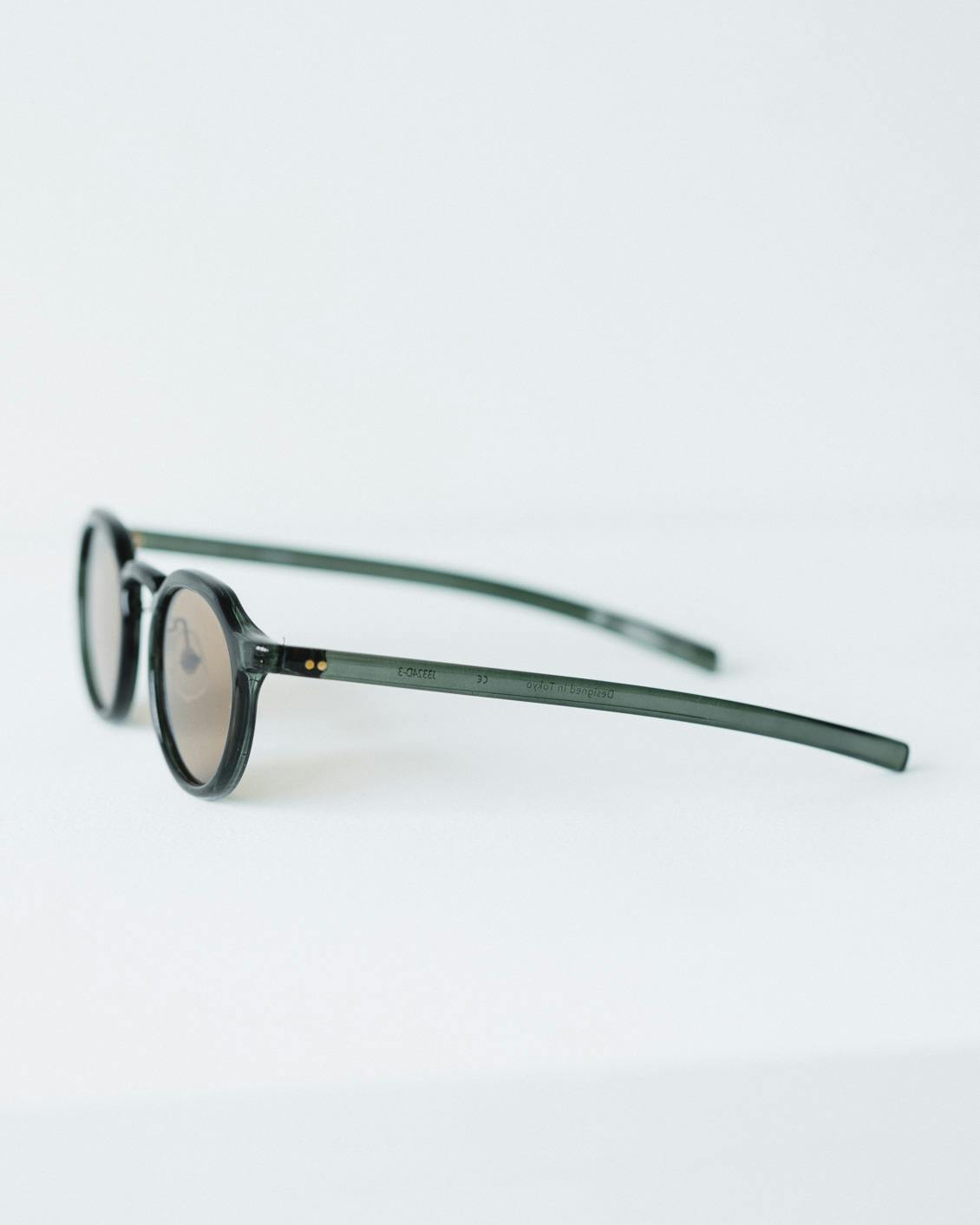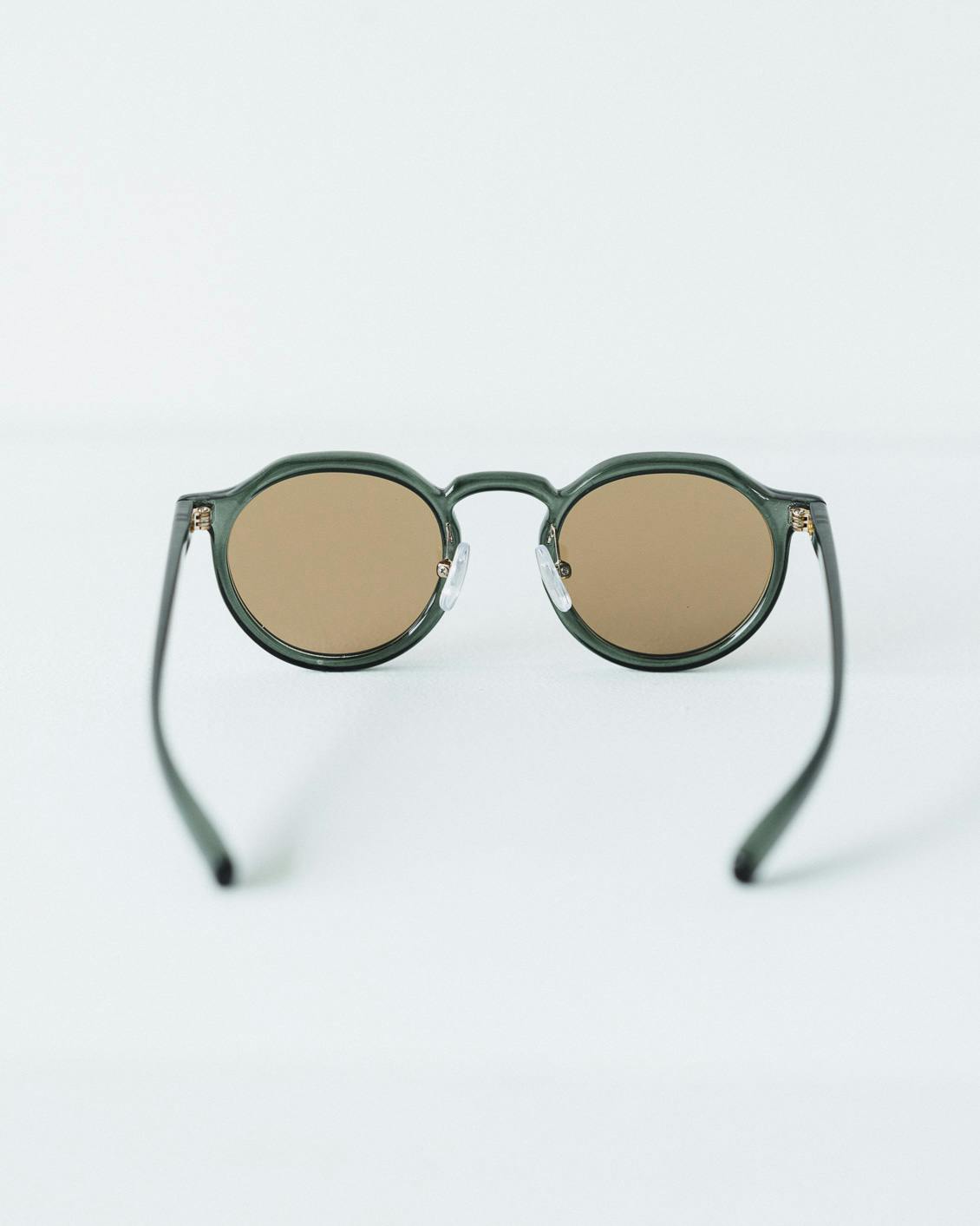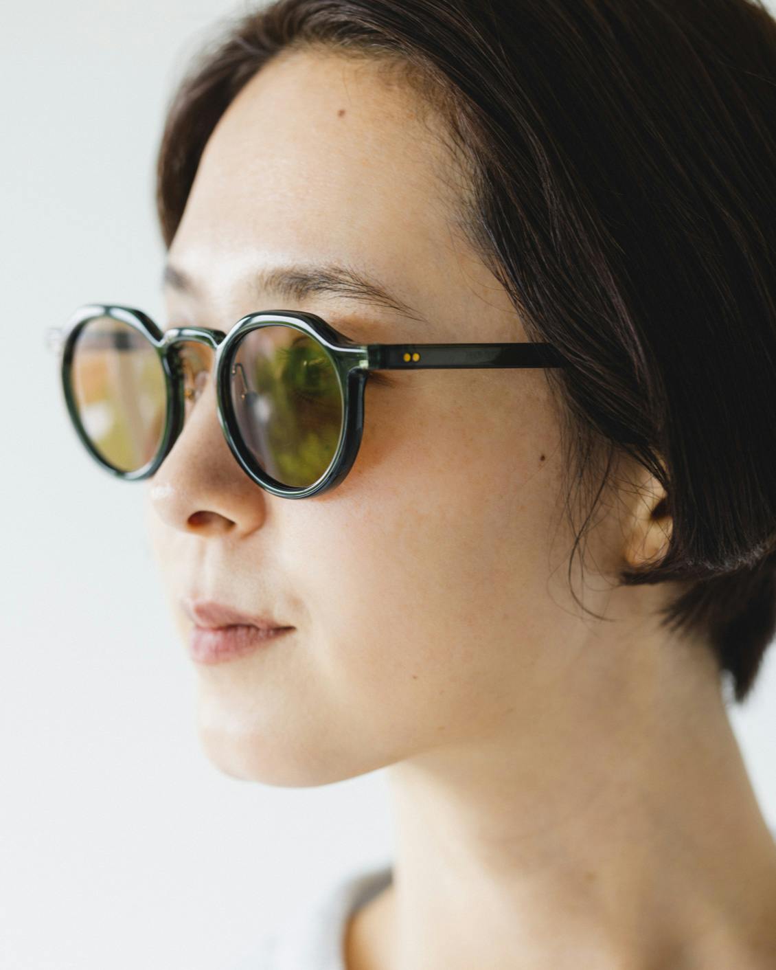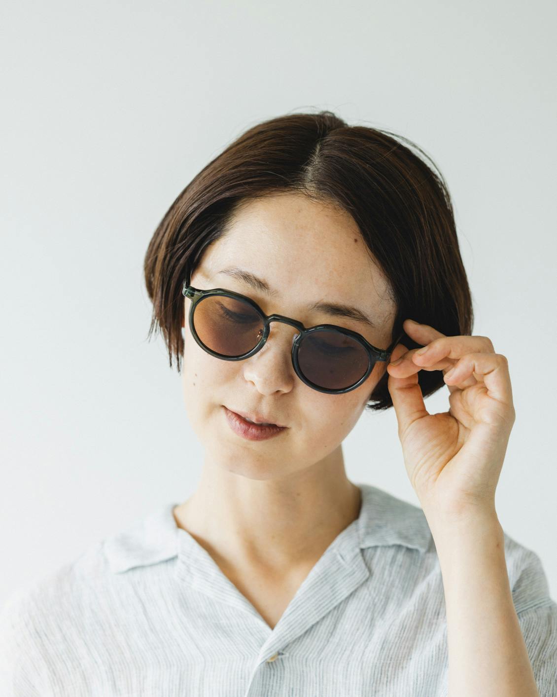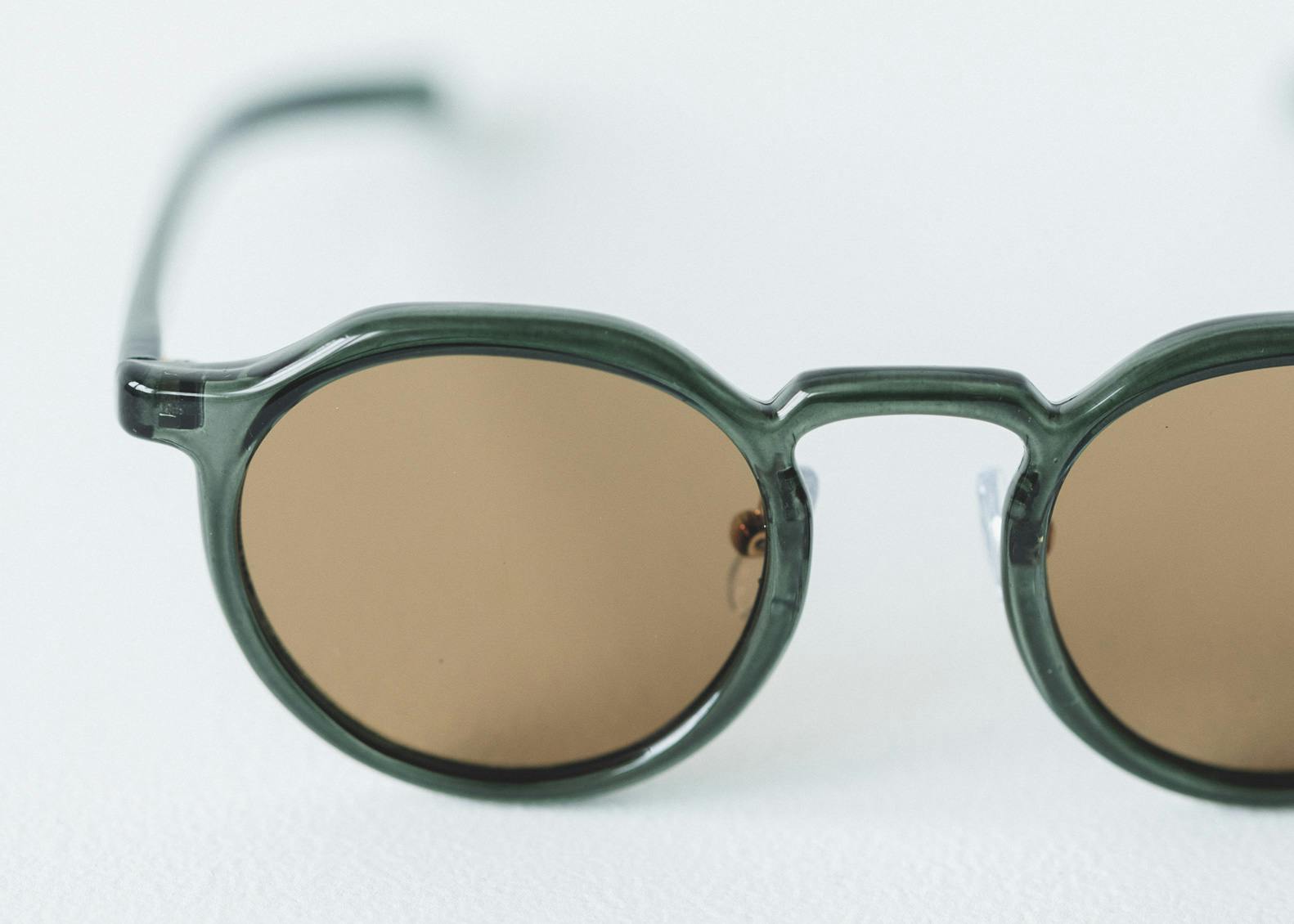 ボトルグリーンのような深い緑色のフレームと、ブラウンレンズを組み合わせた「グリーン」。
