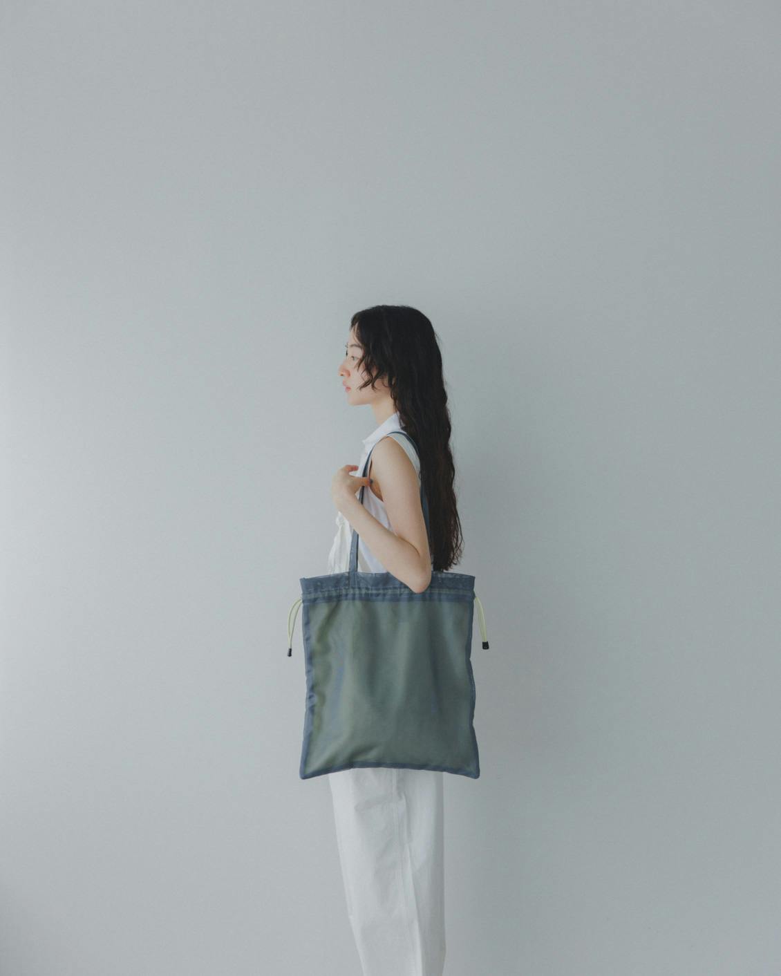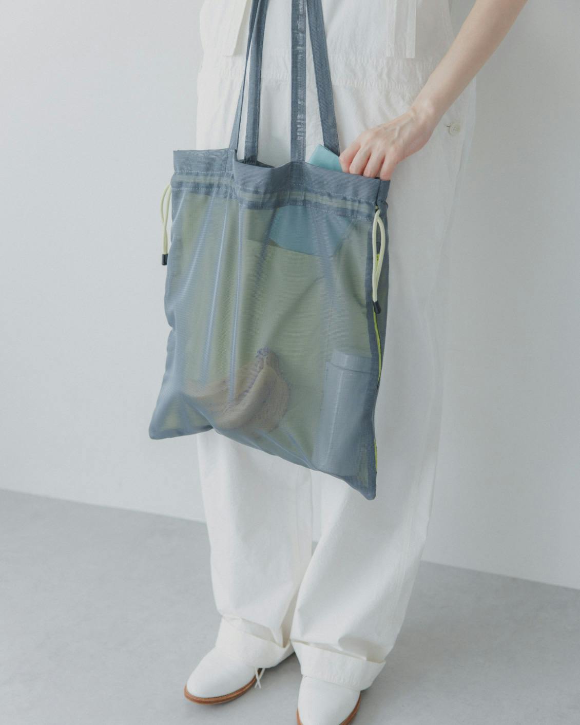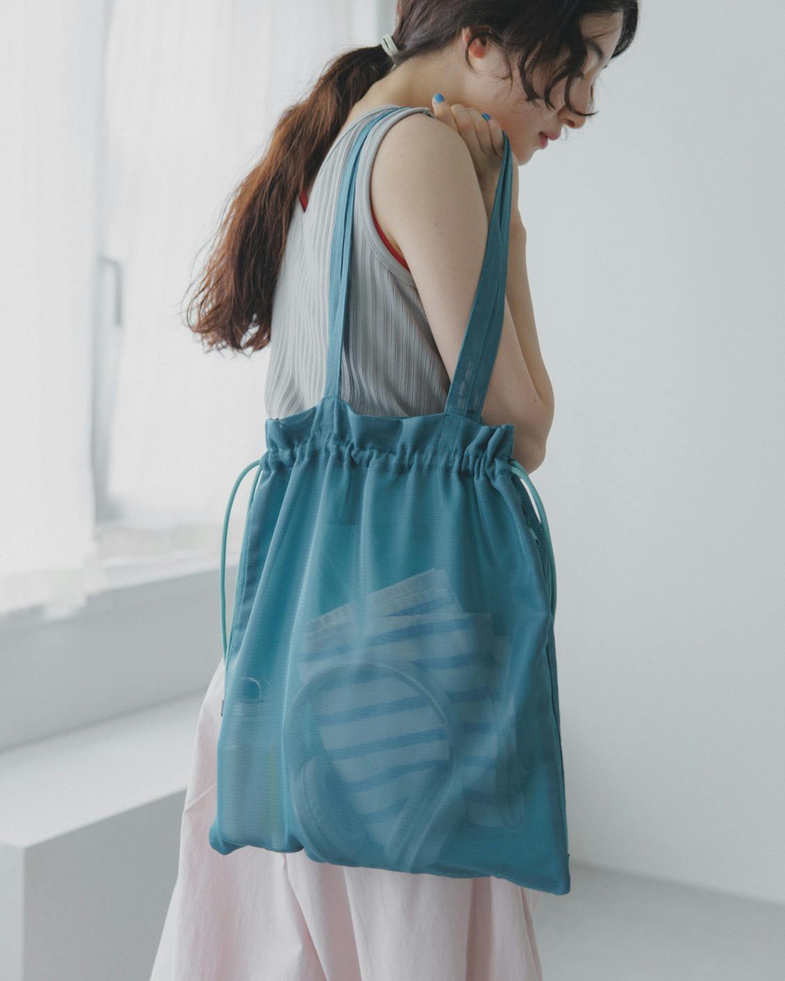 コーディネートのポイントとして持つのも可愛いし、メッシュ素材だからこそ、水辺のレジャーや、ヨガ・水泳などの習いごと、銭湯に行くときにも便利そう。