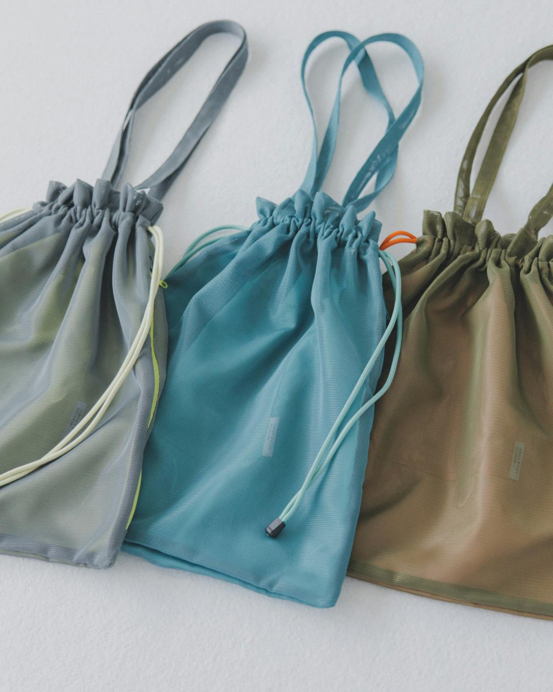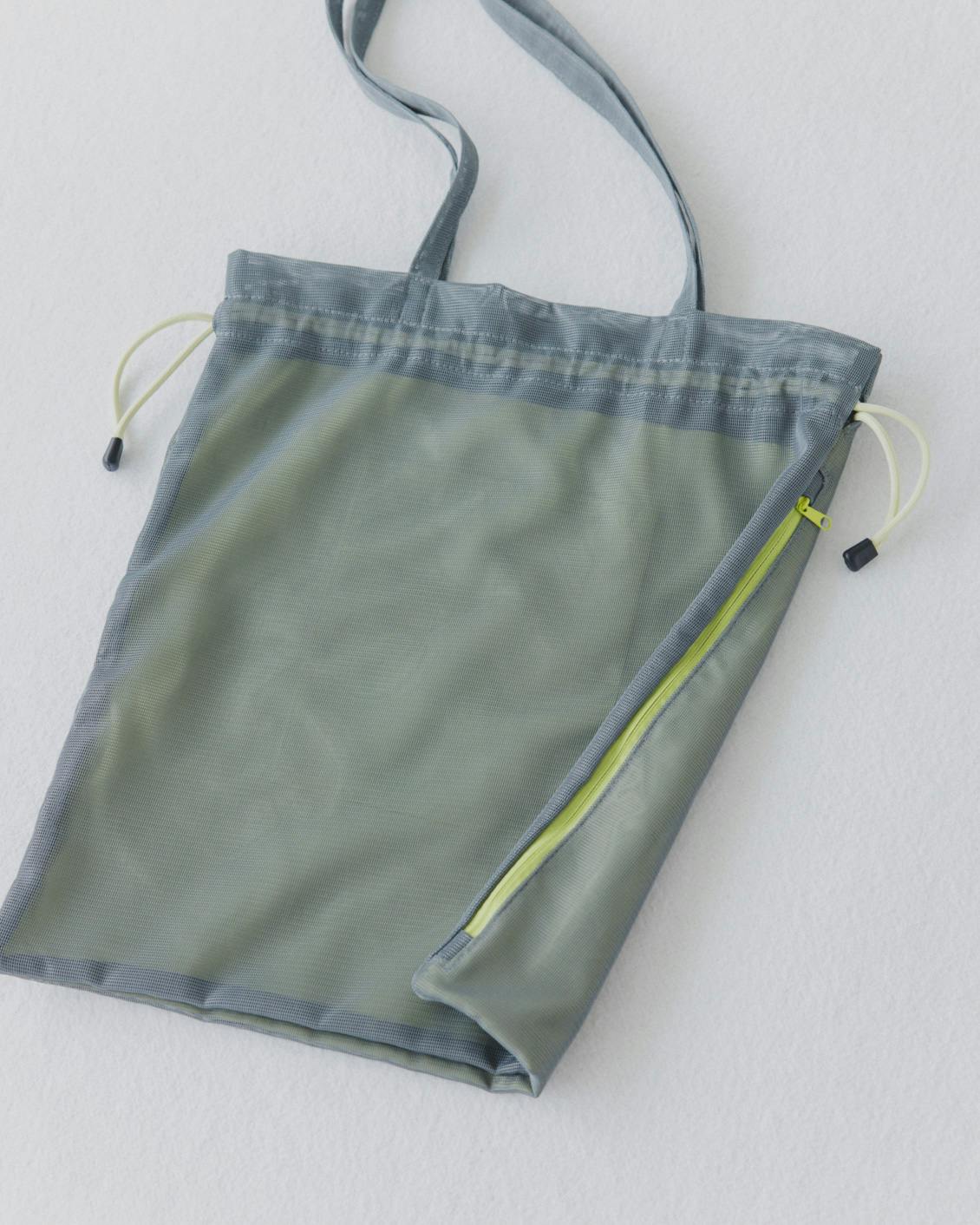 隠しポケット付きの、メッシュの巾着トート(グレー / カーキ / ターコイズ)
