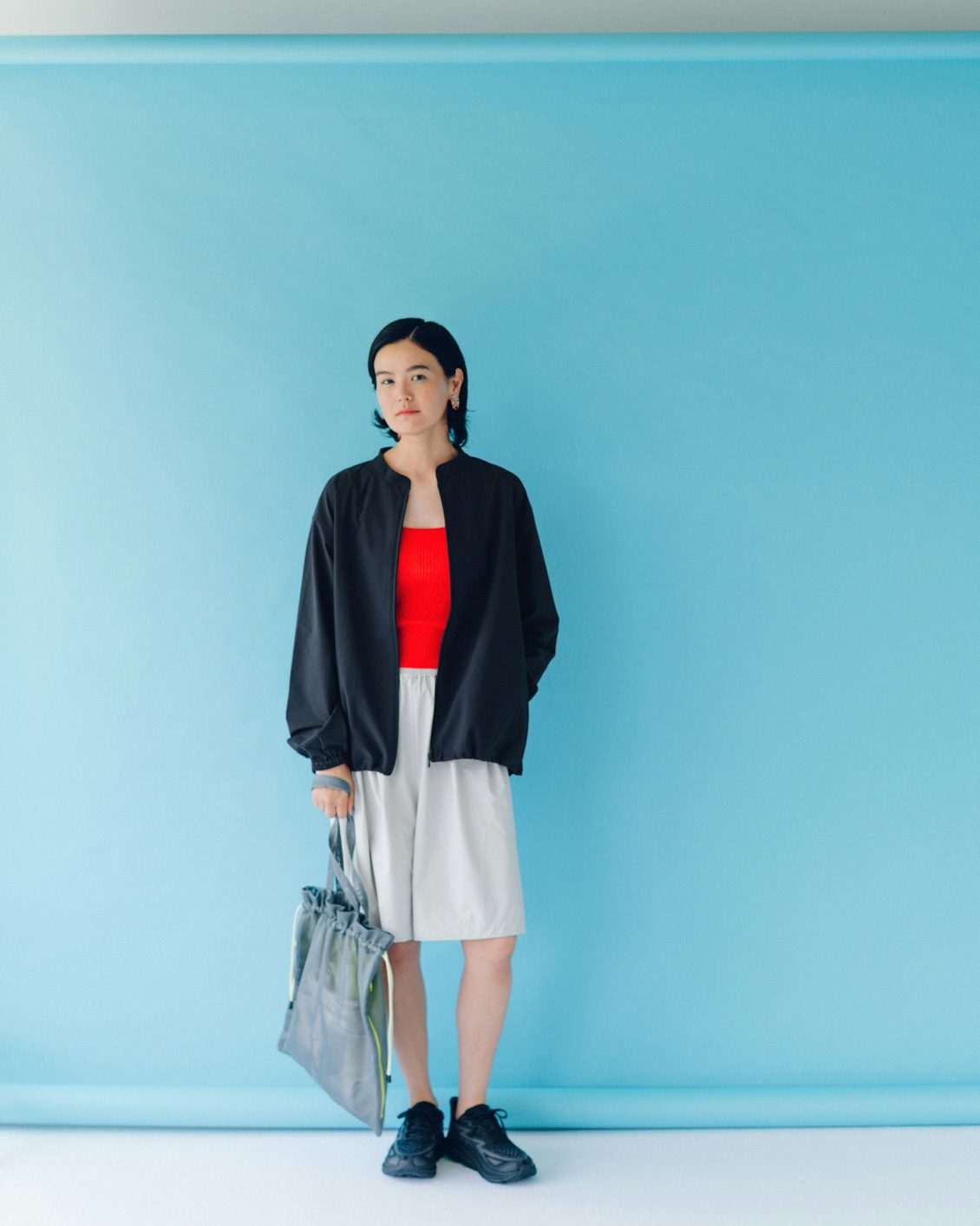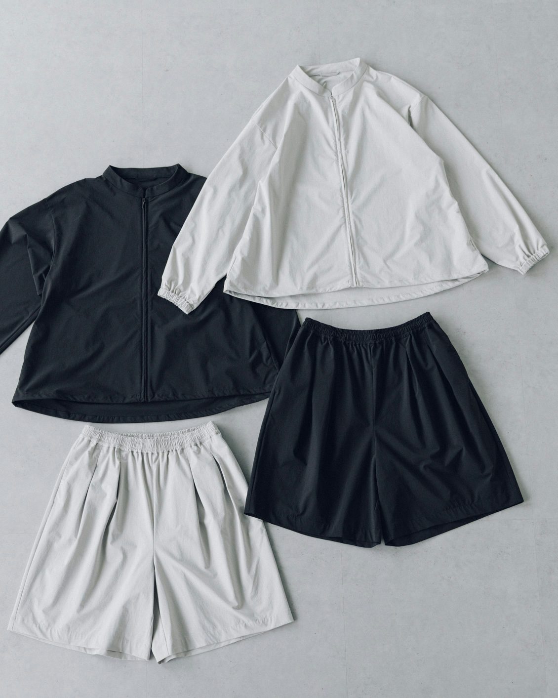 ▼ブラックのフルジップジャケットとライトグレーのハーフパンツ