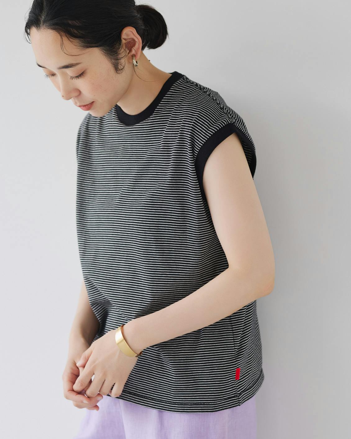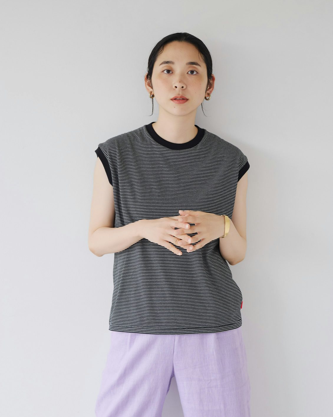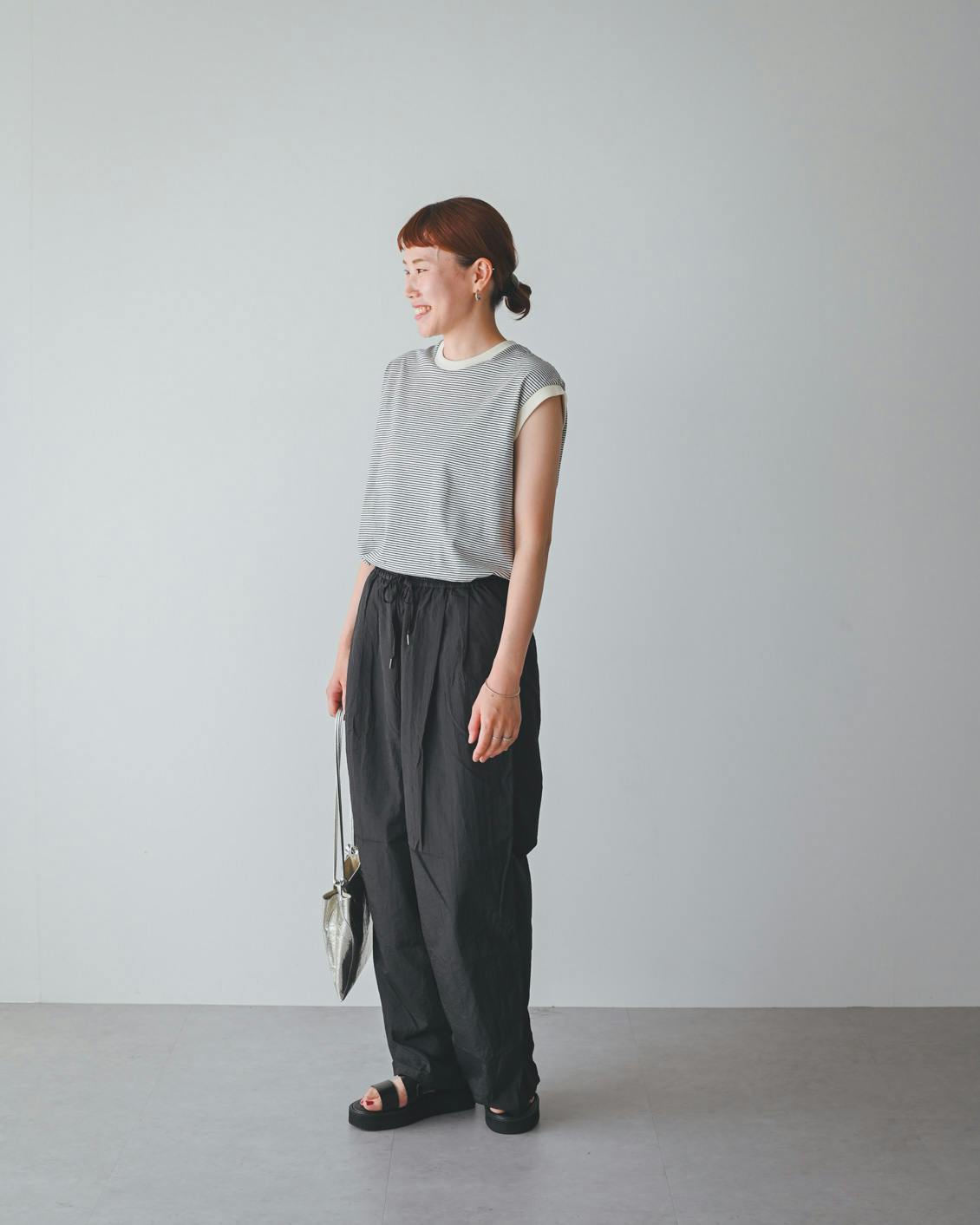 黒Tシャツ感覚で使えますが、白い線が入ることで、より軽やかに着られます。夏のモノトーンコーデにも、使い勝手抜群。