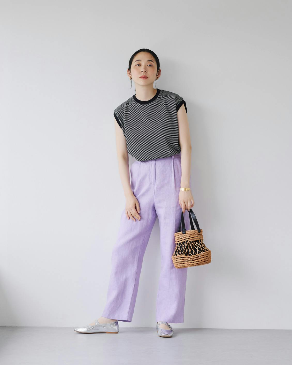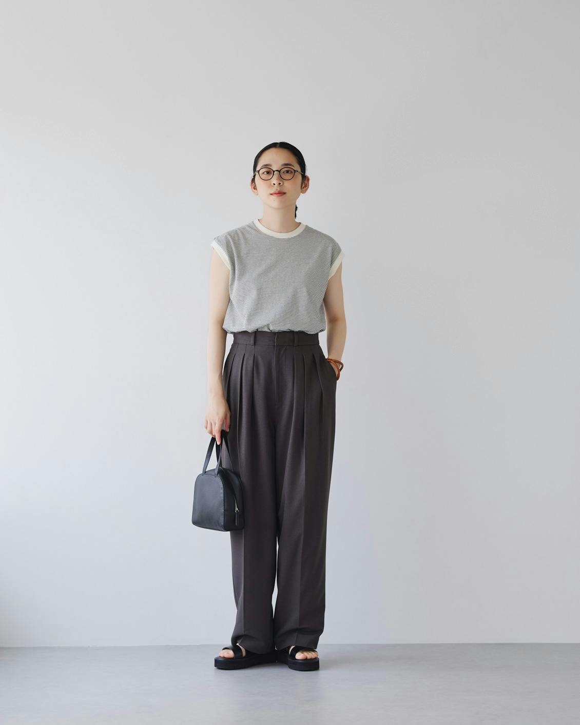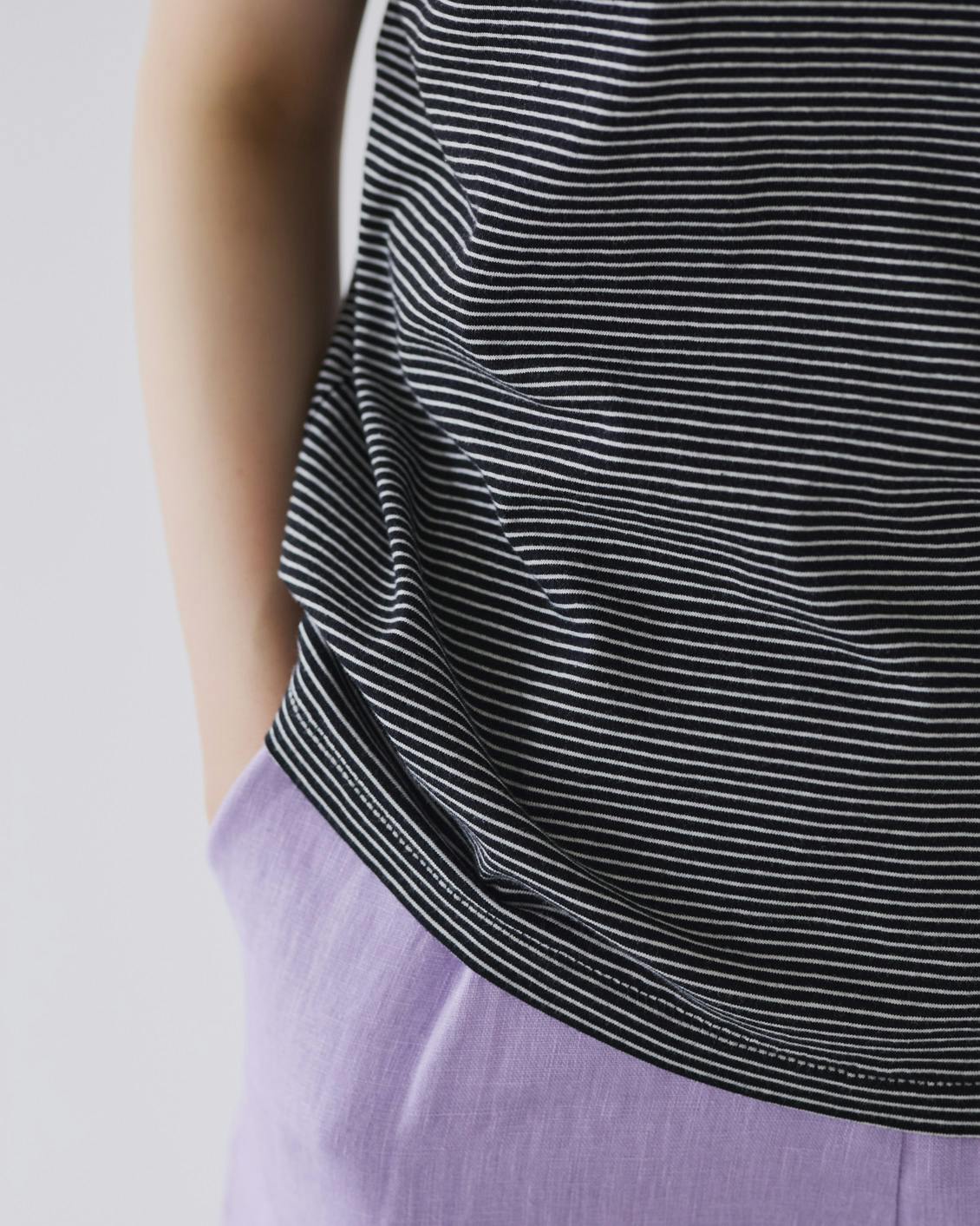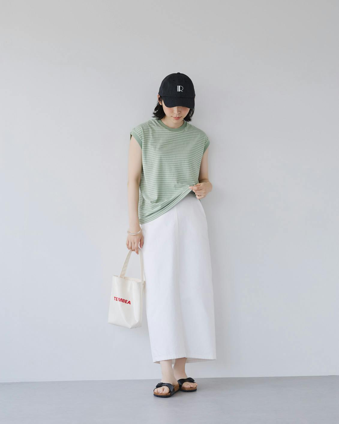 黒Tシャツ感覚で使えますが、白い線が入ることで、より軽やかに着られます。夏のモノトーンコーデにも、使い勝手抜群。