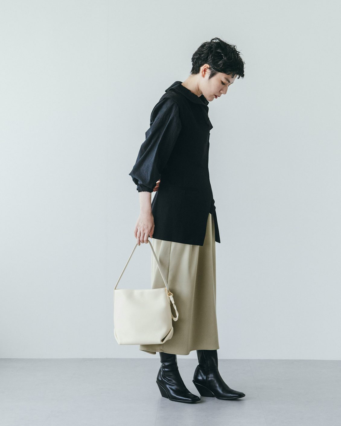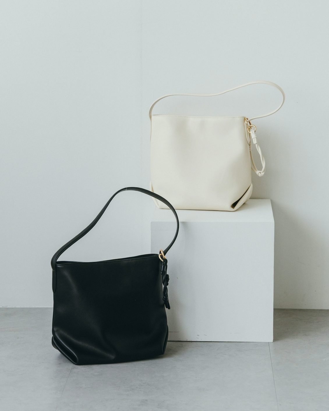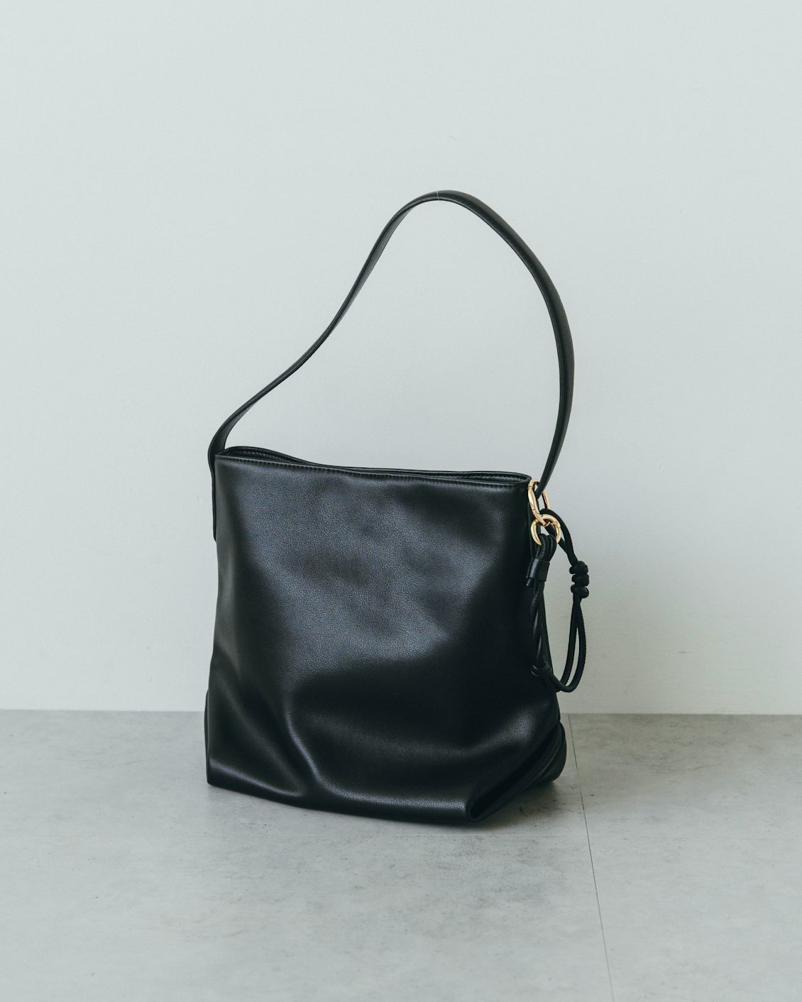 シンプルなデザインでありながら、カチッとしすぎずやさしい印象の「バケットバッグ」です。