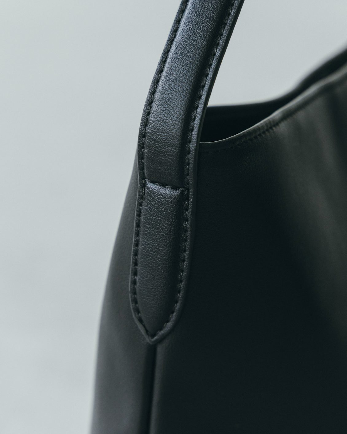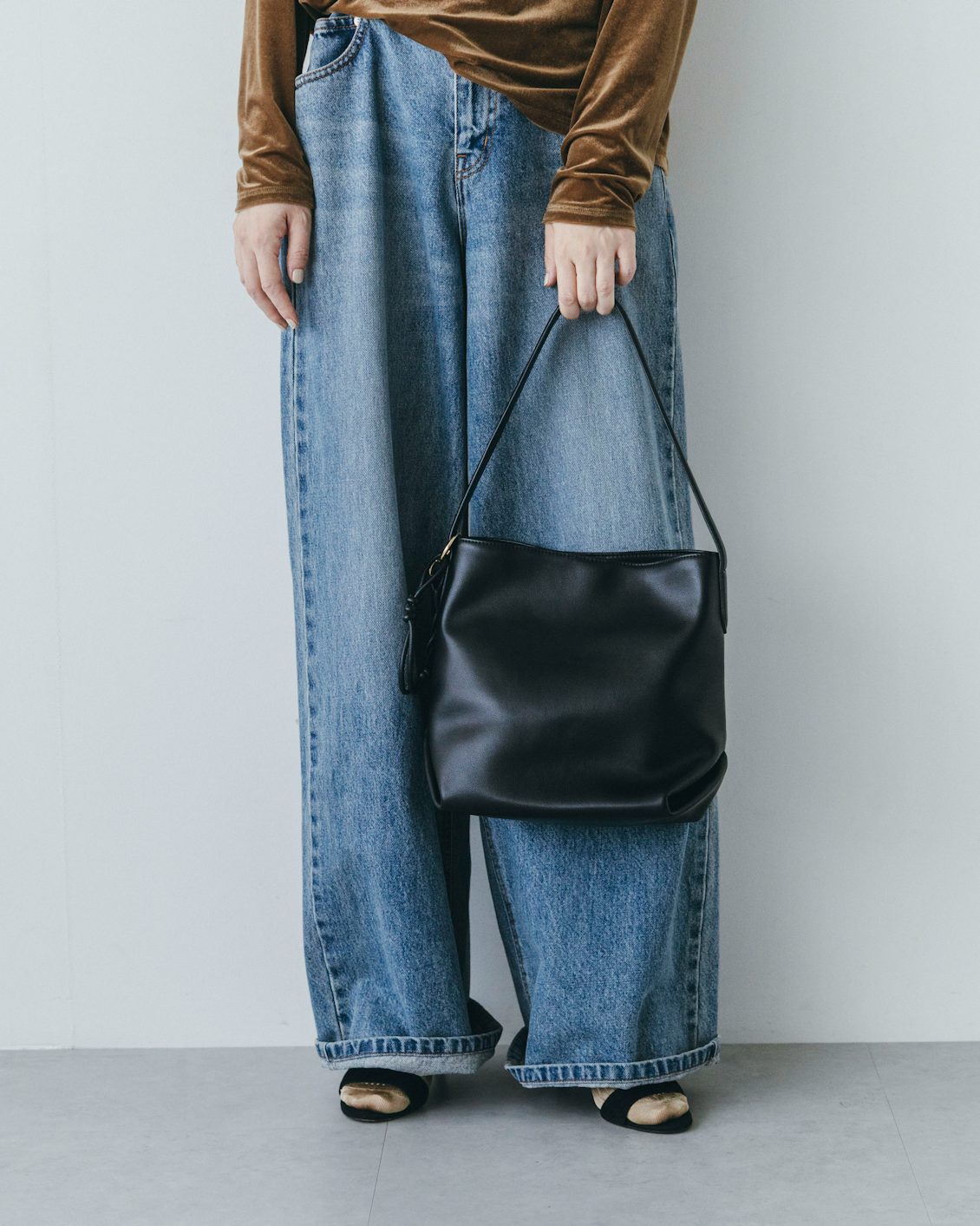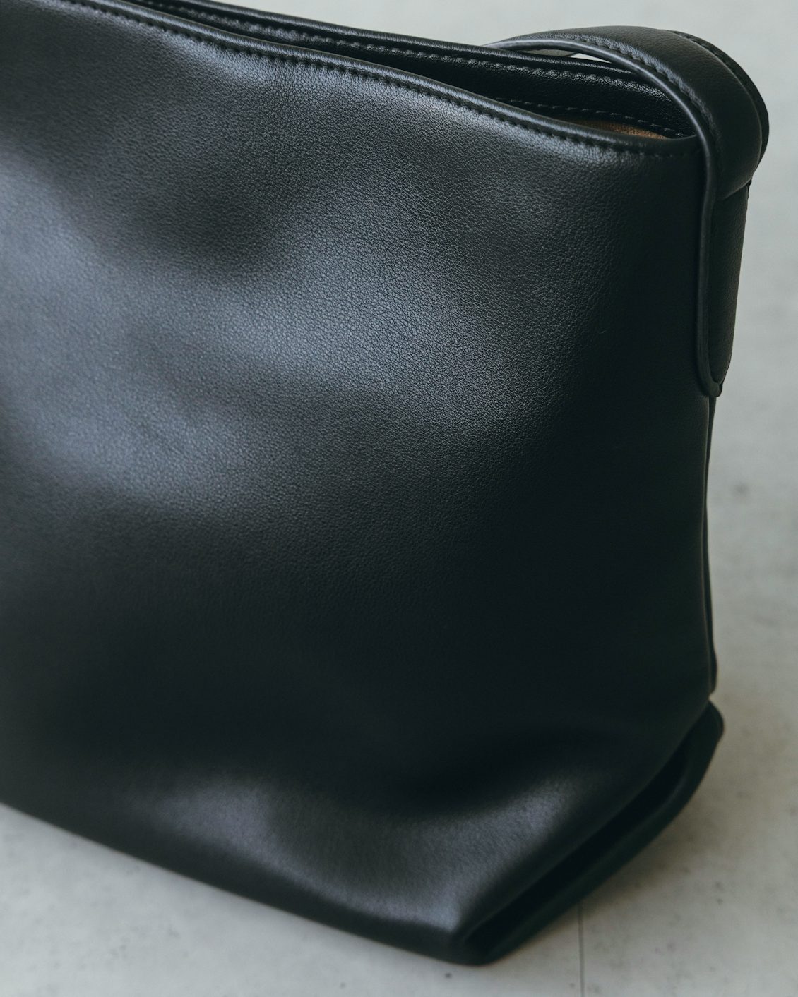 シンプルなデザインでありながら、カチッとしすぎずやさしい印象の「バケットバッグ」です。