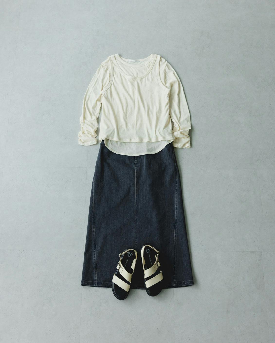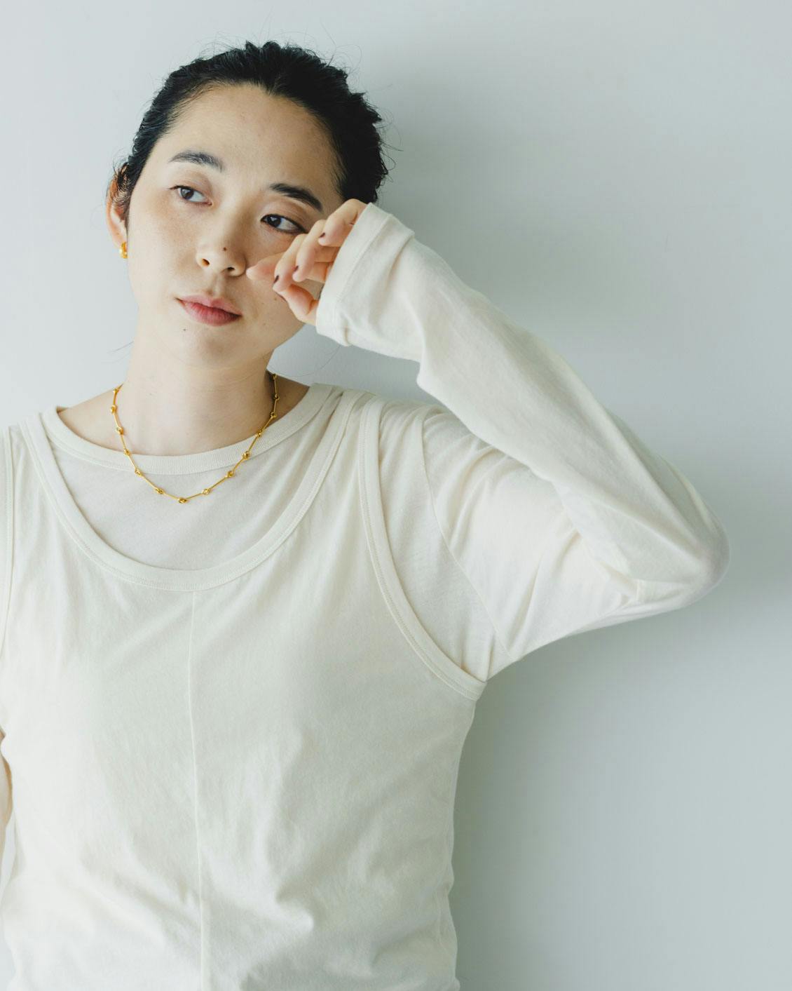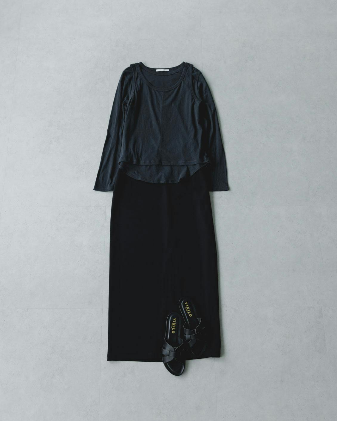 カットソーとタンクトップが同色のため、レイヤードをさりげない存在感で楽しめるのも大人っぽさの理由。