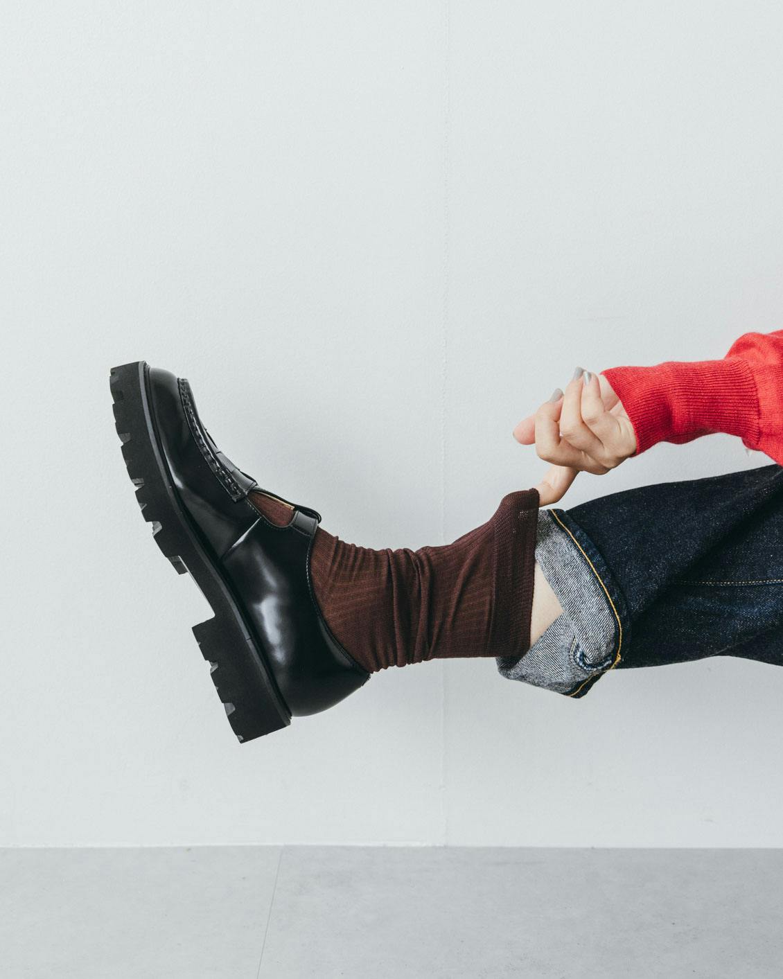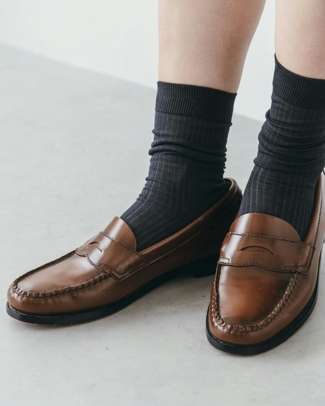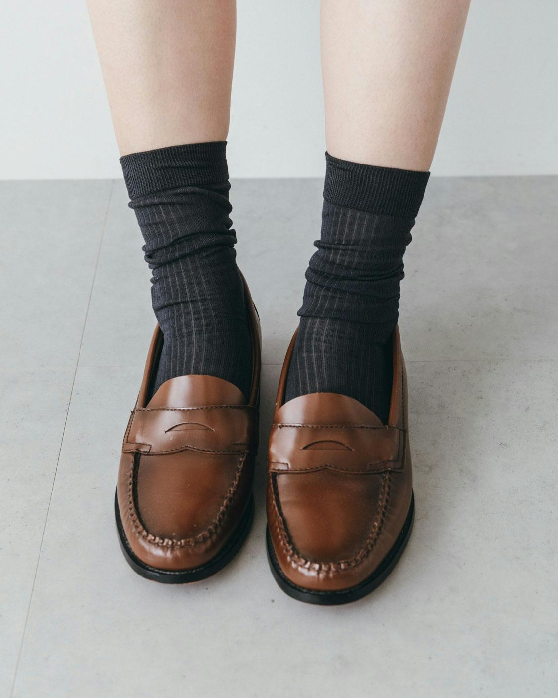 レザーシューズや、華奢なつくりのシューズが持っている雰囲気を損なわず、きちんと装いたいという場合にも、薄手ってとっても便利。