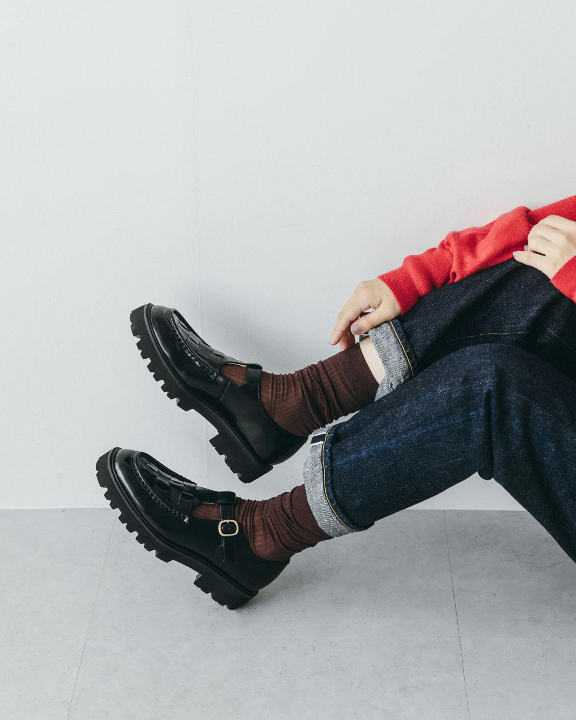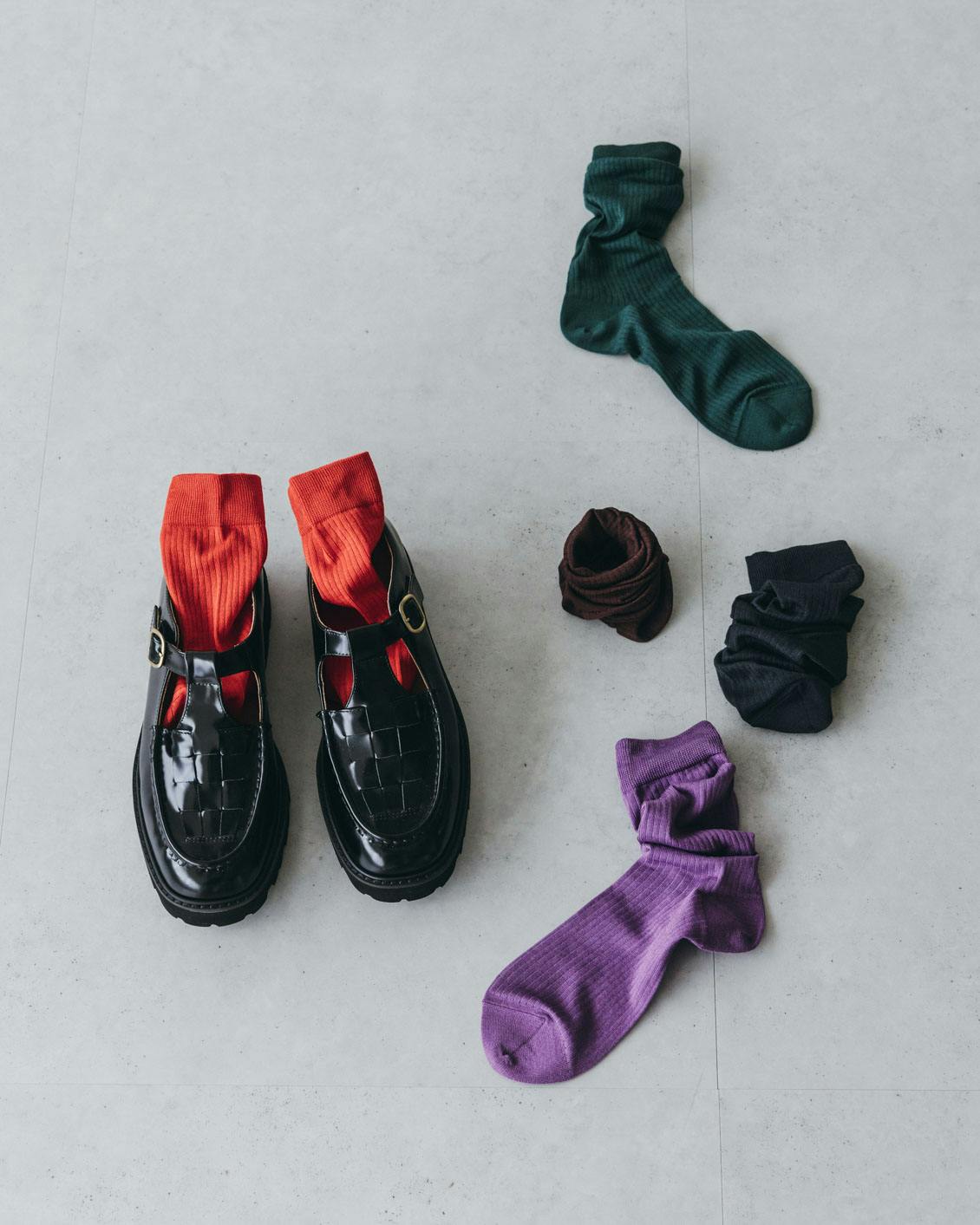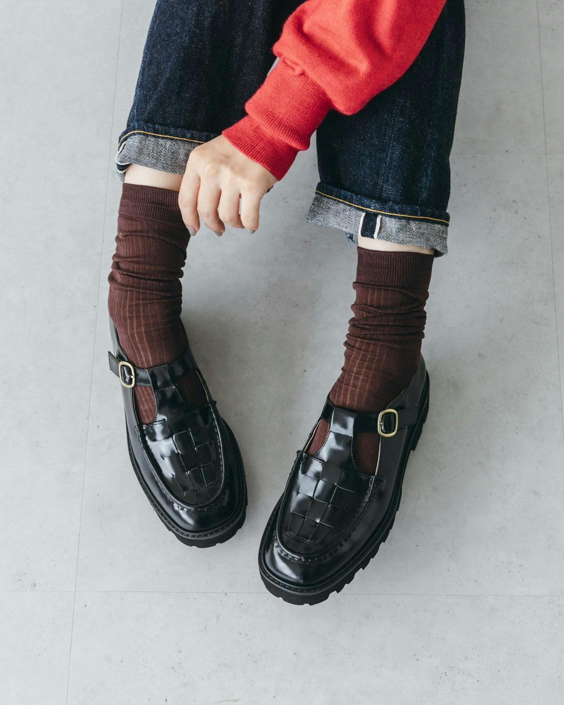 シアーリブソックスを作る際に、きっと似合うだろうなとワクワクしたのは、当店オリジナルの「Tストラップシューズ」でした。