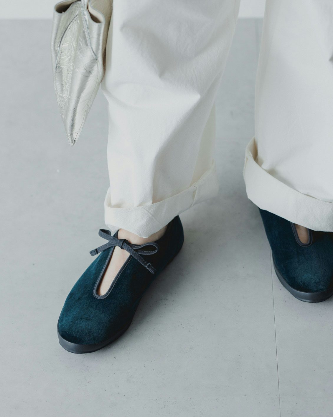 今回、バイヤーが見つけてきたのが、「ベルベット生地のフラットシューズ」。