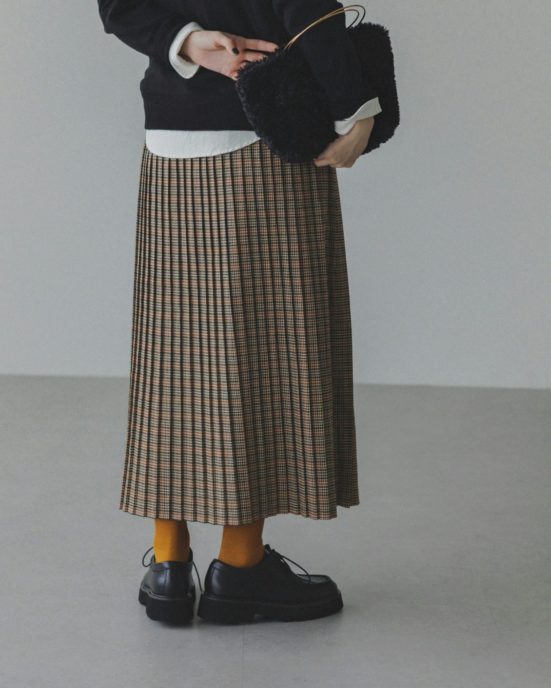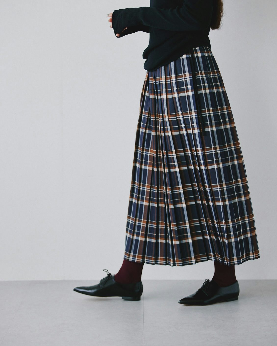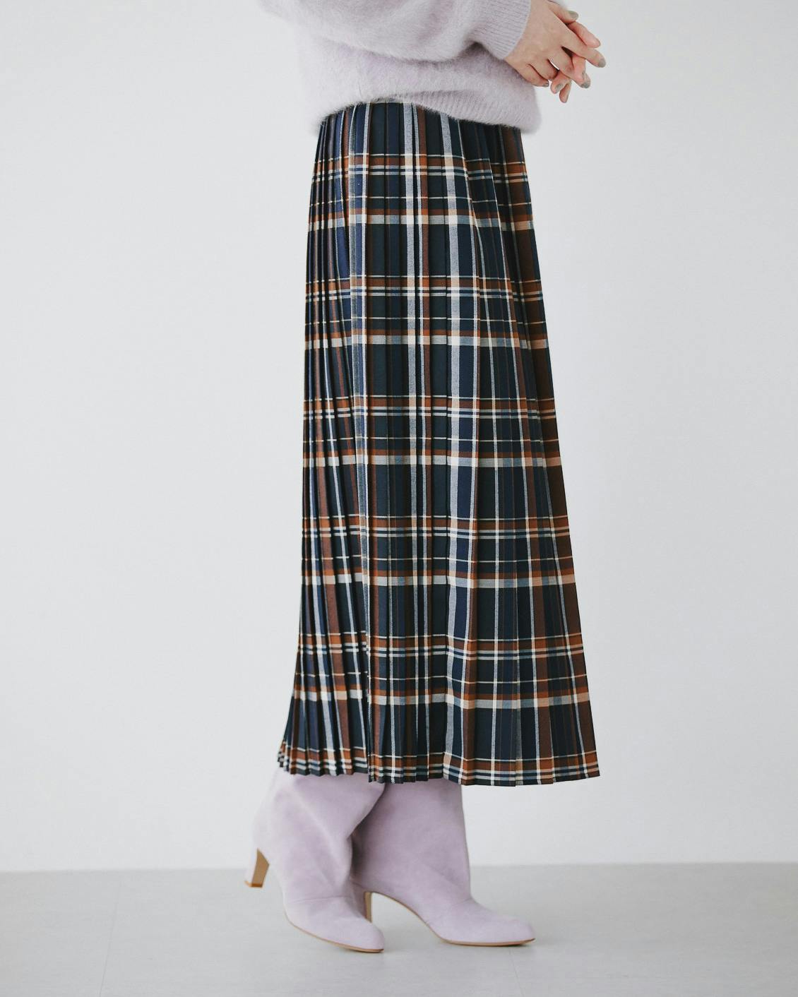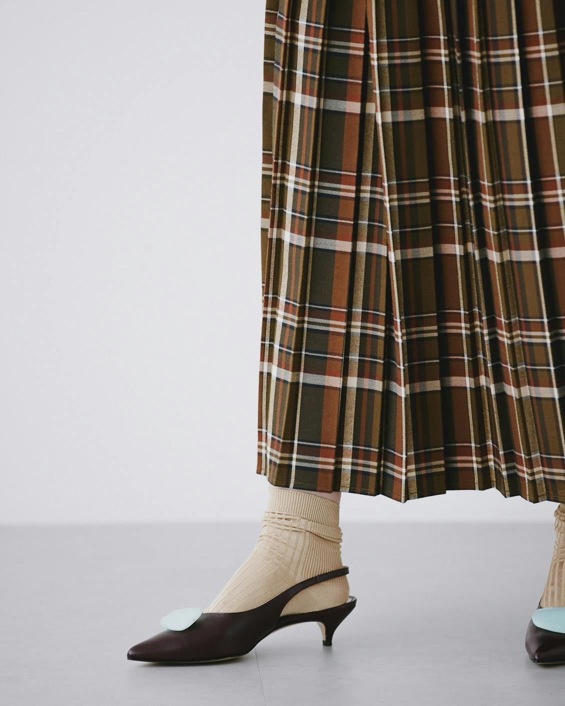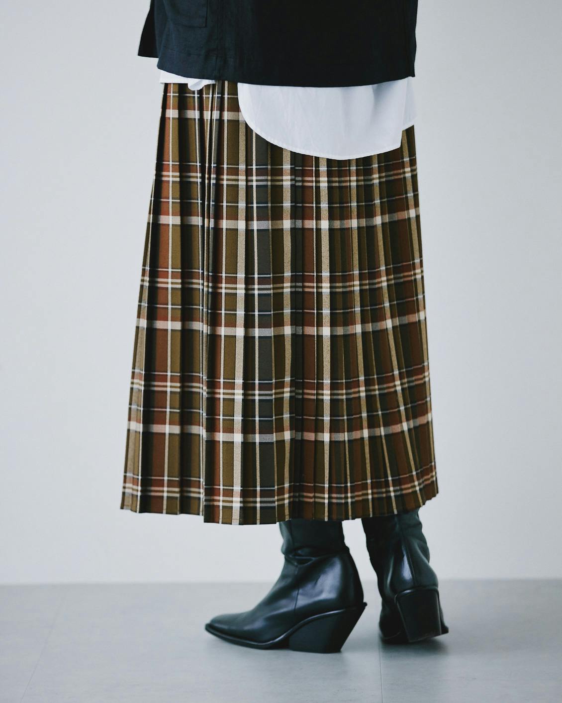 秋冬に履きたい靴との相性も抜群だから、落ち着いた雰囲気を纏ったまま、シックにチェック柄を楽しむことができるスカートです。
