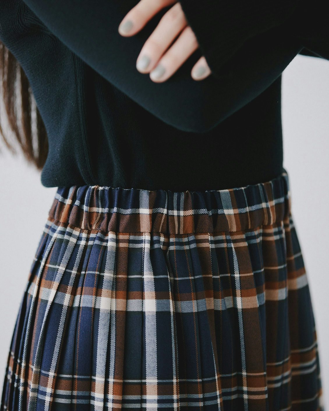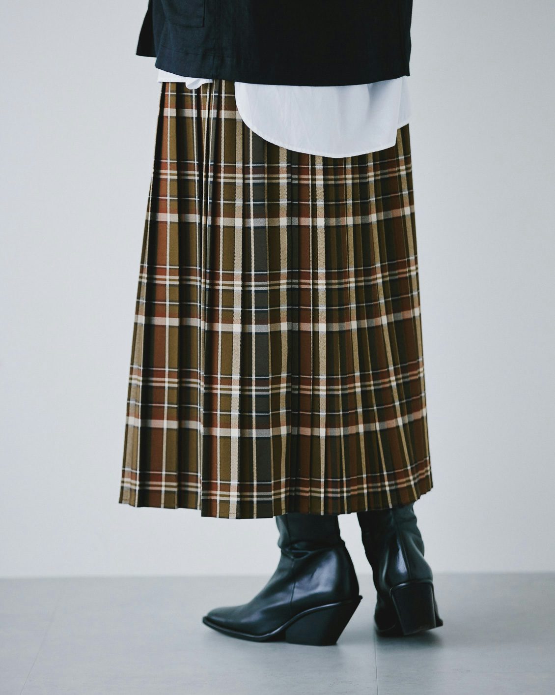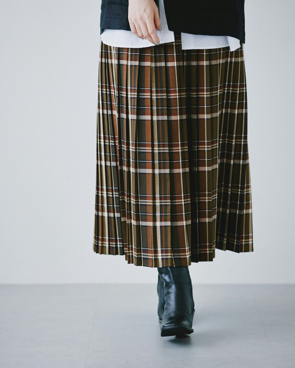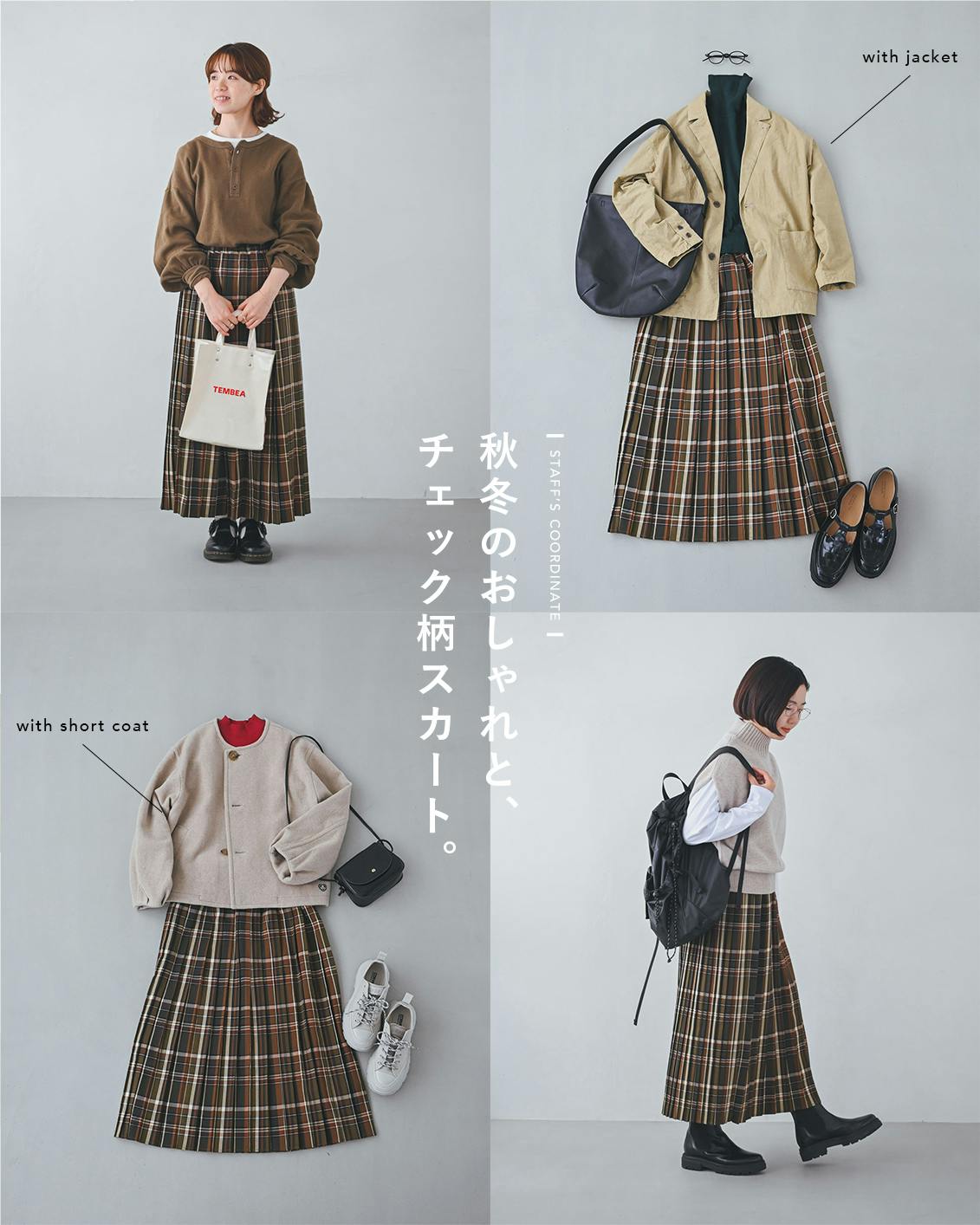 秋冬に履きたい靴との相性も抜群だから、落ち着いた雰囲気を纏ったまま、シックにチェック柄を楽しむことができるスカートです。