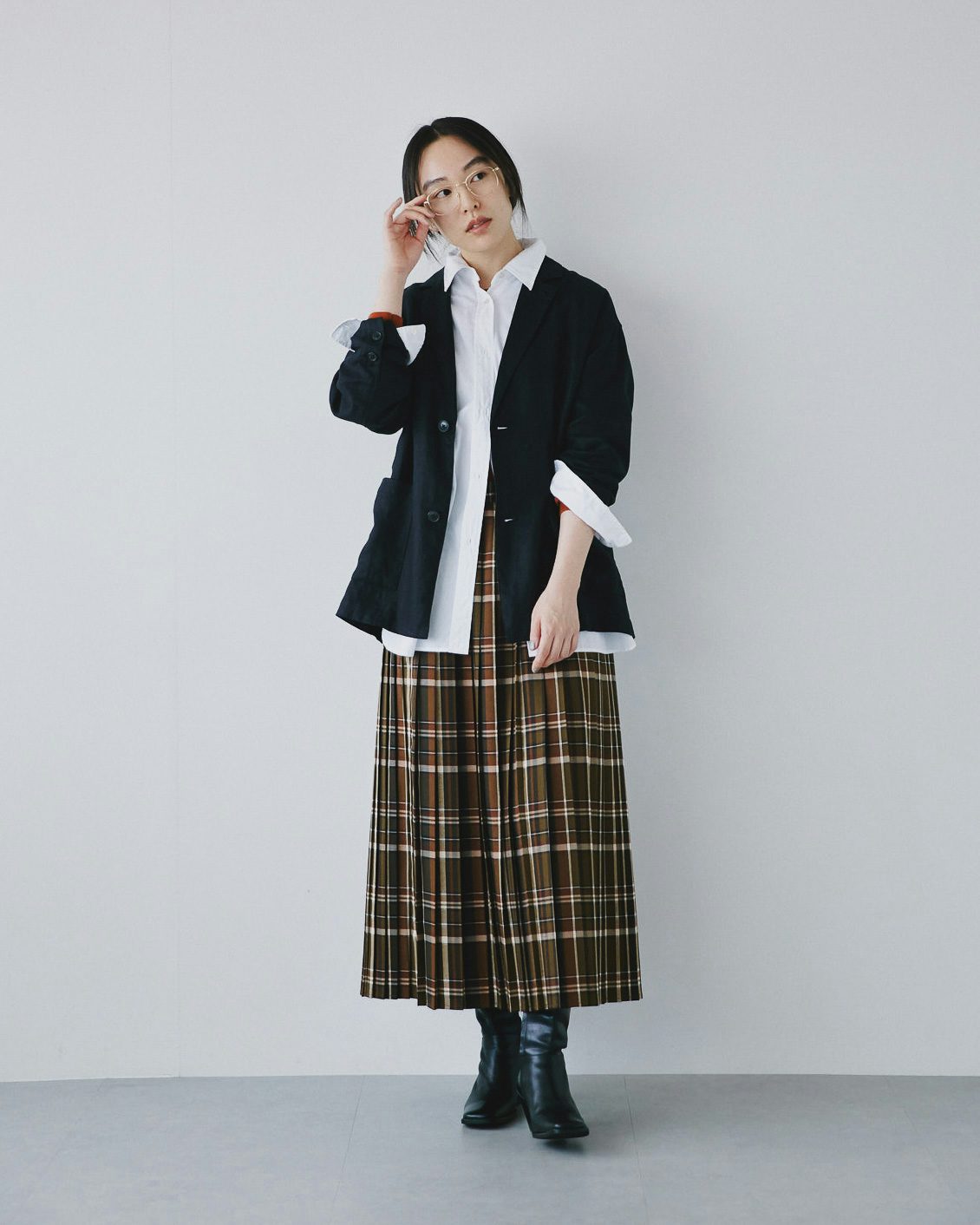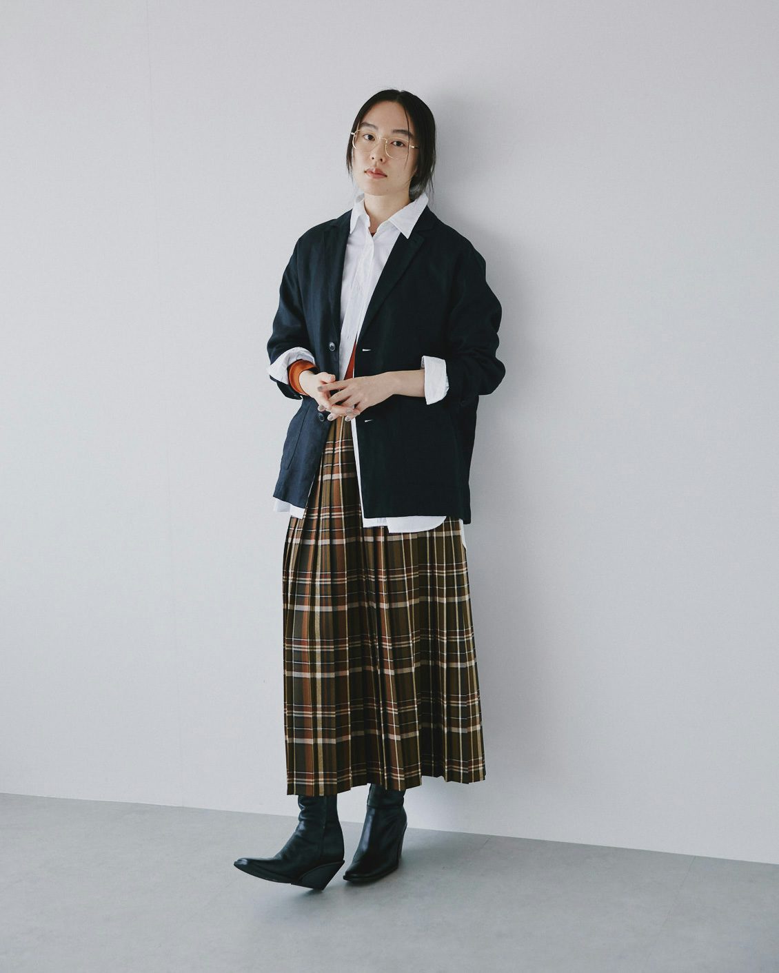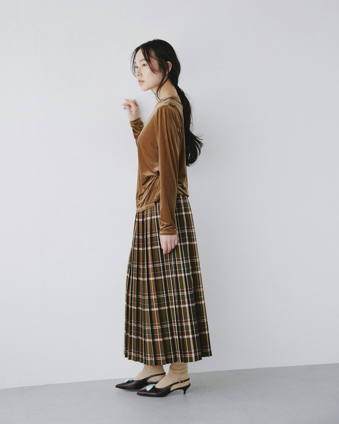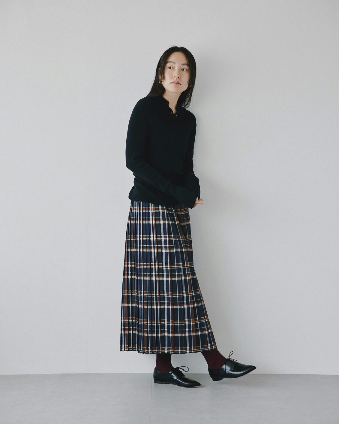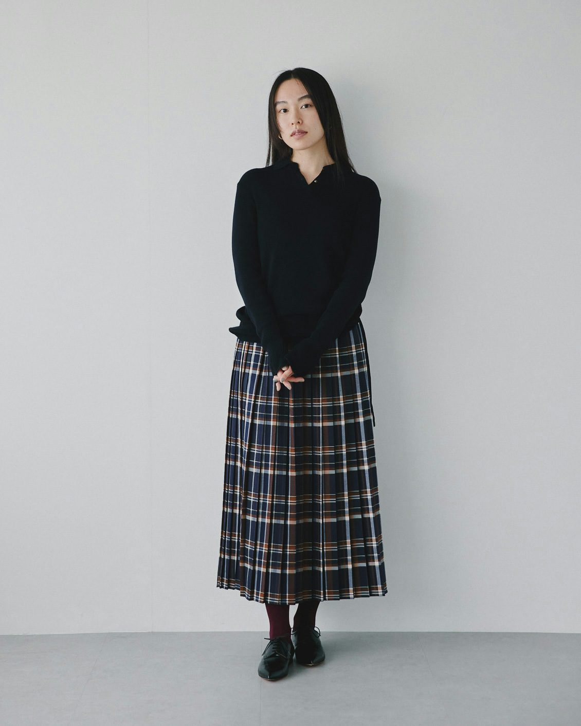 秋冬に履きたい靴との相性も抜群だから、落ち着いた雰囲気を纏ったまま、シックにチェック柄を楽しむことができるスカートです。