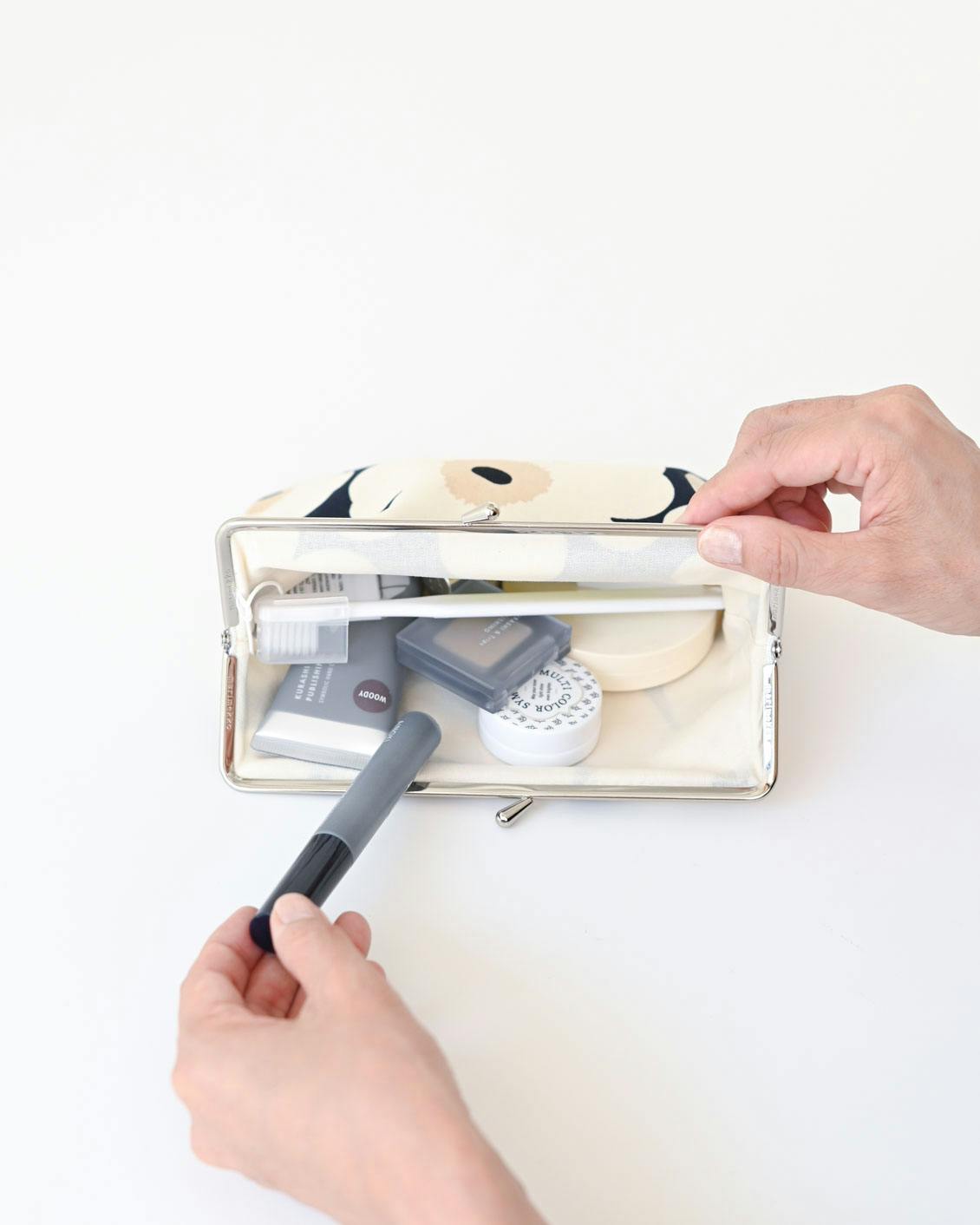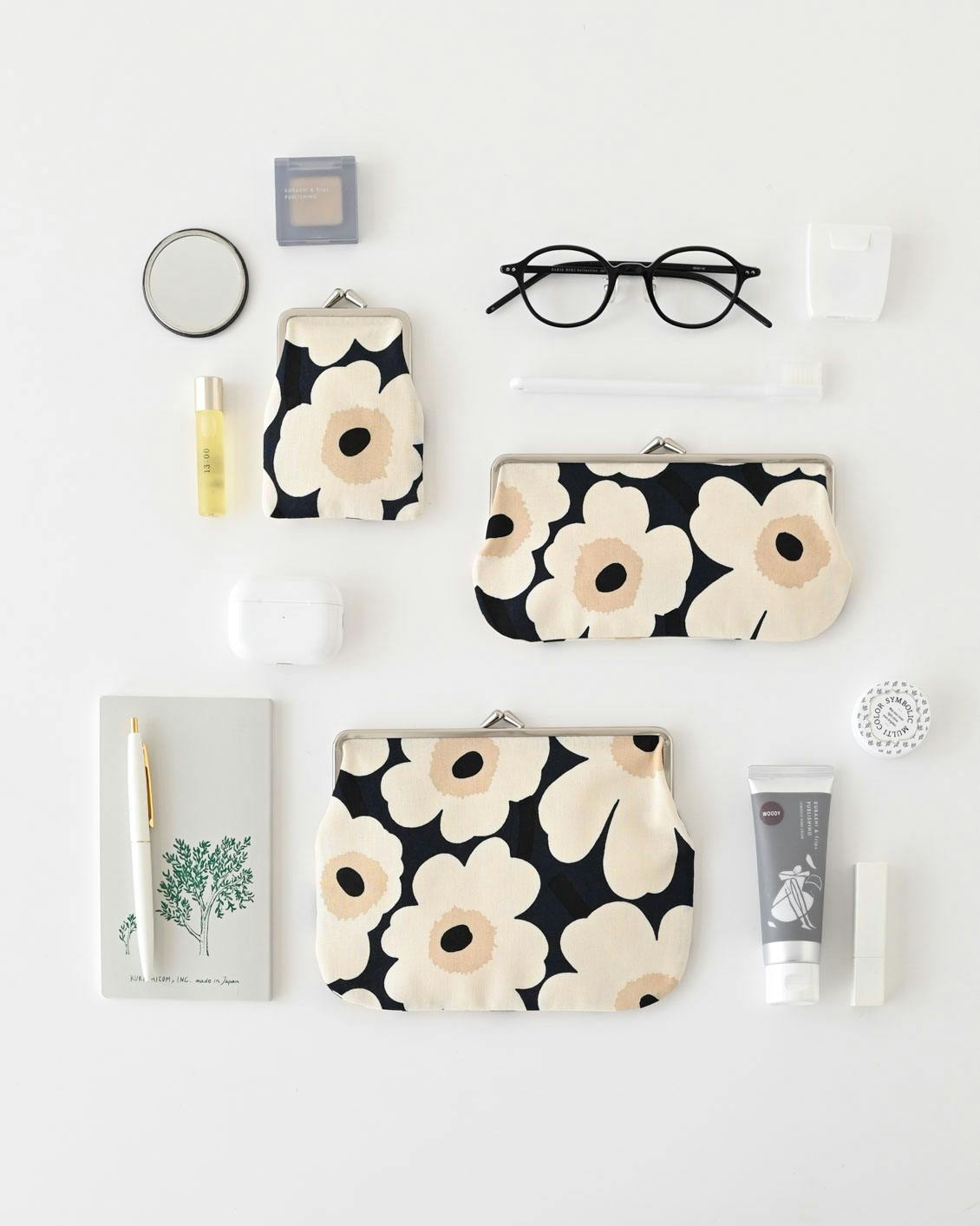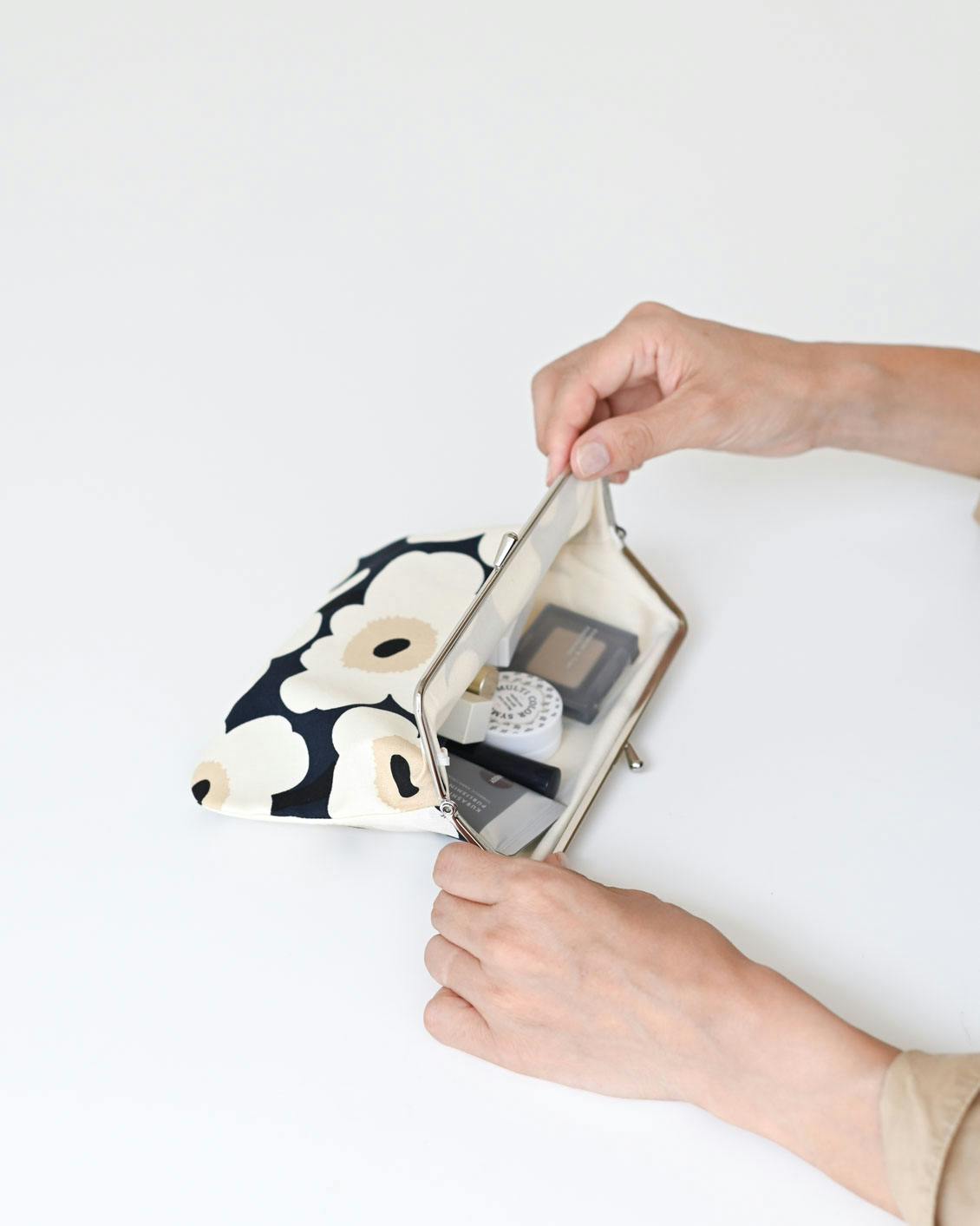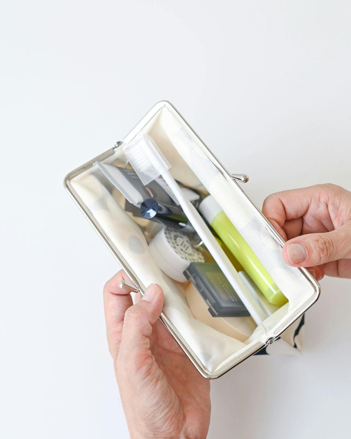 バッグの中でかさばらない、マチの薄いつくりですが、柔らかなコットン素材と大きく開くがま口のおかげで、収納力は見た目以上。