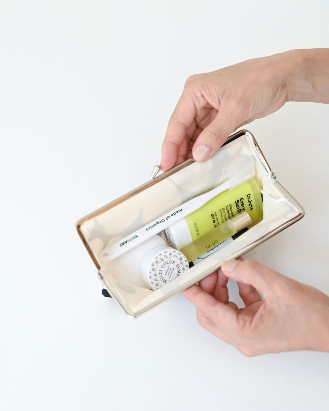 コンパクトながら口が大きく開くおかげで中が見渡しやすく、小さなものもワンタッチでサッと取り出せるのが大きな魅力。