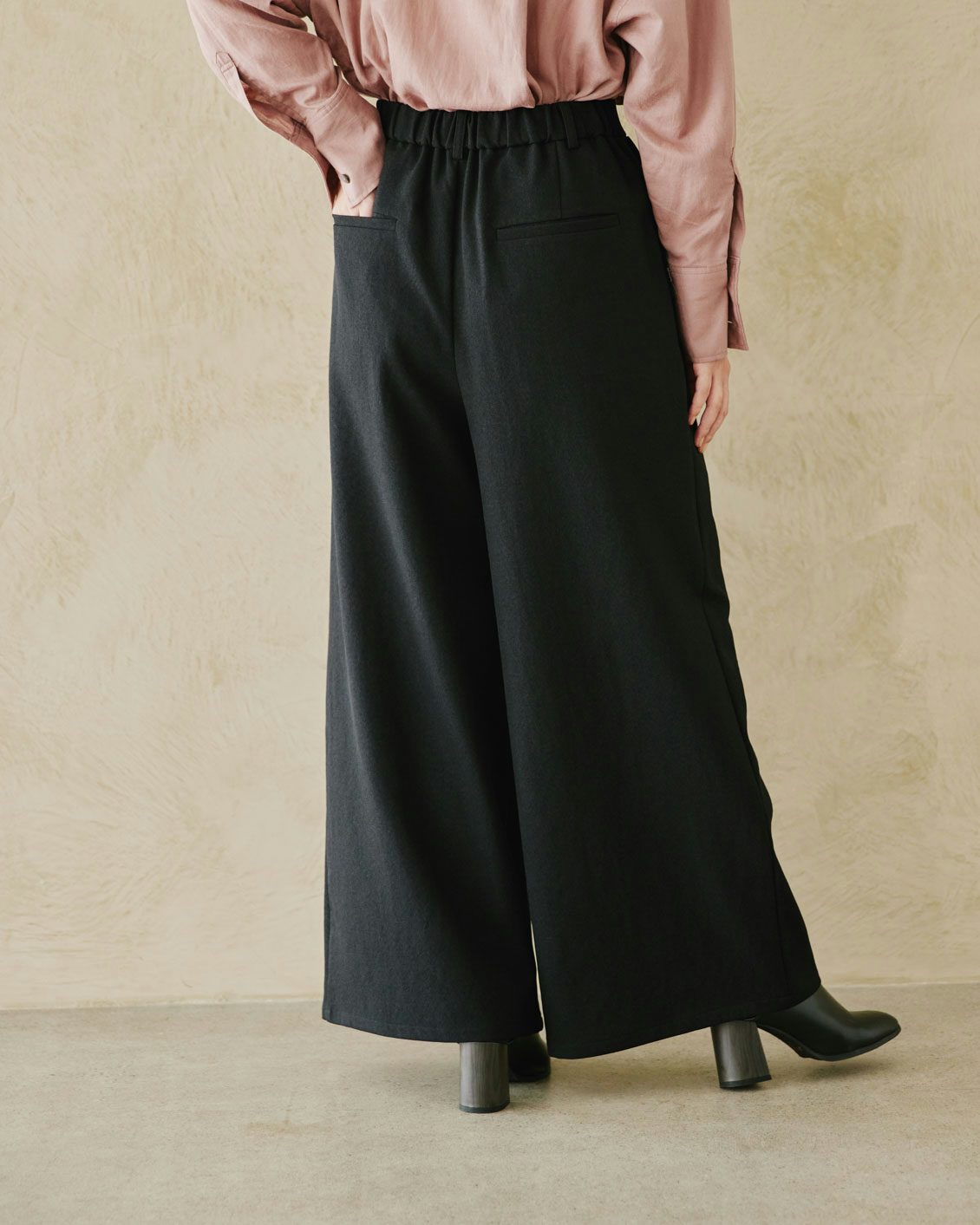 股上をたっぷり取り、ドレープ感のある生地が、気になるお尻まわりをゆるっと上手にカバー。それでいて、もたつかないよう調整しています。