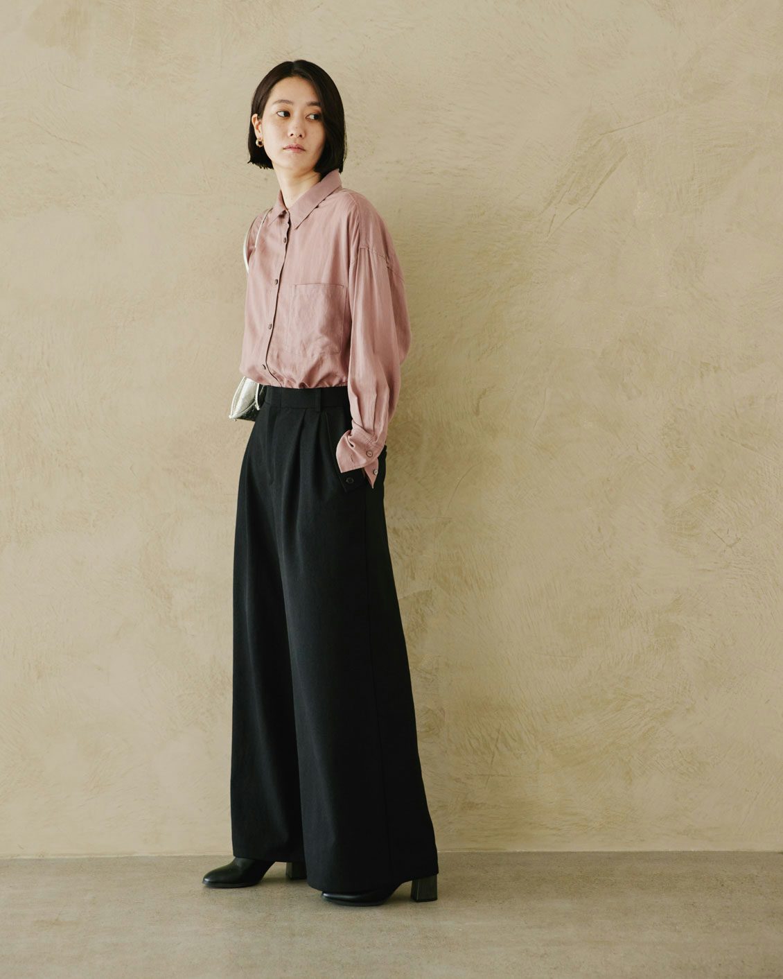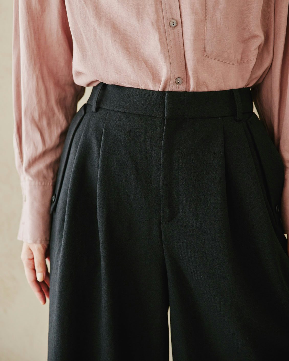 ワイドパンツらしい心地よさはそのまま、ウエストにタックを入れて「きちんと」感を両立させたのが、このパンツのミソ。