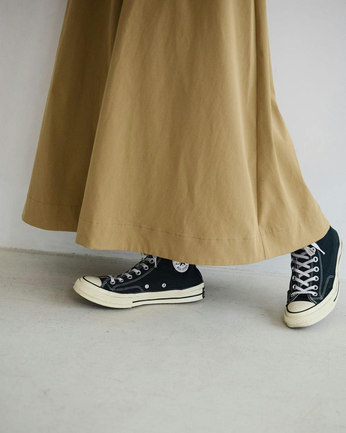 スニーカーやフラットシューズはもちろん、ブーツなどを合わせてもバランスが取りやすい長さに仕上げています。