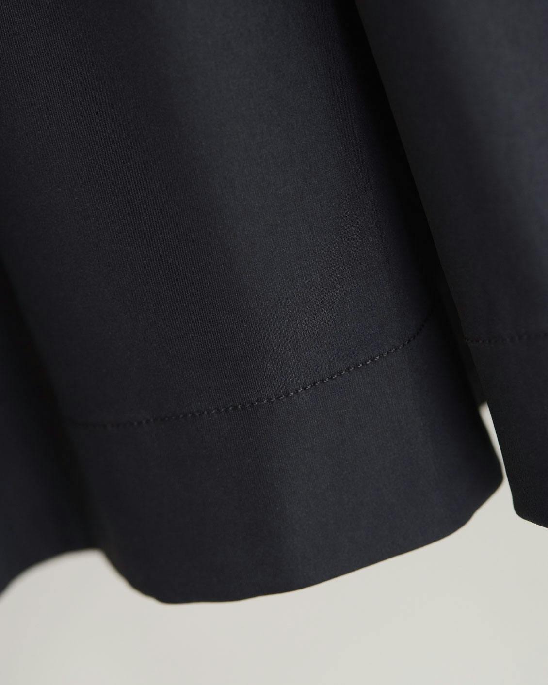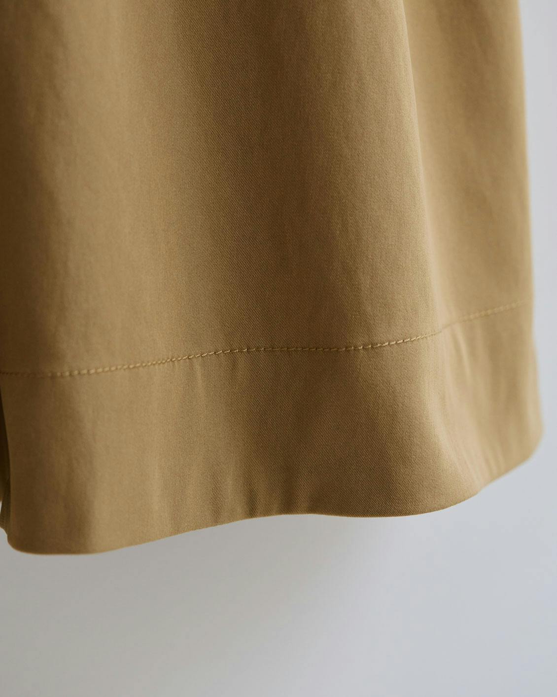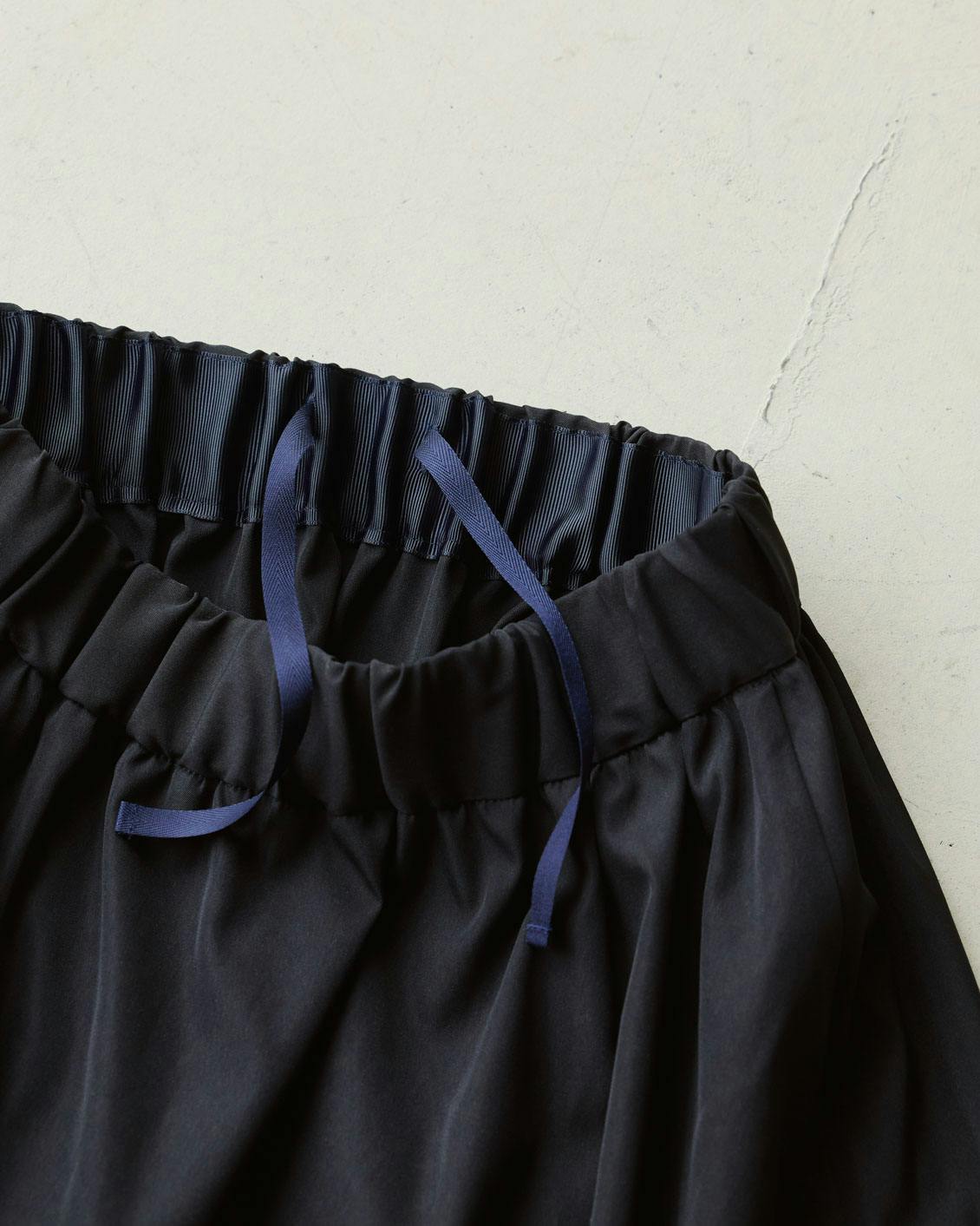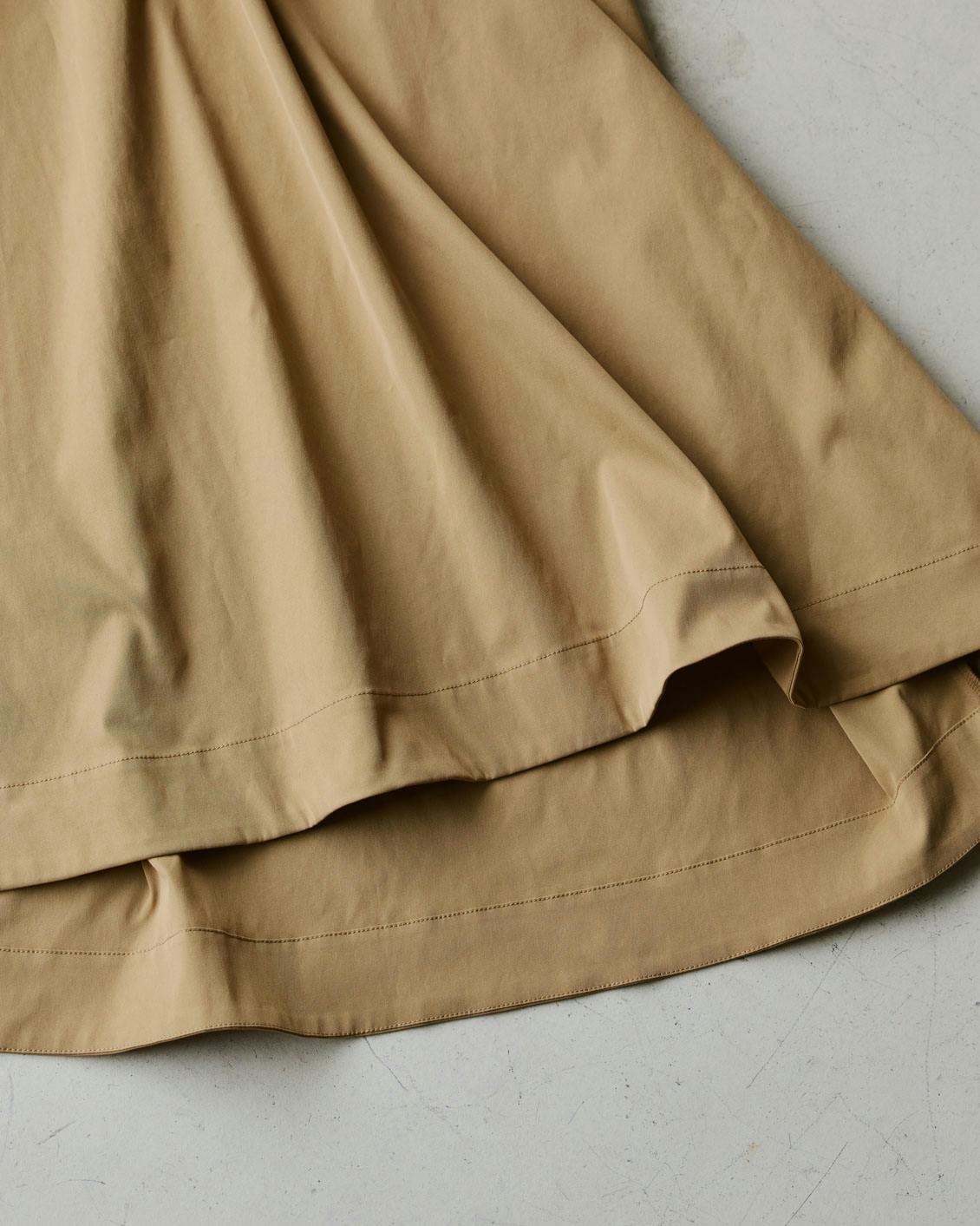 ほんのり光沢を帯びた高密度な生地は、シワになりにくく、スラッとしたAラインをキープ。