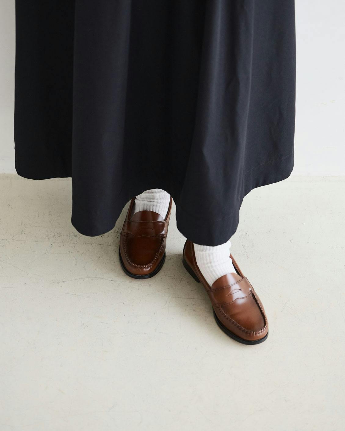 このハイカットが程よく見えて、靴下は歩いているときにちらっと見えるくらいの丈感。ちょっとした差し色など、自分なりのスパイスをきかせやすいものが好きなんです。