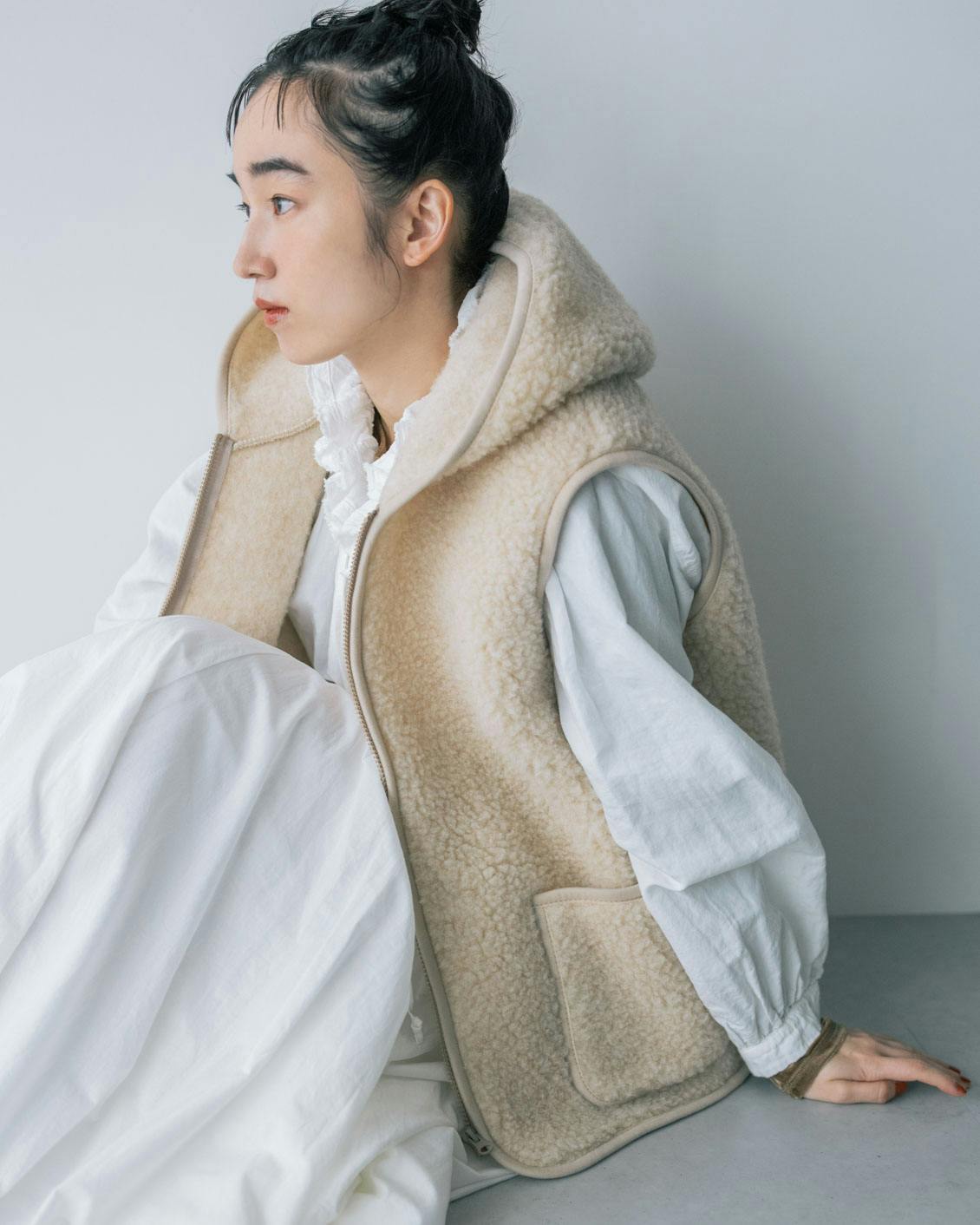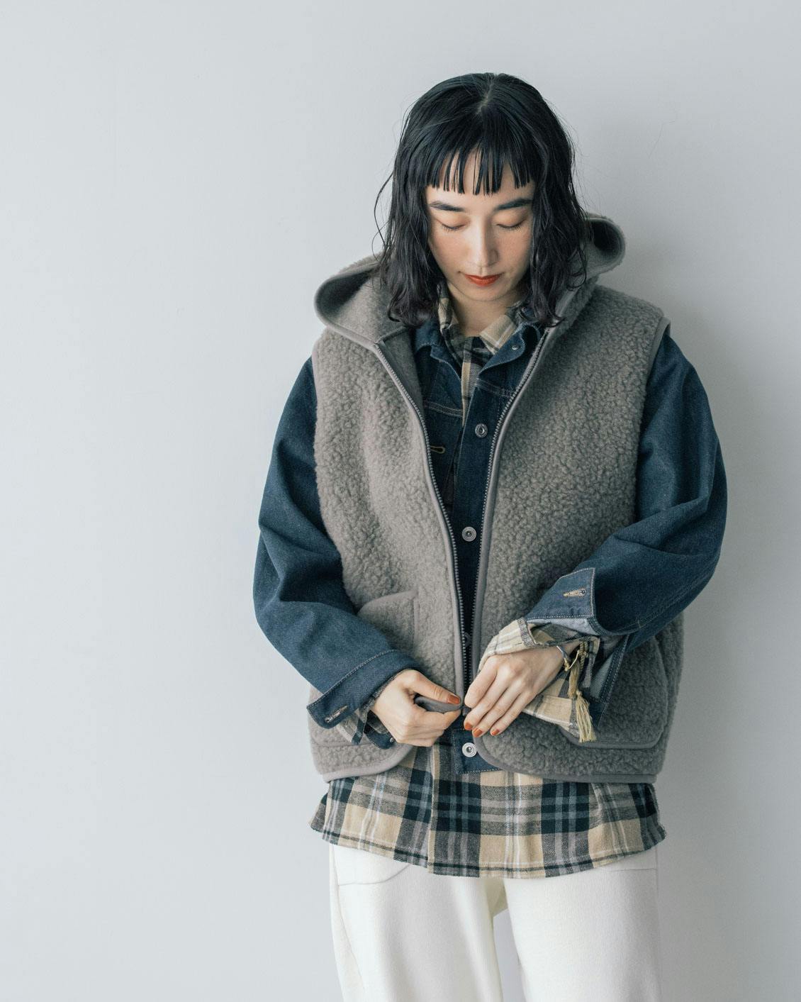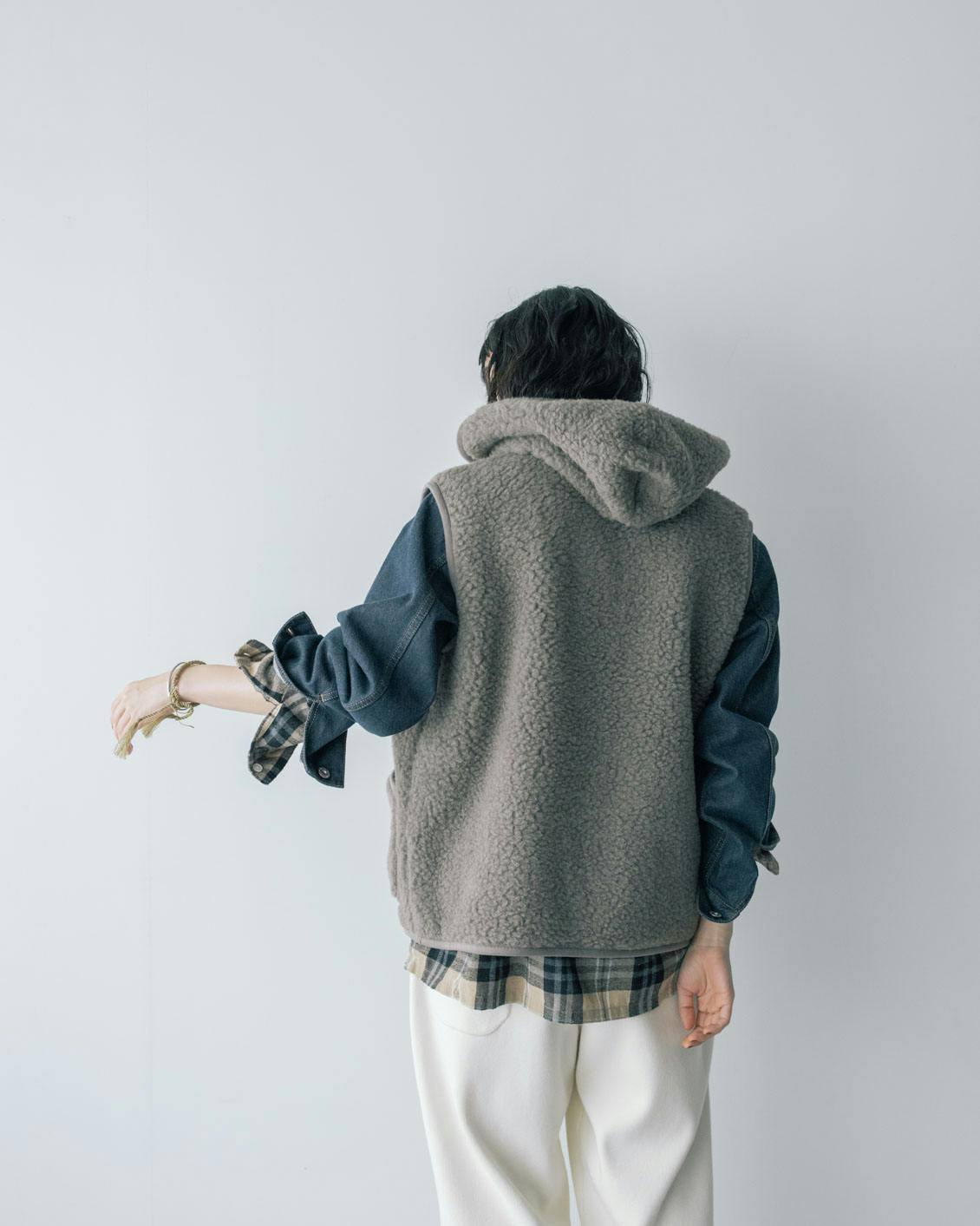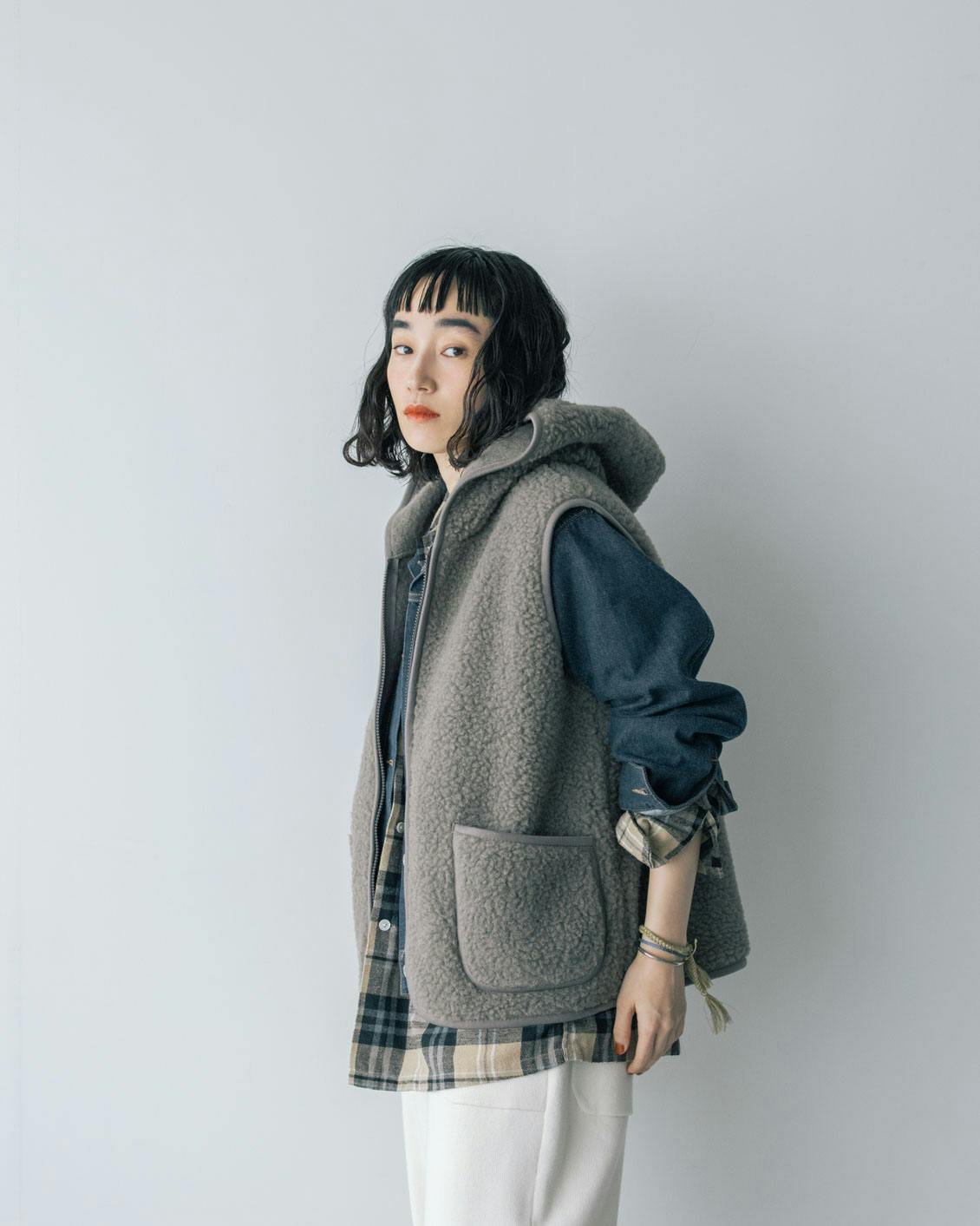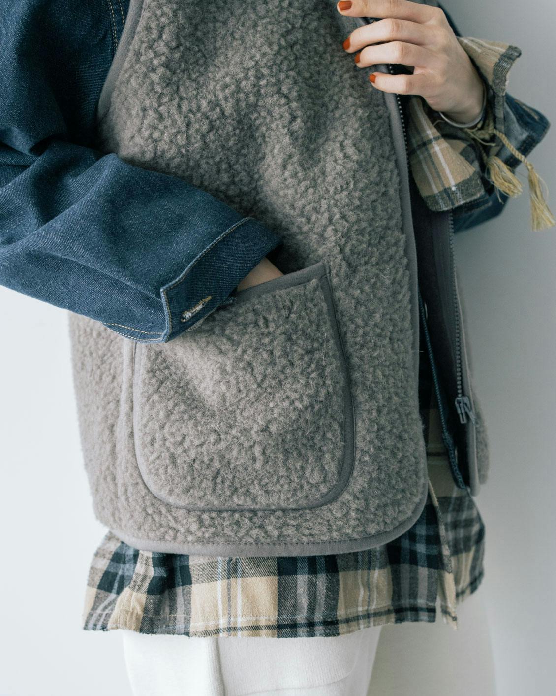 旬の異素材ミックスのレイヤードが楽しめるのも、ボアベストならでは。
