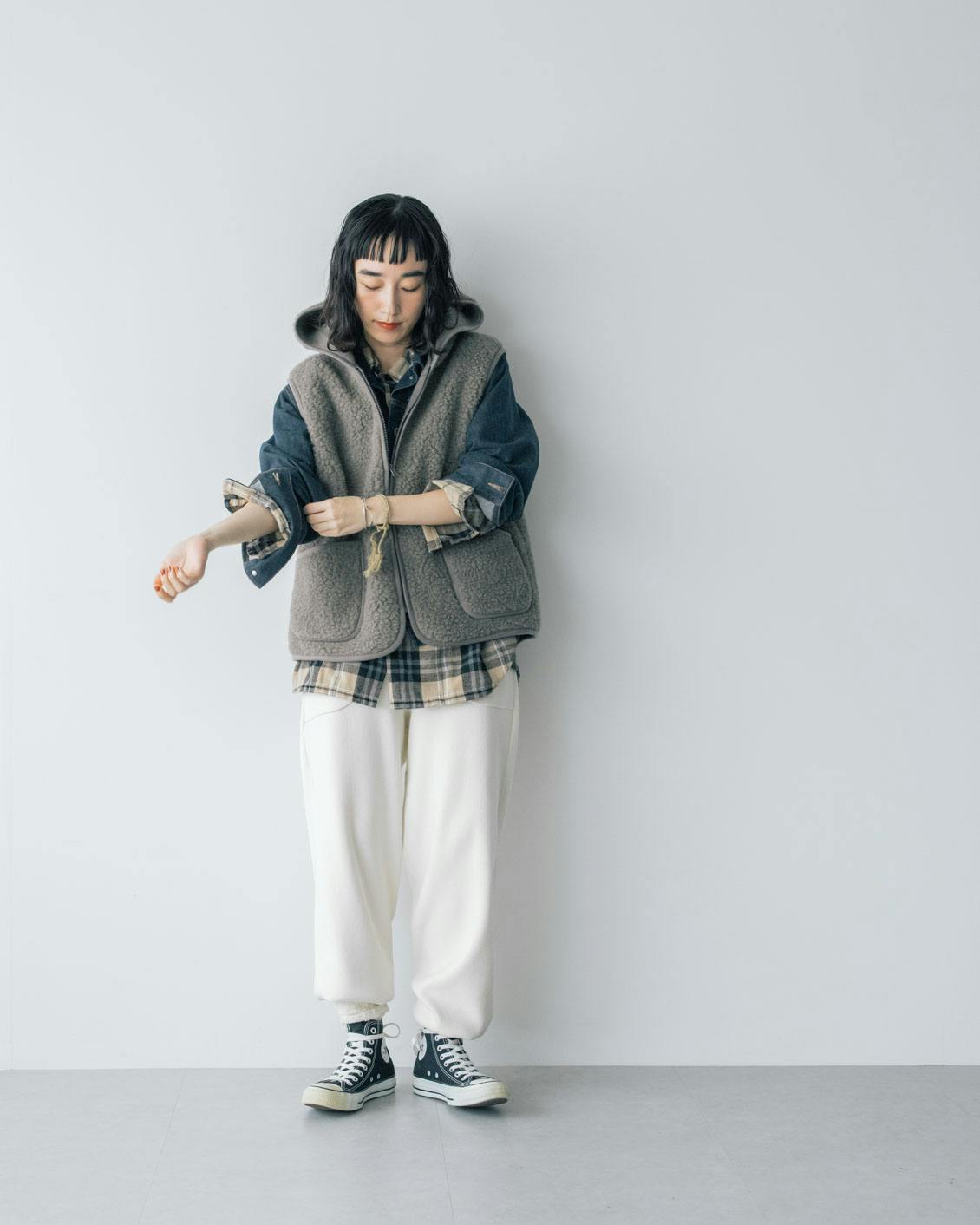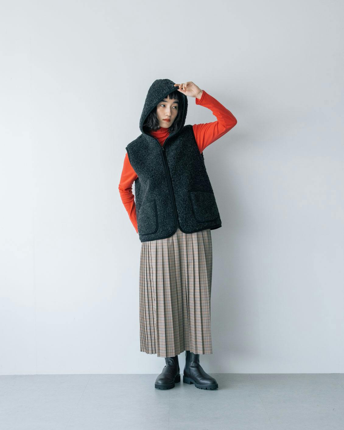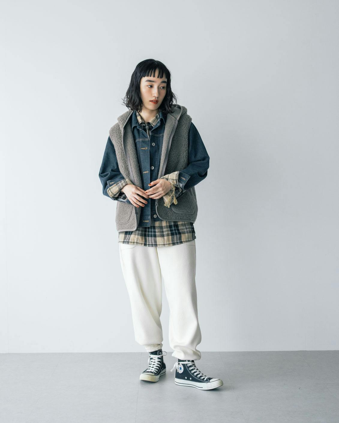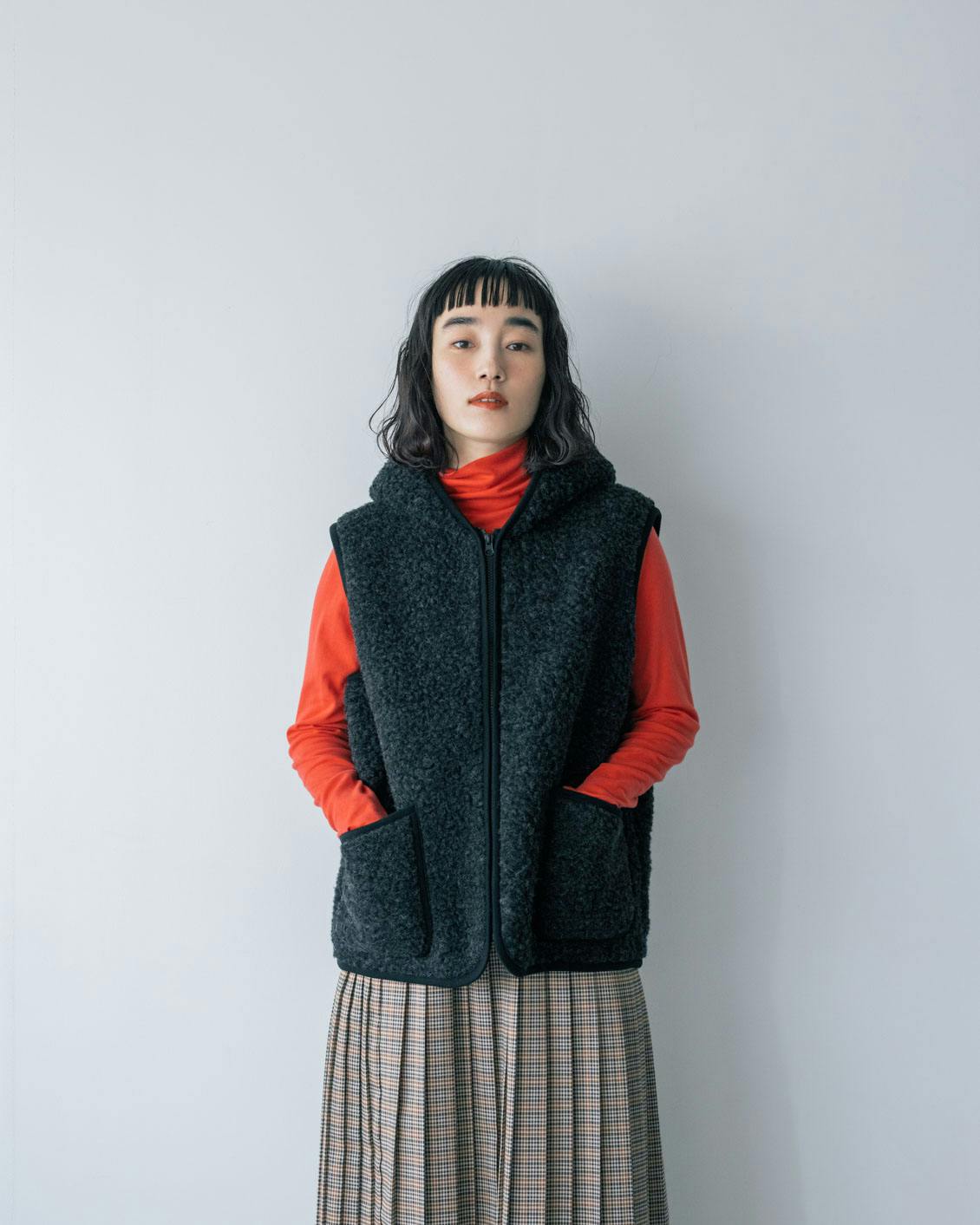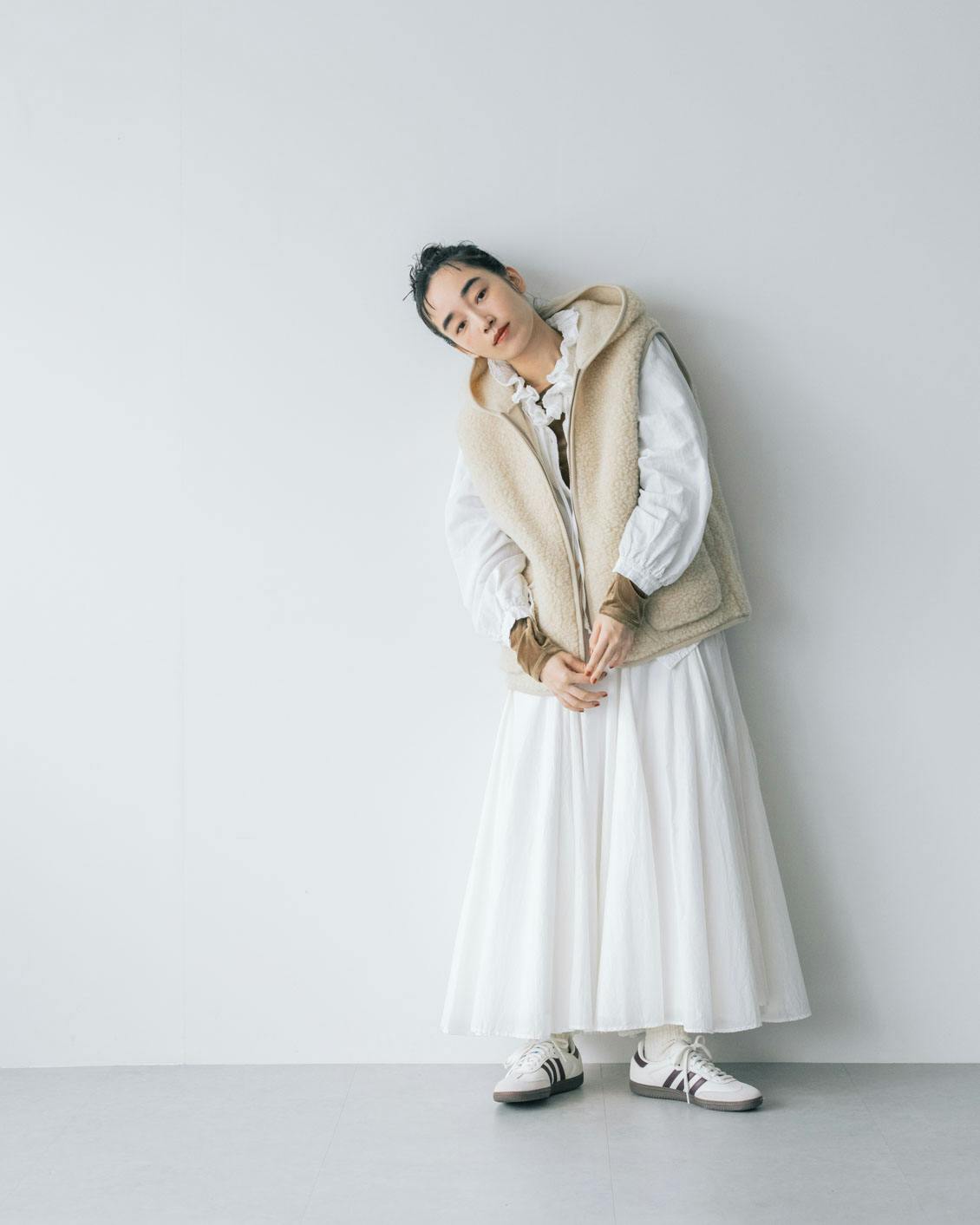 旬の異素材ミックスのレイヤードが楽しめるのも、ボアベストならでは。