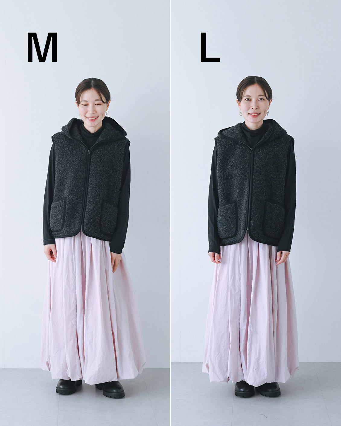 このベストは M・Lの2サイズ展開。推奨身長は以下の通りですが、いずれもゆったりサイズなのでお好みのシルエットで選んでいただいても。