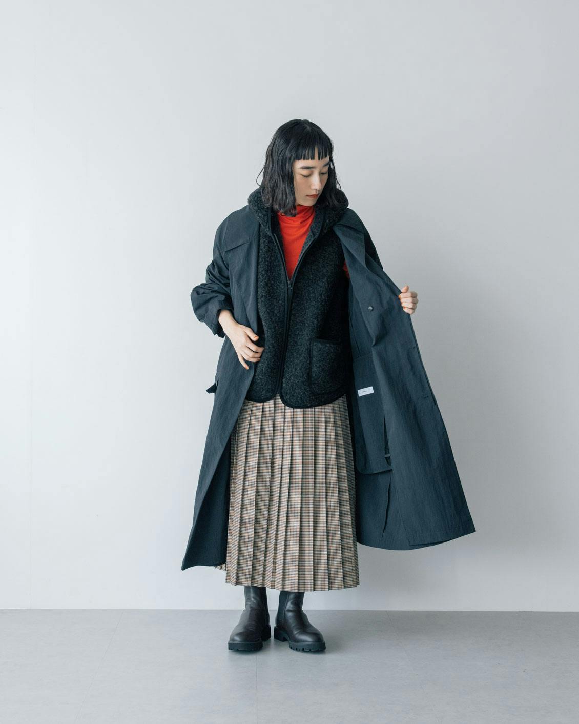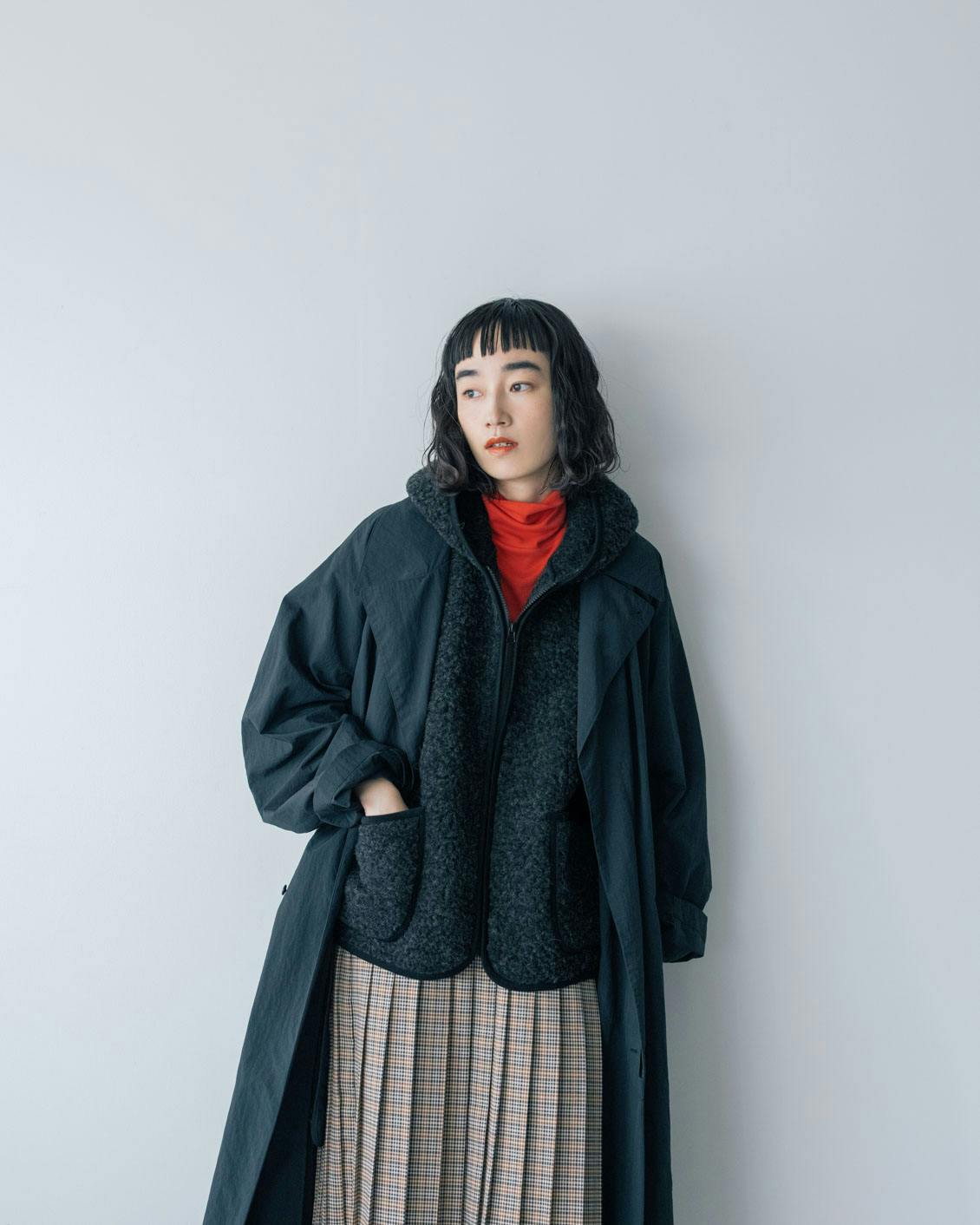 フロントはジップ仕様なので、インナーの襟元に合わせて開き具合を調整して。秋冬ならではのおしゃれをぜひお楽しみくださいね。