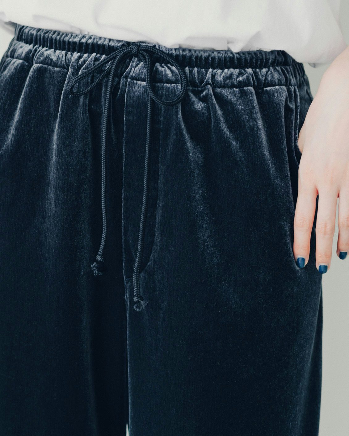 華のあるベロアのアイテムでも非日常な装いになりすぎないよう、工夫したディテールです。