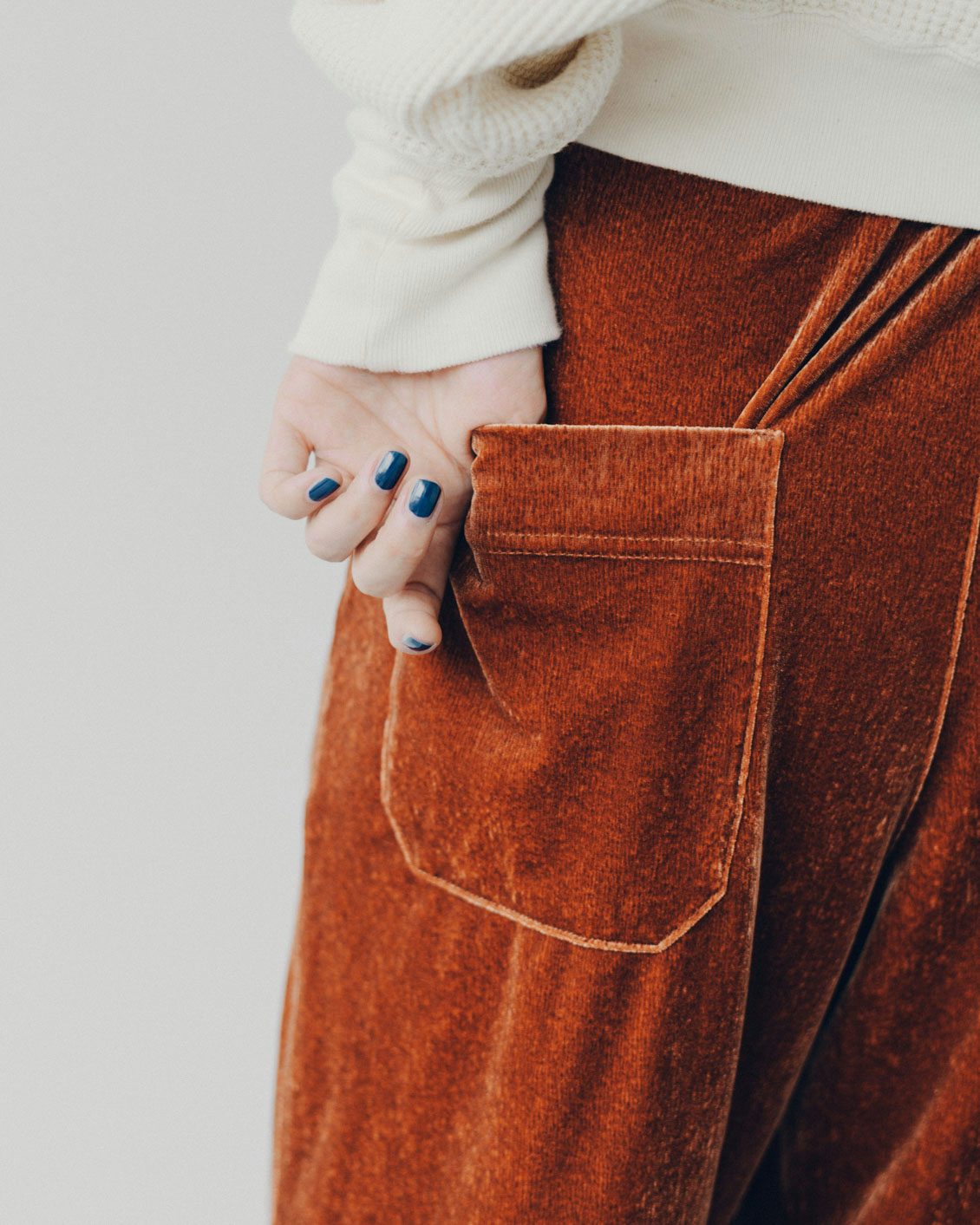 生地とシルエットの掛け合わせで、「カジュアルさ」と「上品さ」のバランスを追求。「これならはける!」と思えるベロアパンツができました。