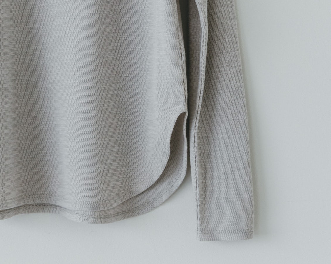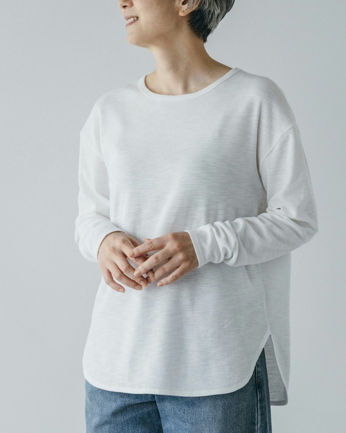 ワッフル素材よりも薄手で、ボトムスにインしやすいのもうれしいポイント。