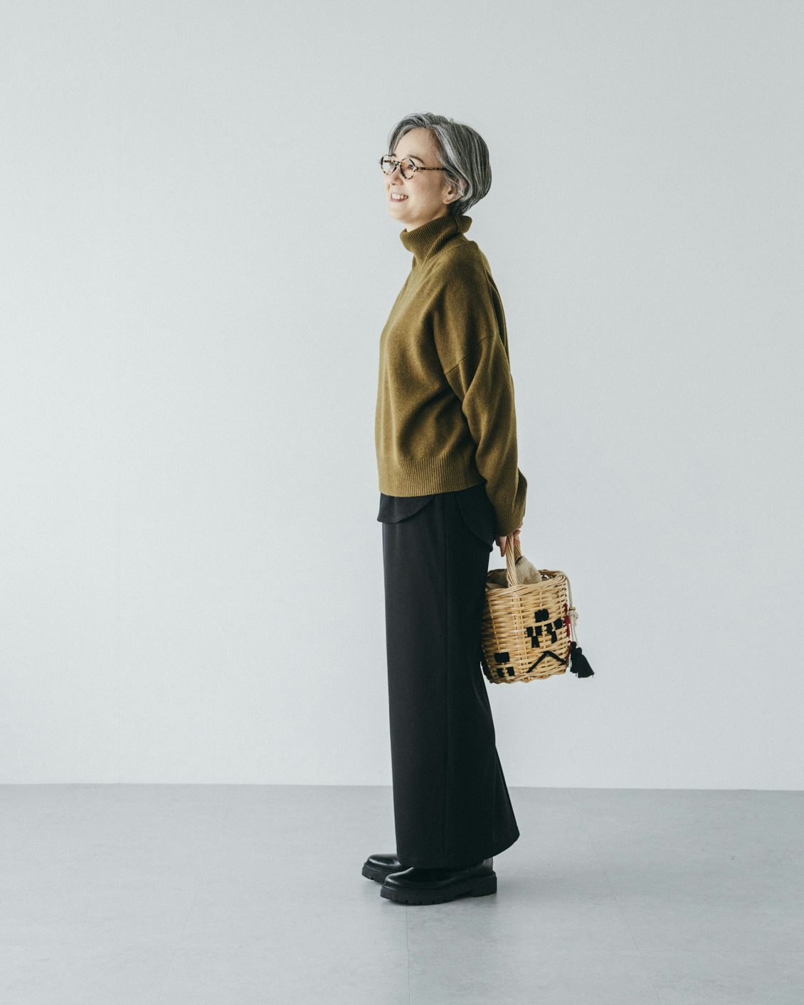 厚手のニットの下から裾を出せば、一気に今っぽい着こなしに。