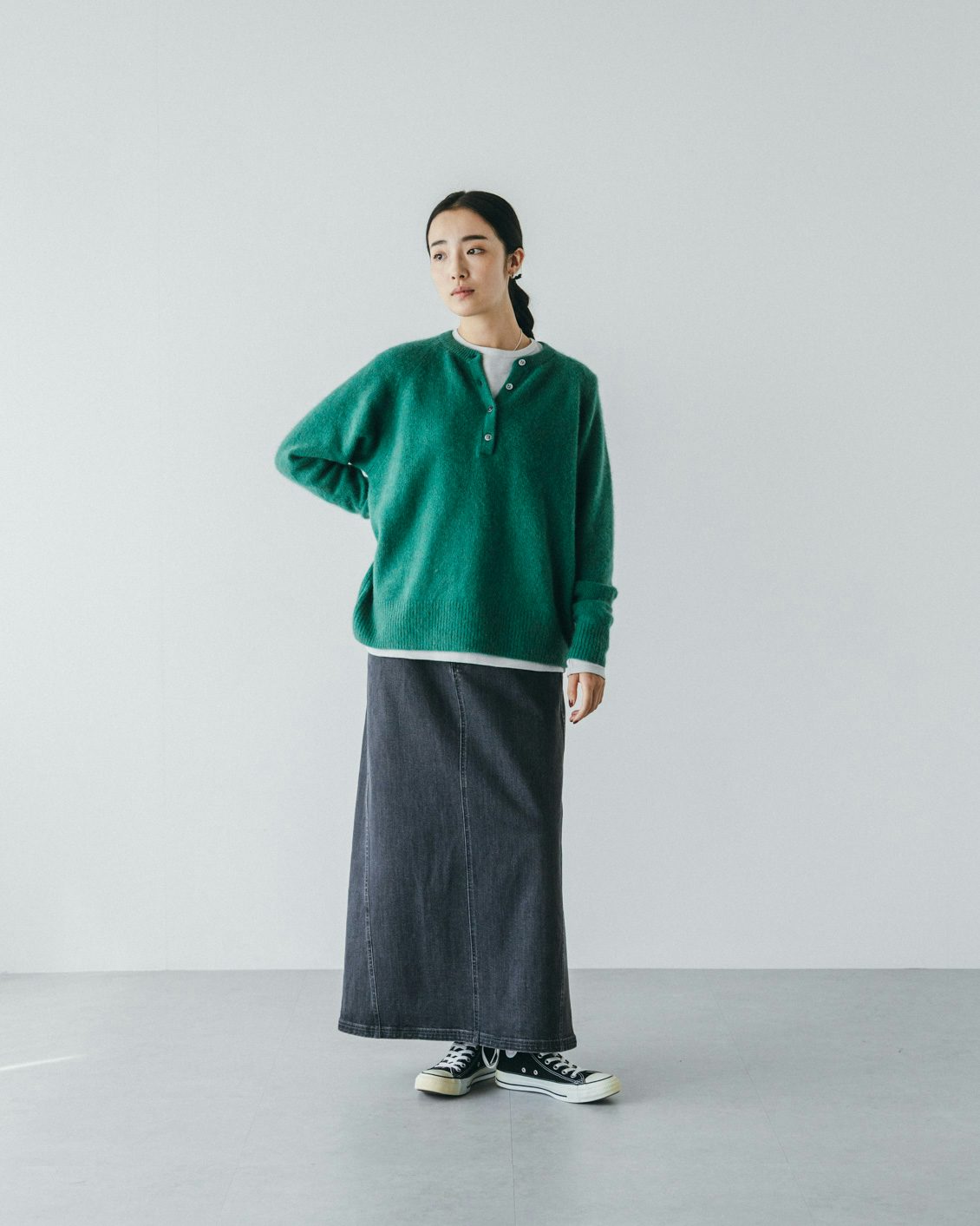 ゆるっと身幅のあるニットや、短め丈のトップスにあわせると、シャツを重ねたような印象に。