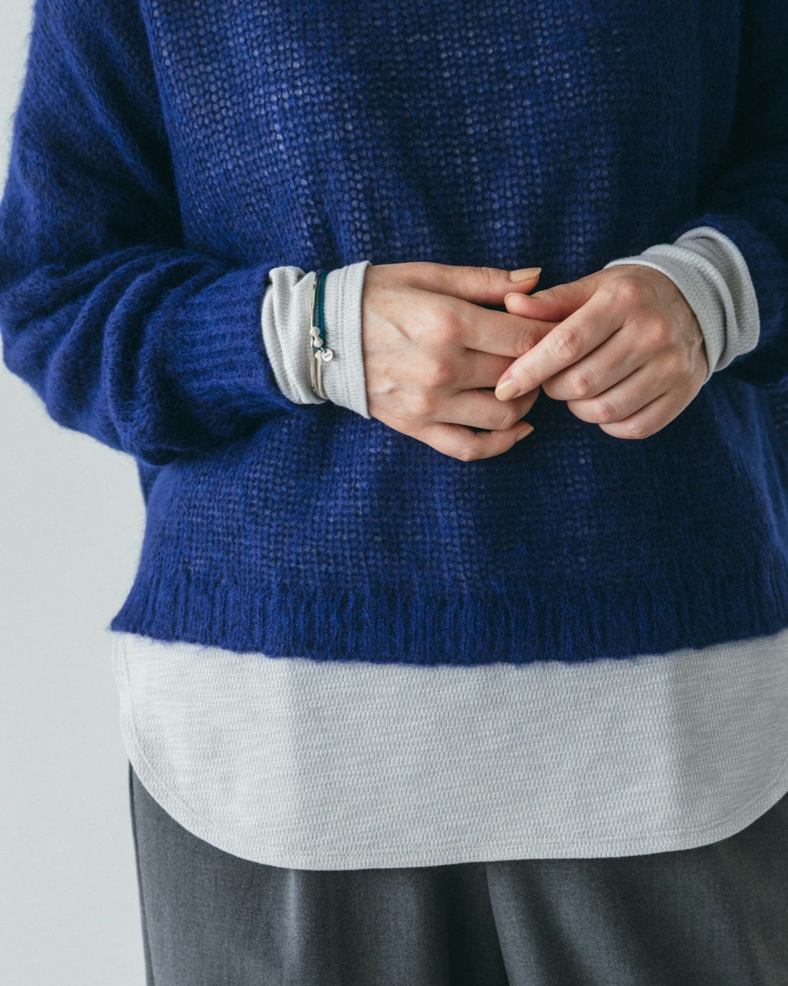 実はこれ、オリジナルで開発した特別な生地。「ハチの巣」のような六角形の凹凸のある編み目が、ちらっと見えたときにさりげないアクセントになり、1枚で着たときものっぺりとしないんです。