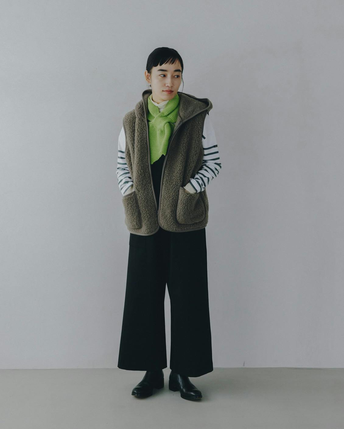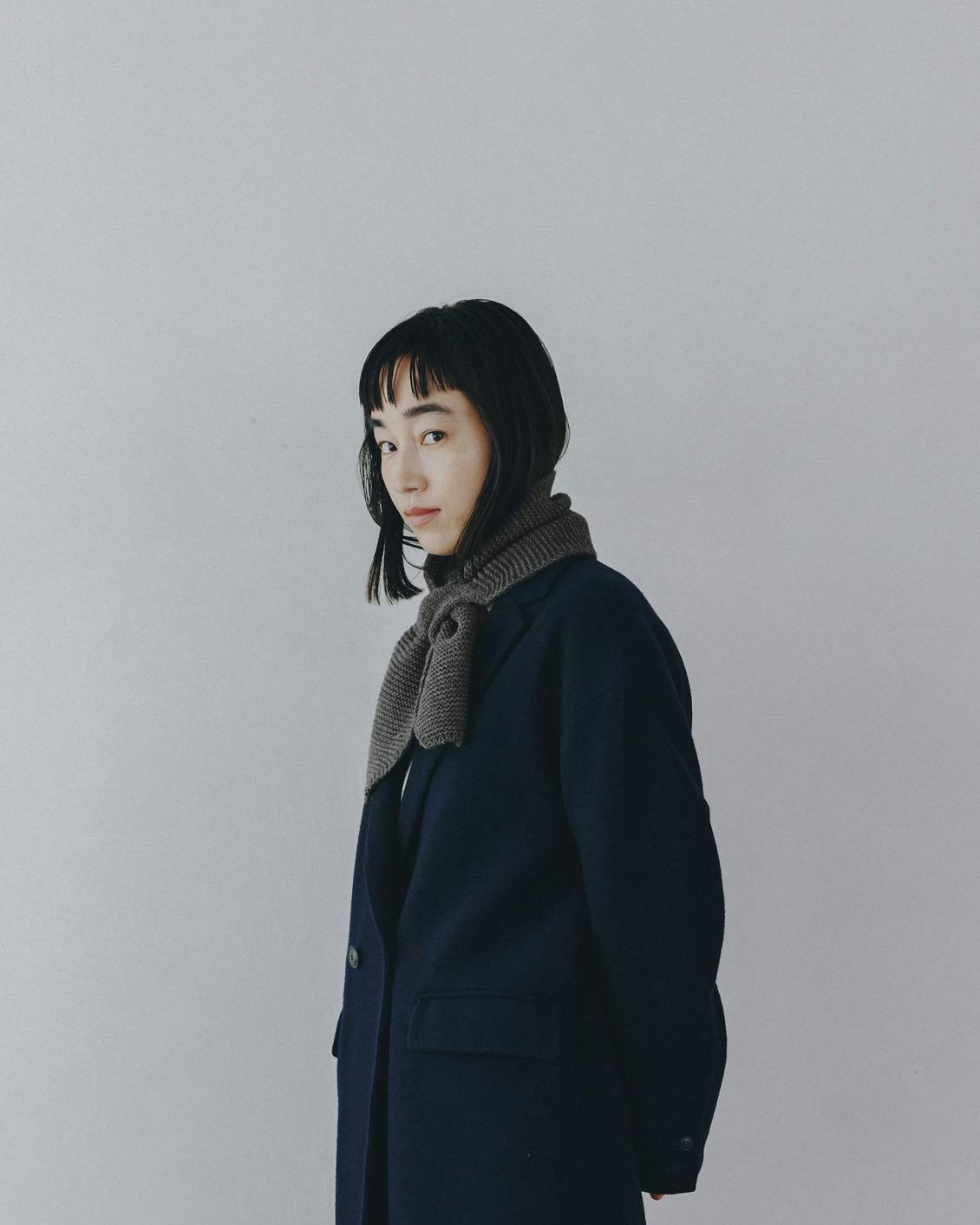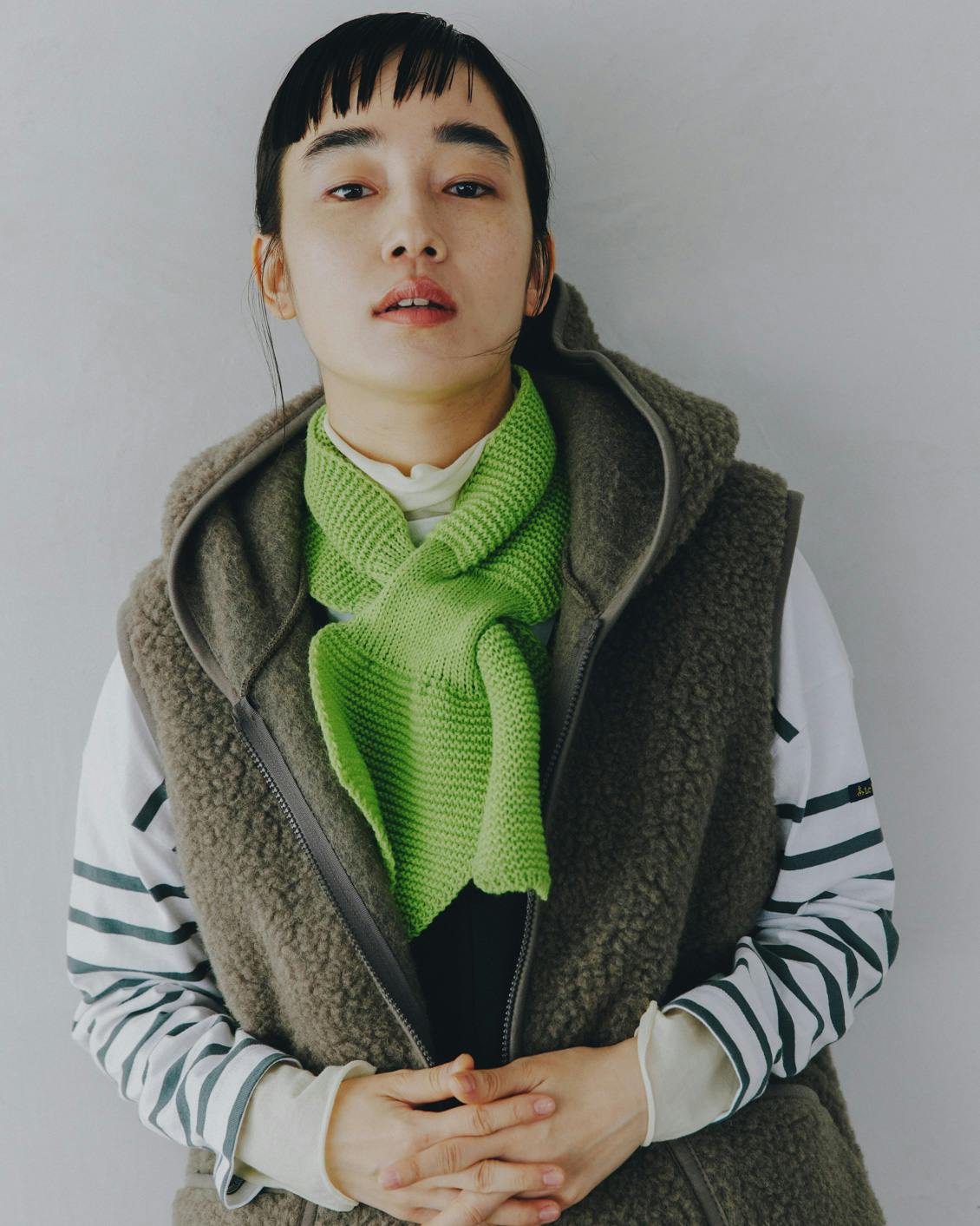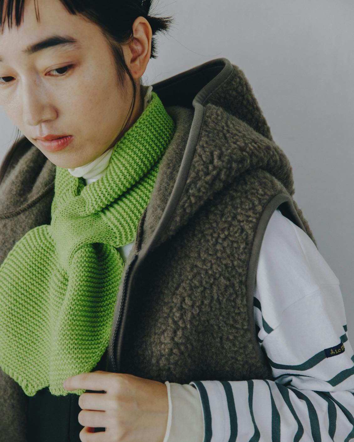 襟の中に入れてみたり、アレンジがたくさん効く、使い勝手のいいマフラー。