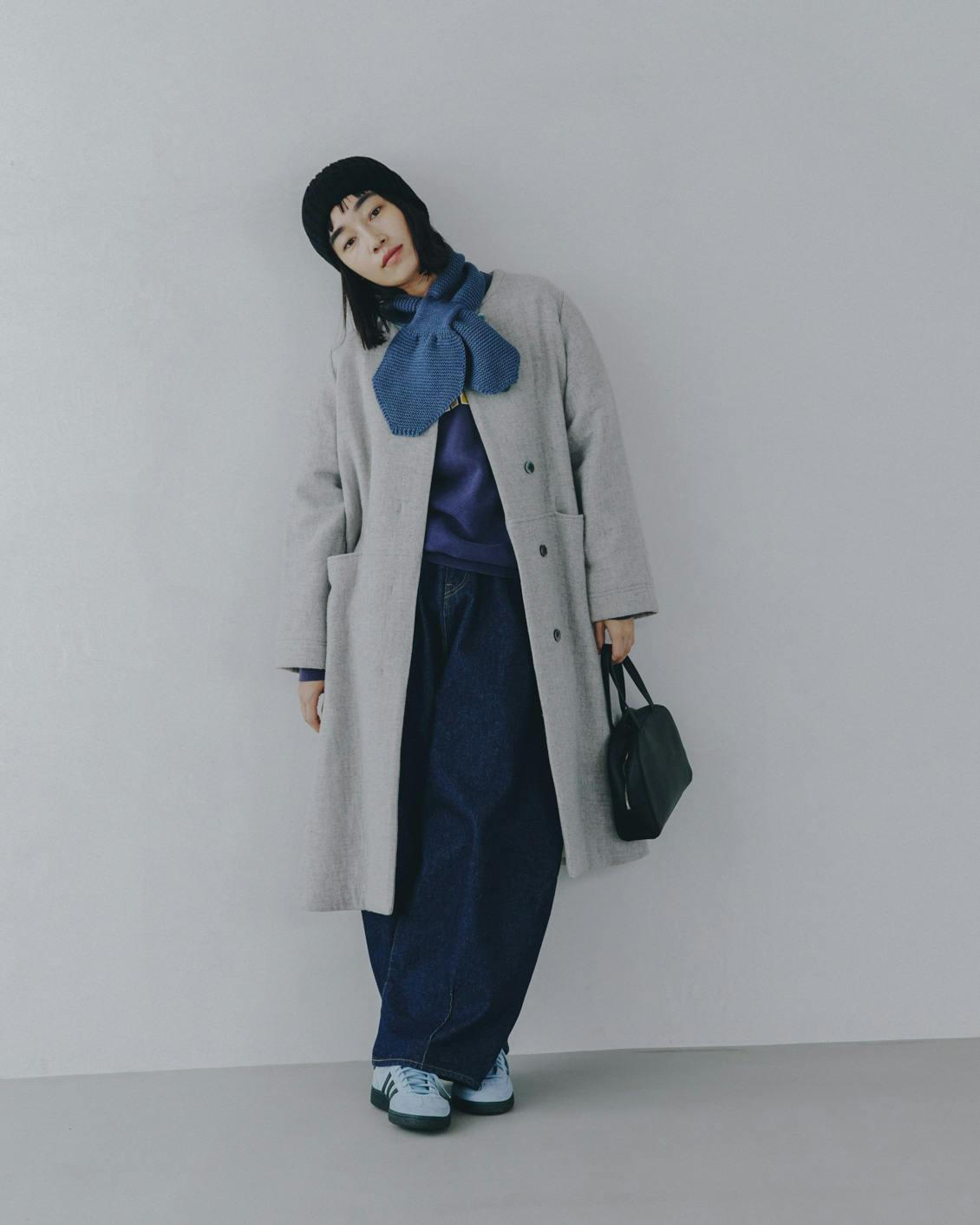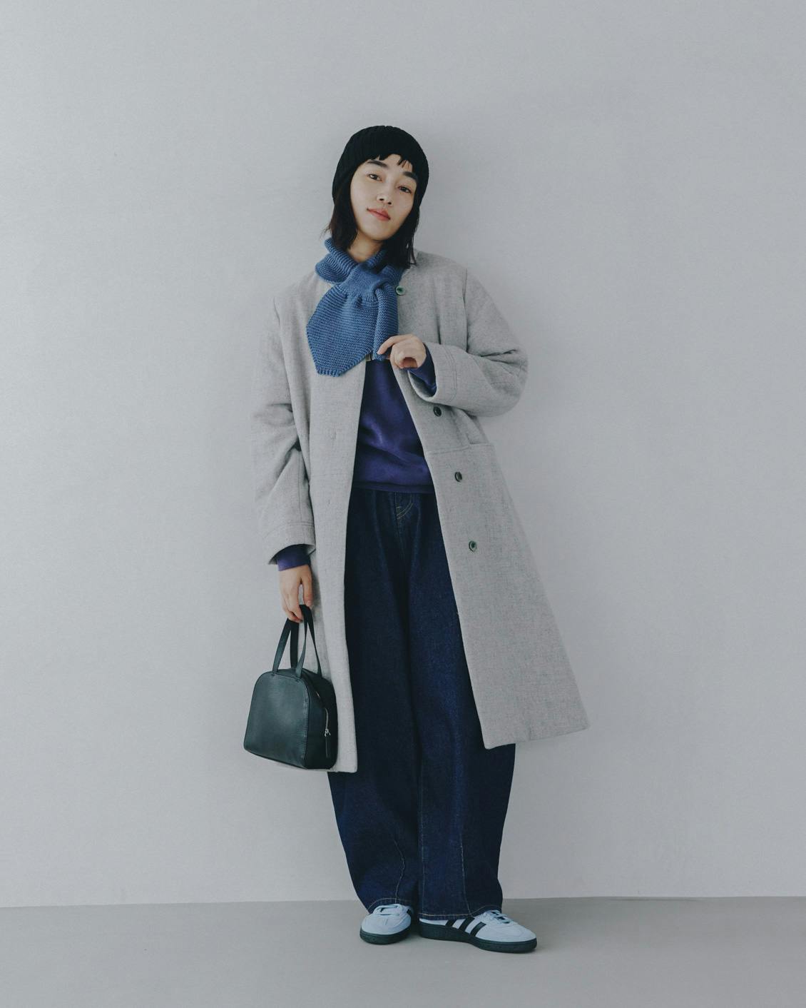 ノーカラーのコートでちょっぴり首元が冷えるとき、手元にこんなマフラーがあると安心ですね。