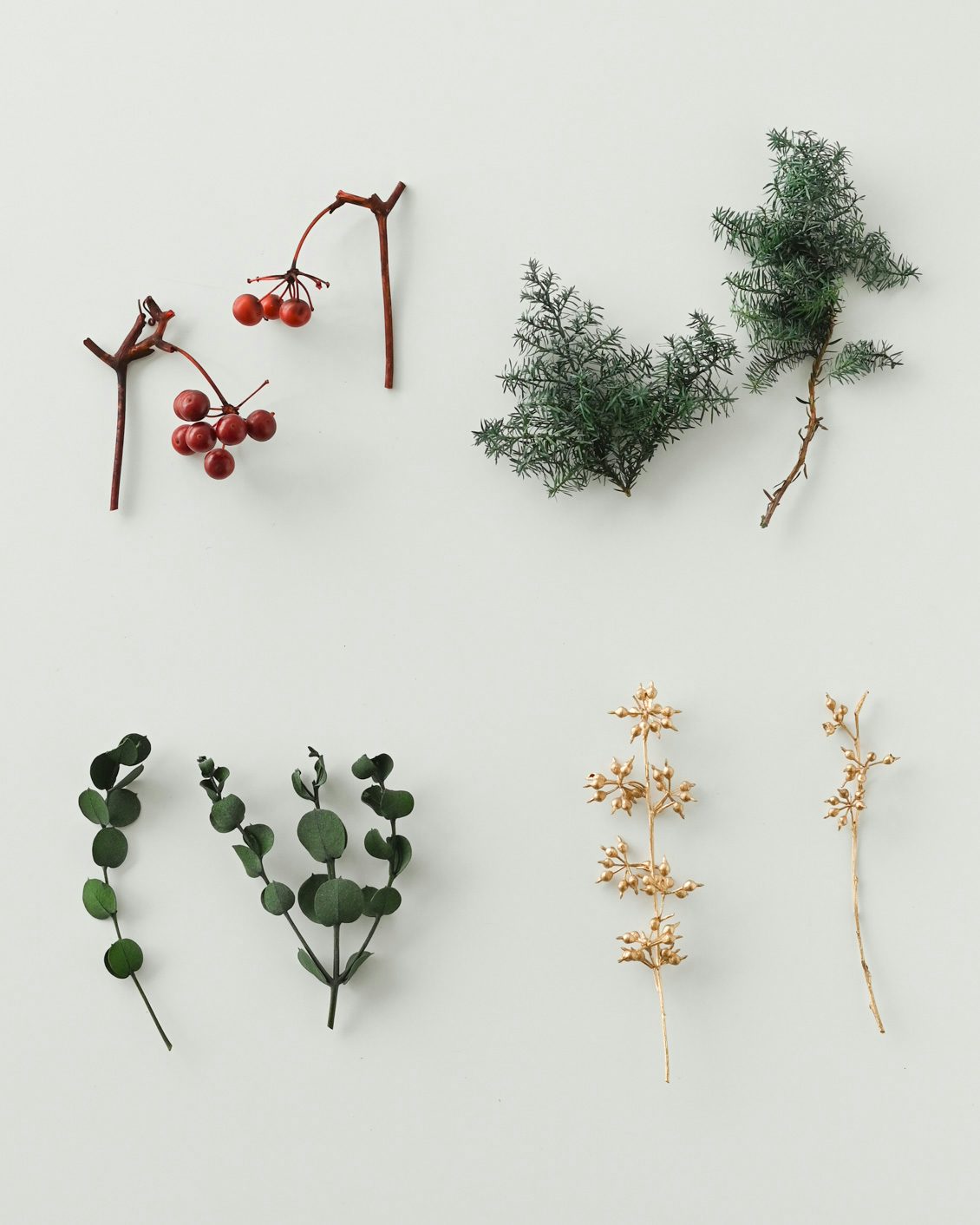 ▲ワイヤーの下から時計回りに、フラワーコーン、ヒイラギ、ヒムロスギ、サンキライの実、ユーカリエキゾチカ、グニーユーカリ、ブルーアイス
