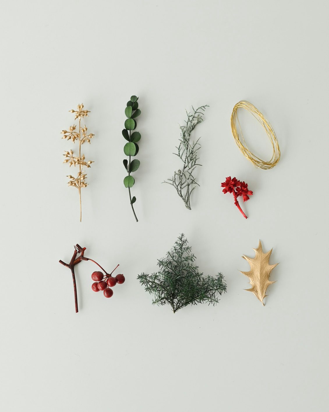 | 素材 | ヒムロスギ、ブルーアイス、グニーユーカリ、ヒイラギ、ユーカリ・エキゾチカ、サンキライの実、フラワーコーン、リースワイヤー |